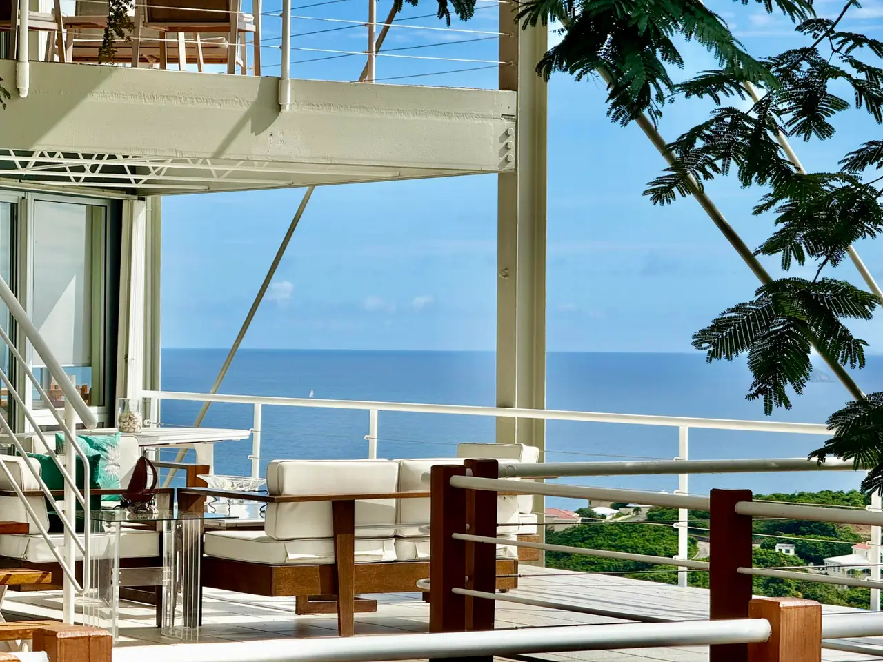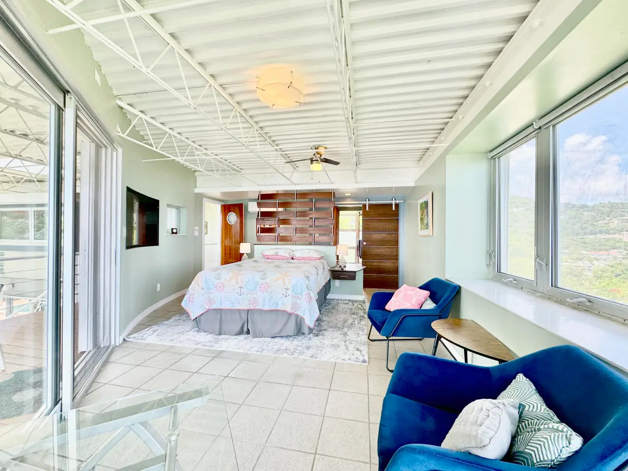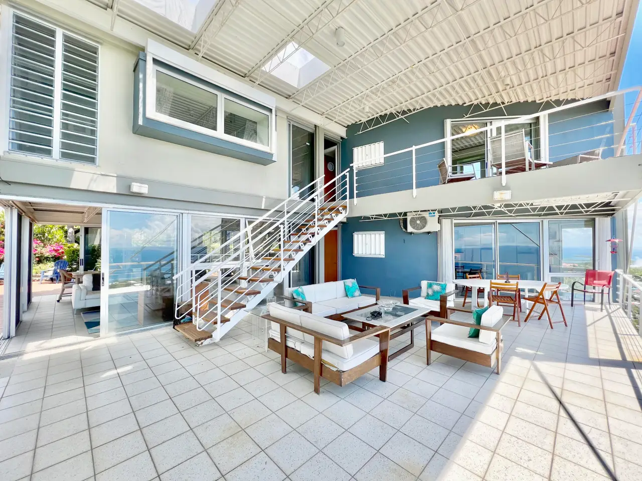 Sandbank is a beautiful contemporary architectural 5-Bedrooms 4-Baths home that sits on a 1.04 acre hilltop corner lot overlooking the Caribbean Sea with wide ocean views going from St James Island all the way to Puerto Rico. The main house is a 4 bed 3 baths (1 bedroom currently used as an office), and a 1 bed 1 bath apt. with its own driveway. Focusing on steel frame and glass, the home was designed by William Lane, architect of many landmarks in Florida, including the Miami Beach iconic Life Guard Towers. The property has an amazing covered deck with mesmerizing views and a large uncovered outdoor space with a nice size swimming pool and outdoor shower. Equipped with Solar panels, 2 Tesla batteries and a generator. Truly a one of a kind and perfect for family use or investment property