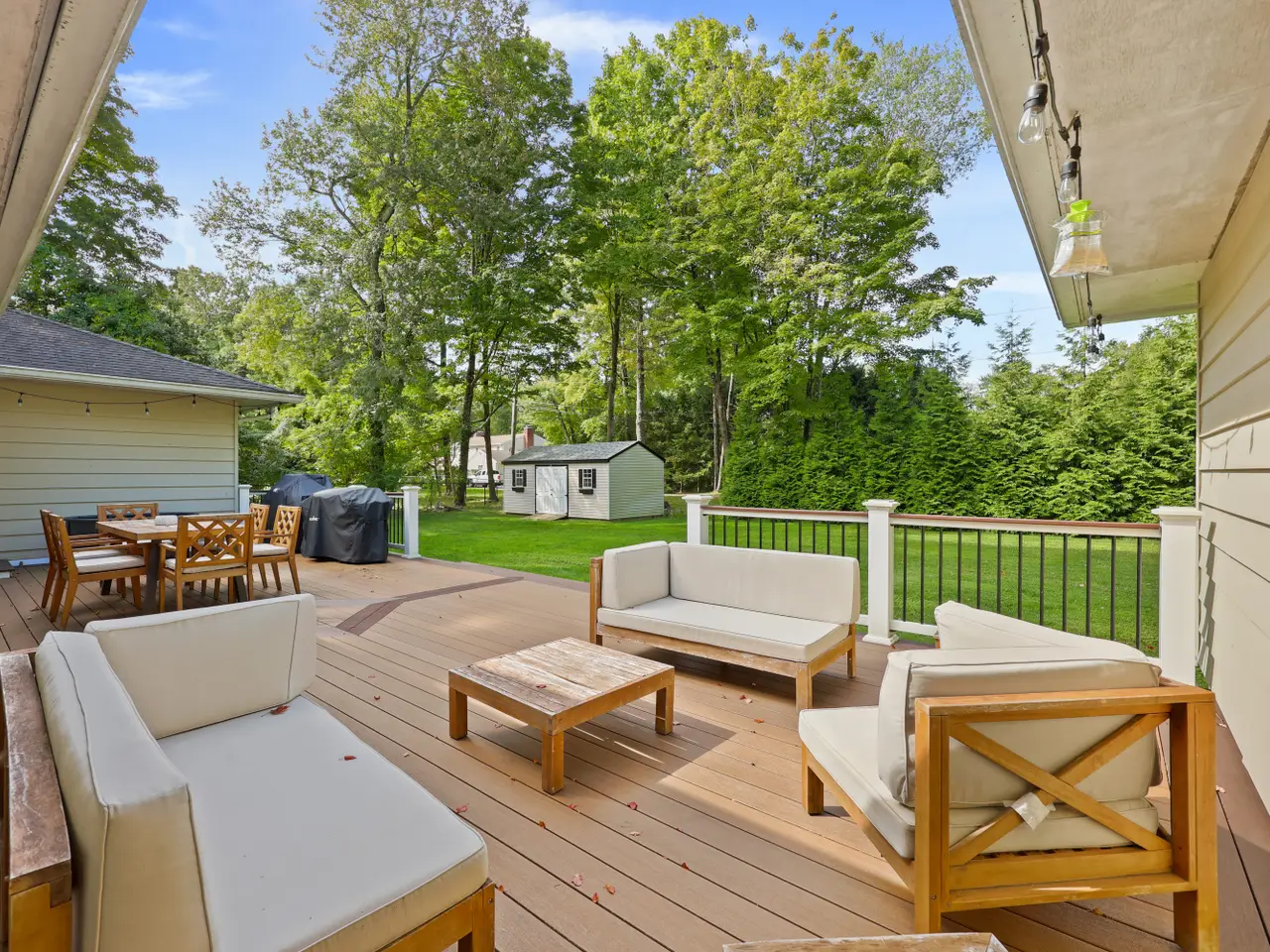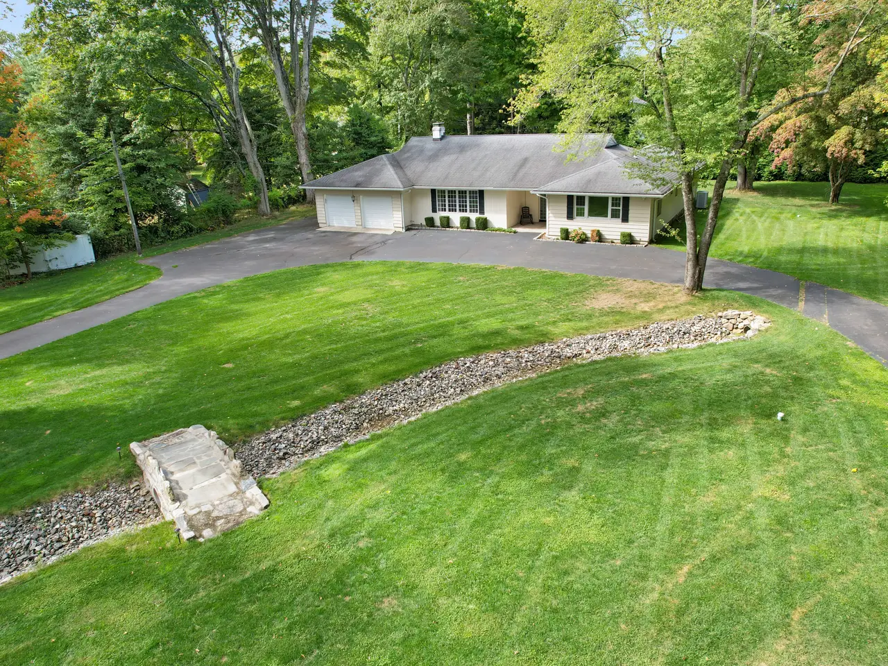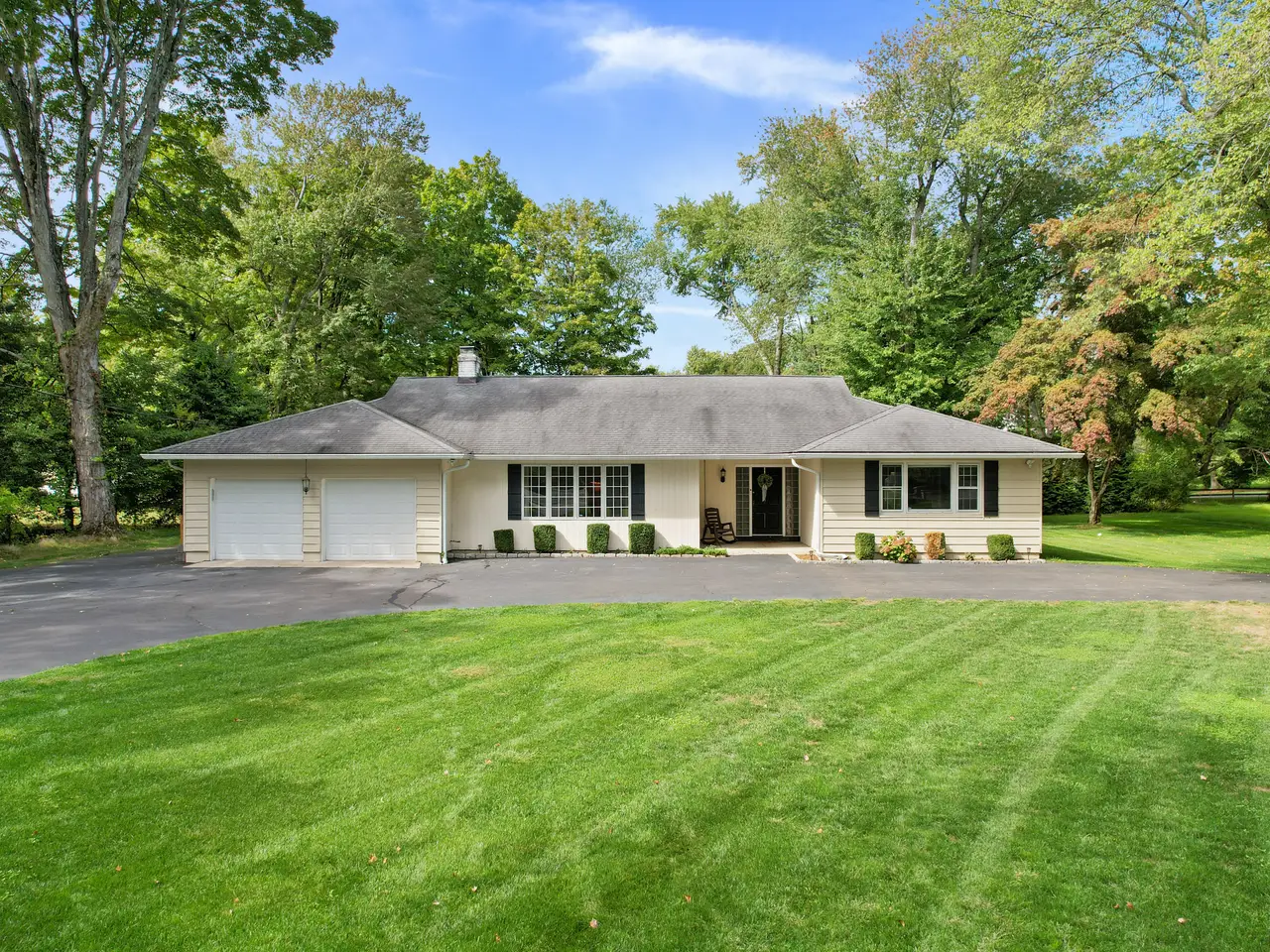 This inviting 4-bedroom ranch sits on one level acre in a great location. Wraparound driveway leads to a welcoming foyer and huge family room with fireplace, play area and two seating areas. Primary suite with walk-in closet and en-suite bath; as well as two large bedrooms and a full bath on one side of the house. Dining room with bar and kitchen leads to large Azek deck, ideal for outdoor entertaining. Separate guest suite with full bath would make a great in-law or nanny suite. Laundry room, mudroom and attached 2-car garage. Updates include newer landscaping and freshly painted interiors. HVAC, duct insulation, and hot water heater were all replaced in 2024. For golf lovers, there's a Tom Fazio-designed Swilcan Bridge, replica from St. Andrews in the front of the front of the property.