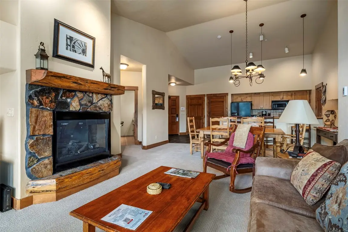 Enjoy this well appointed Trappeurs Crossing condo within walking distance to Steamboat's ski area and some of the best amenities in town! Fully furnished two bedroom, two bathroom, top floor opportunity at the Timberline Lodge. Recent upgrades include new carpet and paint. The fully-equipped kitchen with granite tile countertops and bar stool seating opens up to the dining and living areas, ensuring a comfortable stay. The living area boasts inviting furnishings and a charming stone fireplace for cozy winter nights. Step onto the covered patio to savor the mountain air. With in-unit washer & dryer, locked owner's closet, and easy access to heated underground parking via elevator, convenience is key. Trappeurs Crossing enhances the experience with private ski storage, a central courtyard with a fire pit, 4 heated pools, 10 hot tubs, a fitness center, 2 tennis courts, ski shuttle services, on-site concierge, owner's lounge with Après Ski happy hours, 24-hour security, and a front desk. Nestled in the heart of the Mountain Area, just "a skip and a hop" from the Ski Area and trails, this maintenance-free condo is your stress-free haven to explore all that Steamboat has to offer. Immerse yourself in the epitome of mountain living at its finest!