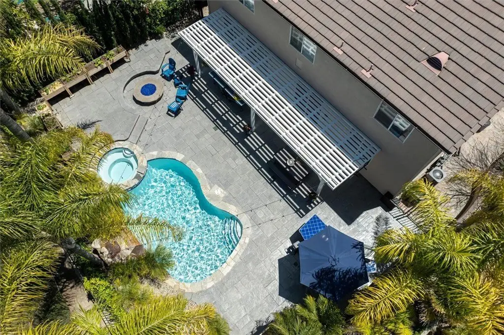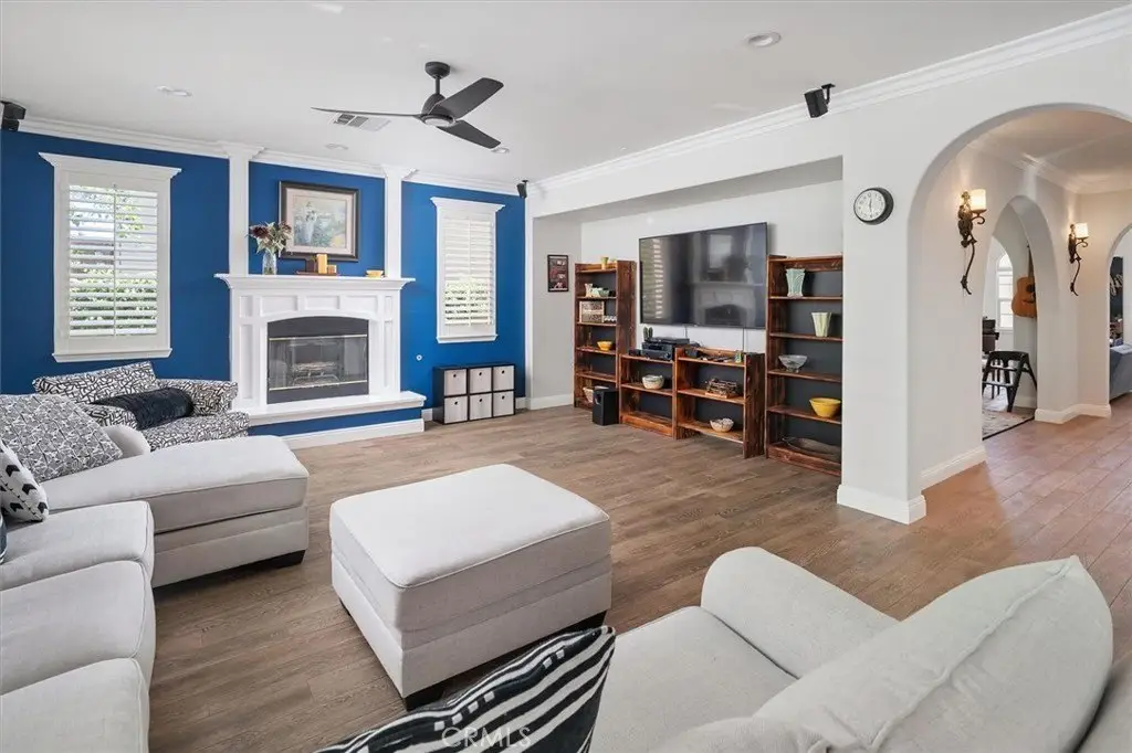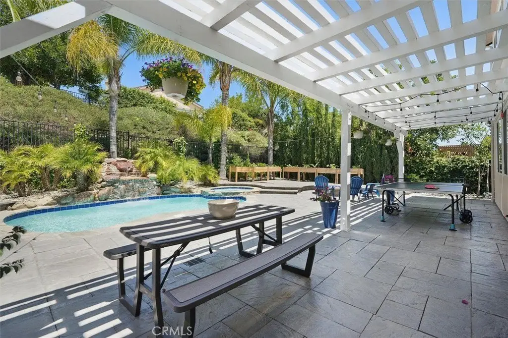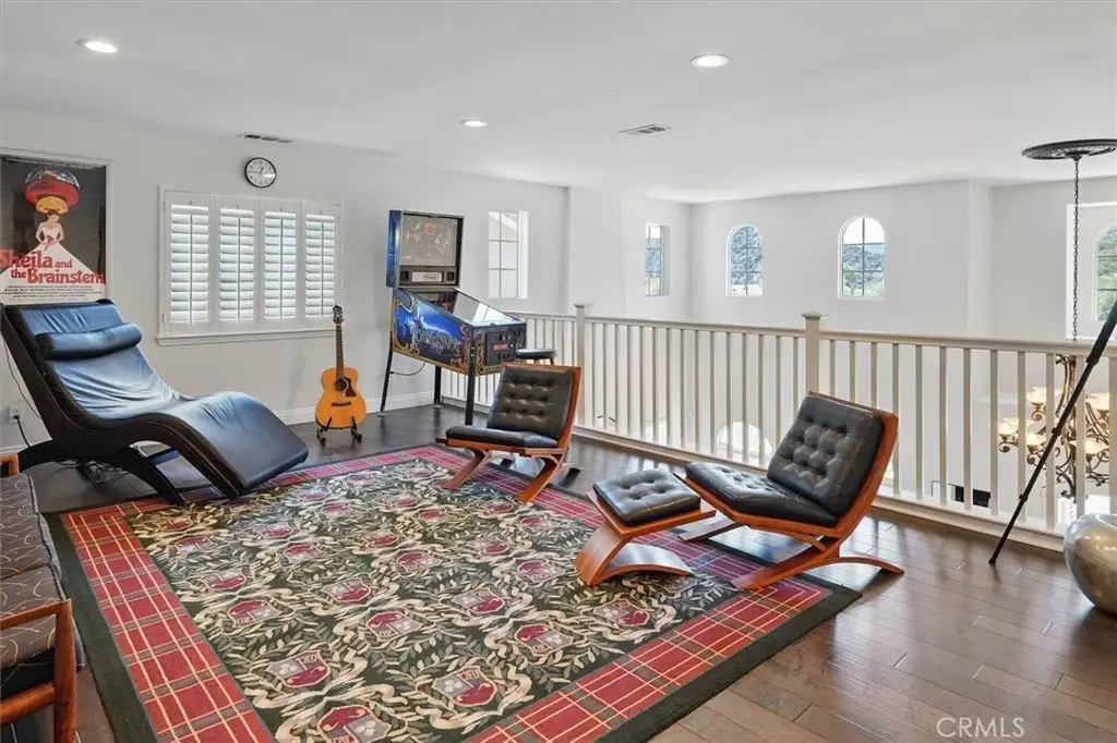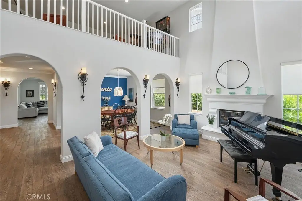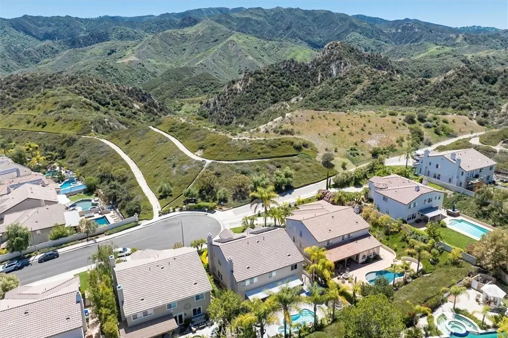 Nestled in a tranquil cul-de-sac, with stunning mountain views, this preeminent executive home offers a wonderful balance of elegance, comfort, and seamless indoor/outdoor living. Located in one of Stevenson Ranch's most coveted neighborhoods the home has superb curb appeal and a huge lot. Located just minutes from award-winning schools (including West Ranch High School), scenic parks, premier shopping, dining, and easy freeway access. From the moment you enter the door, the grand two-story formal living room impresses you with its soaring ceilings, abundant natural light, gorgeous fireplace and architectural details. Custom archways invite you into the family room with its cozy fireplace, sophisticated dining room, and designer-remodeled kitchen—a true chef’s delight. The kitchen features custom cabinetry with soft-close drawers, stainless steel KitchenAid appliances, and a built-in media cabinet. Elegant designer lighting highlights the expansive center island, perfect for gatherings. Upstairs, a spacious loft with breathtaking mountain views is an ideal setting for a media lounge, game room, or additional living space. The primary suite is a luxurious retreat, with vaulted ceilings and a spa-like en-suite bathroom with soaker tub, separate walk-in shower, full-wall linen closet with mirrored doors, and generous walk-in closet. One upstairs bedroom serves as a secondary primary suite with its own full, private bath, while two additional large bedrooms feature fresh paint and spacious walk-in closets. The downstairs fifth bedroom includes a three-door mirrored closet—perfect for a home office, guest bedroom or gym. The downstairs remodeled half-bath is plumbed for an additional shower. Designer wide-plank tile flooring, rich dark walnut hardwood, custom lighting, crown molding, window shutters, upgraded ceiling fans and elegant sconce fixtures create an ambiance of warmth and sophistication throughout the home. Step outside into a private refuge designed for year-round enjoyment. This is more than a backyard—it's an oasis. A patio cover frames the newly refinished sparkling pool and spa, while a brand-new built-in BBQ kitchen and outdoor firepit make entertaining a joy. This home features a leased solar power system (with battery backup) ensuring significant energy savings, reduced utility bills and peace of mind during power outages.