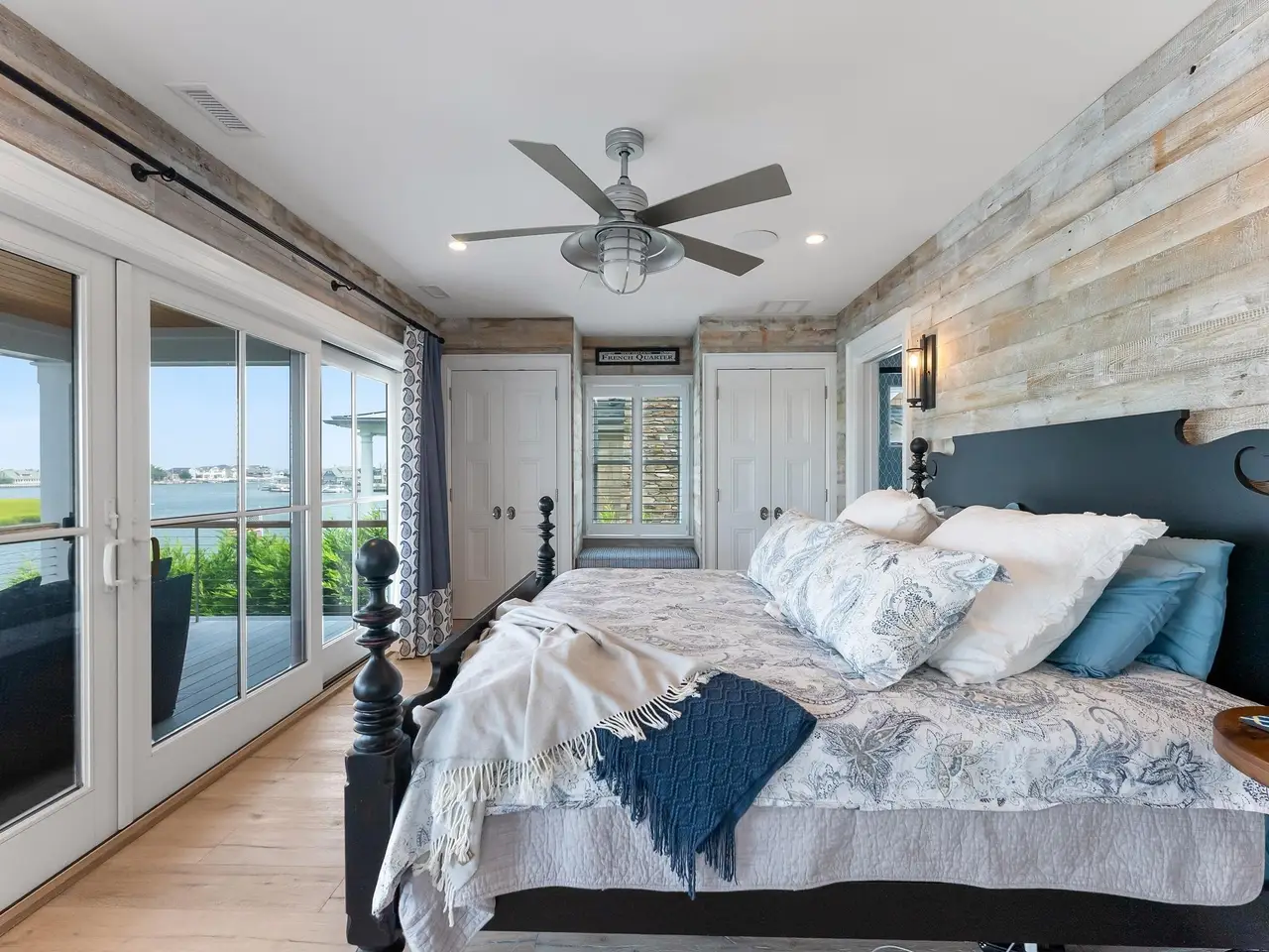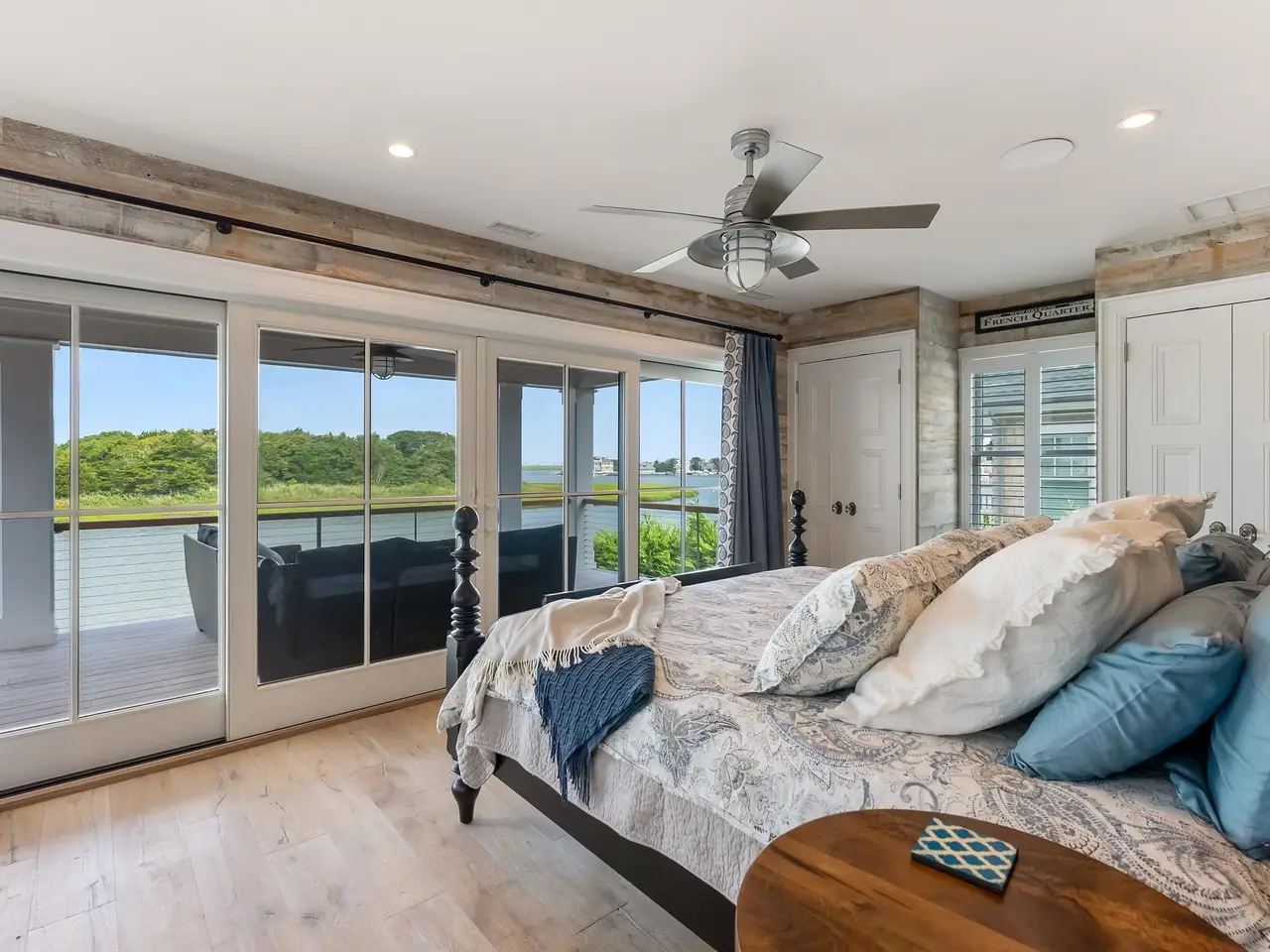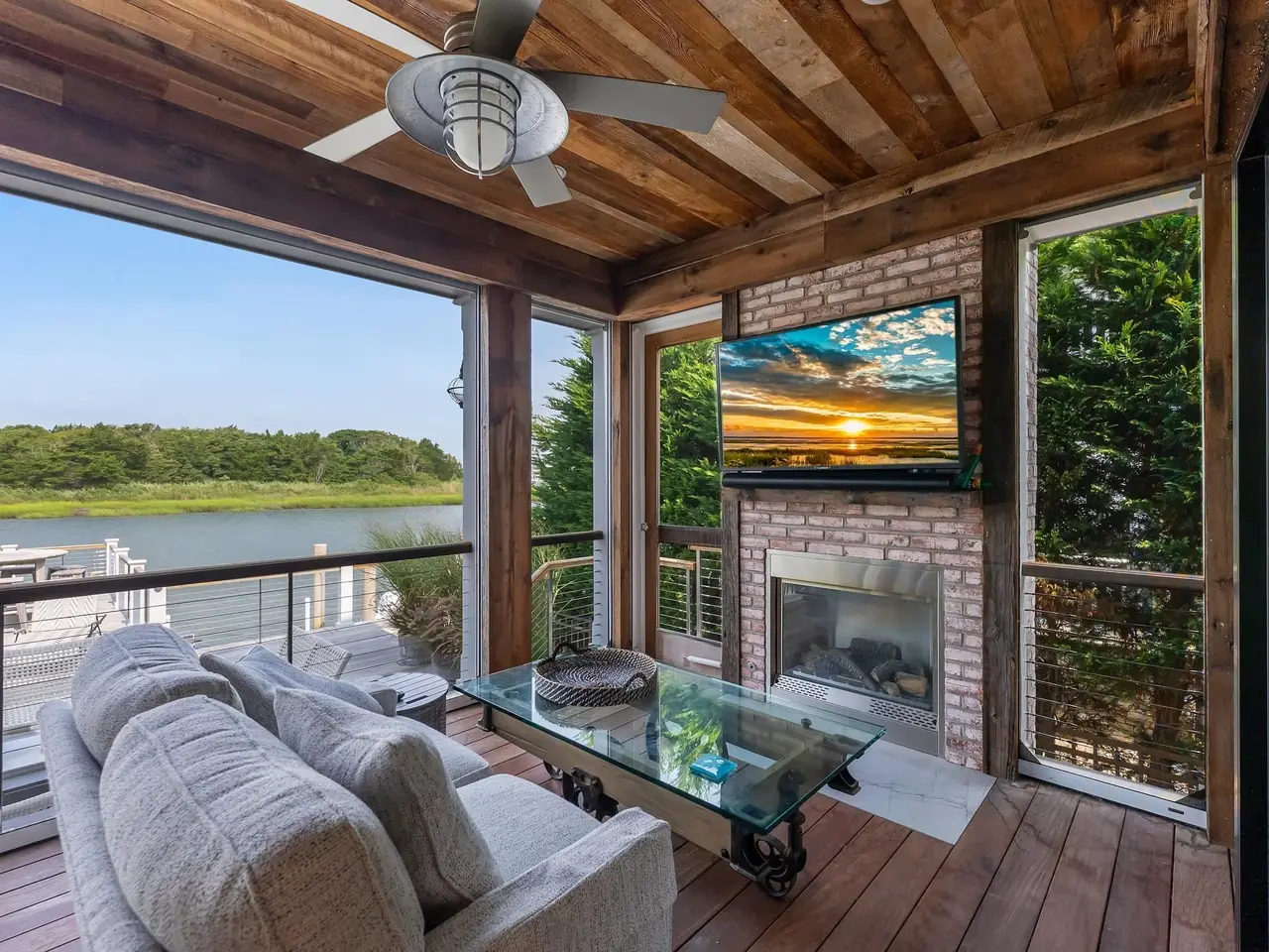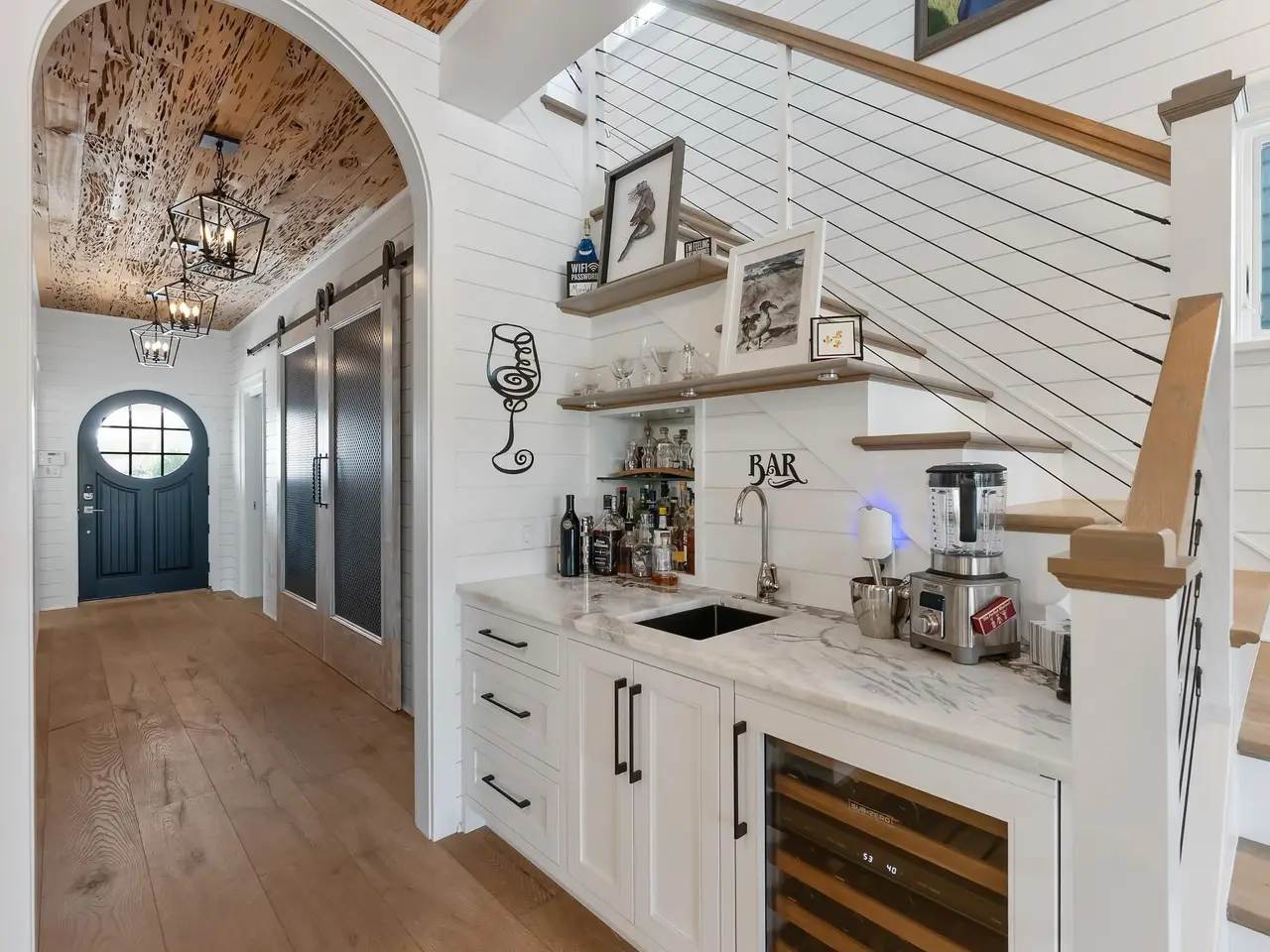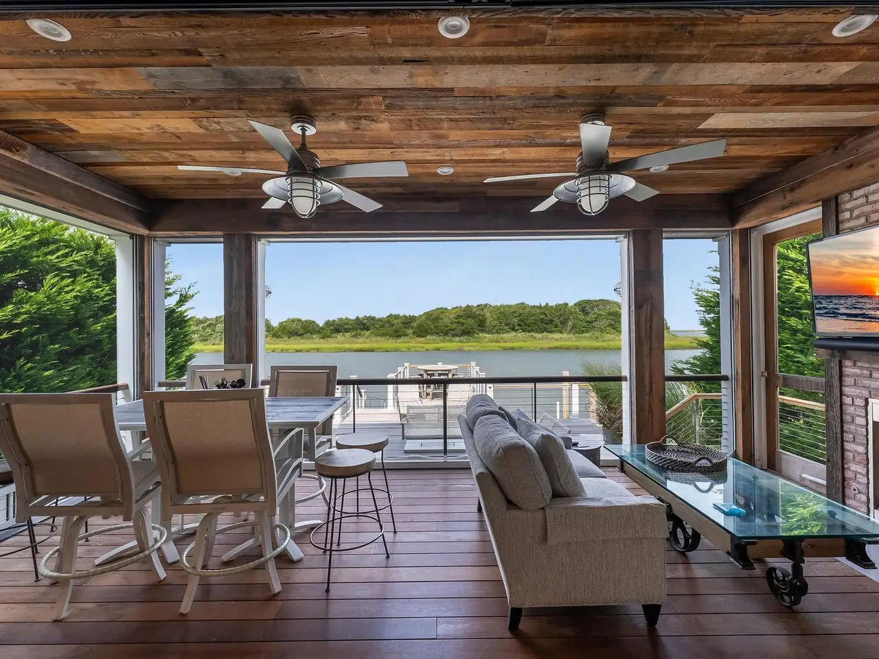 Vino Su l'acqua ("Wine on the Water") - Coastal Elegance Meets Bayfront Luxury. Welcome to Vino su l'acqua, a name that perfectly captures the essence of this peaceful, luxurious escape fabulous unobstructed views of the bay, wetlands and waterfowl habitat. This well thought out home was designed by the architectural firm of Asher Slaunwhite with much influence from Mark Asher. The home was constructed by renowned custom builder D.L. Minor and is positioned gracefully on a premier, quiet street, offering the ultimate in privacy, design, and waterfront living. From the moment you enter, you're greeted by masterful design and craftsmanship, including gorgeous, reclaimed wood accents and custom millwork throughout the home, pecky cypress wood and beamed ceilings, engineered wide plank hardwood floors, and thoughtfully curated high-end finishes throughout. The second-floor primary suite spans the full width of the home, offering breathtaking panoramic bay views through an oversized sliding glass door leading to a massive, covered deck-complete with a private wet bar and Sub-Zero wine fridge, perfect for sipping wine on the water. The spa-inspired en-suite bathroom features dual sinks, a custom open vanity, shower/tub combination with a rain head, barn-style glass doors, separate water closet, and custom open shelving. Additional interior features include a spacious custom bunk room with built-in storage, custom built-in cabinetry framed by large picture windows for abundant natural light, striking iron and wood pantry doors, and a designer kitchen with top-tier paneled appliances, multiple sinks, a cascading waterfall island with refrigerator drawers, a custom hood vent, and a luxury glass tile backsplash. The rooftop deck offers sweeping, elevated views of the bay and intracoastal waterway and serves as a true private oasis. An integrated alarm system offers peace of mind. Indoor-outdoor living is elevated by a show-stopping NanoWall that seamlessly opens the interior to an expansive screened-in porch with a brick gas fireplace, automatic hurricane shutters, and motorized screens-blurring the lines between indoor comfort and outdoor serenity. Step onto the one-level bayfront deck, adorned with elegant outdoor lighting, leading to a custom ramp and floating dock with two private boat slips-perfect for fishing, boating, or simply soaking in the sunsets. Smart home features include a fully integrated Control4 Smart Home System that has sonos speakers in every room can be operated from your phone via app with fully customizable remote access. The system controls deck screens and shutters, climate (heating and air conditioning), lighting, and music in every room of the home-including the front porch, back porch, and outdoor deck-with seamless efficiency using Lutron lighting and intuitive design. After a day on the water, rinse off in your own luxurious brick-walled outdoor shower-a private, elegant touch that enhances your coastal lifestyle. Additional features include a welcoming full front porch, two off-street parking spaces, and built-in wine moments around every corner-fitting for the home's namesake. Vino Su l'axqua is not somply a home-it's a lifestyle on the water, where every detail is a testament to thoughtful design, timeless quality, and refined coastal living. Don't miss the opportunity to own Vino Su l'acqua, your own personal paradise-a true waterfront sanctuary where luxury meets tranquility, and every sunset is a masterpiece.