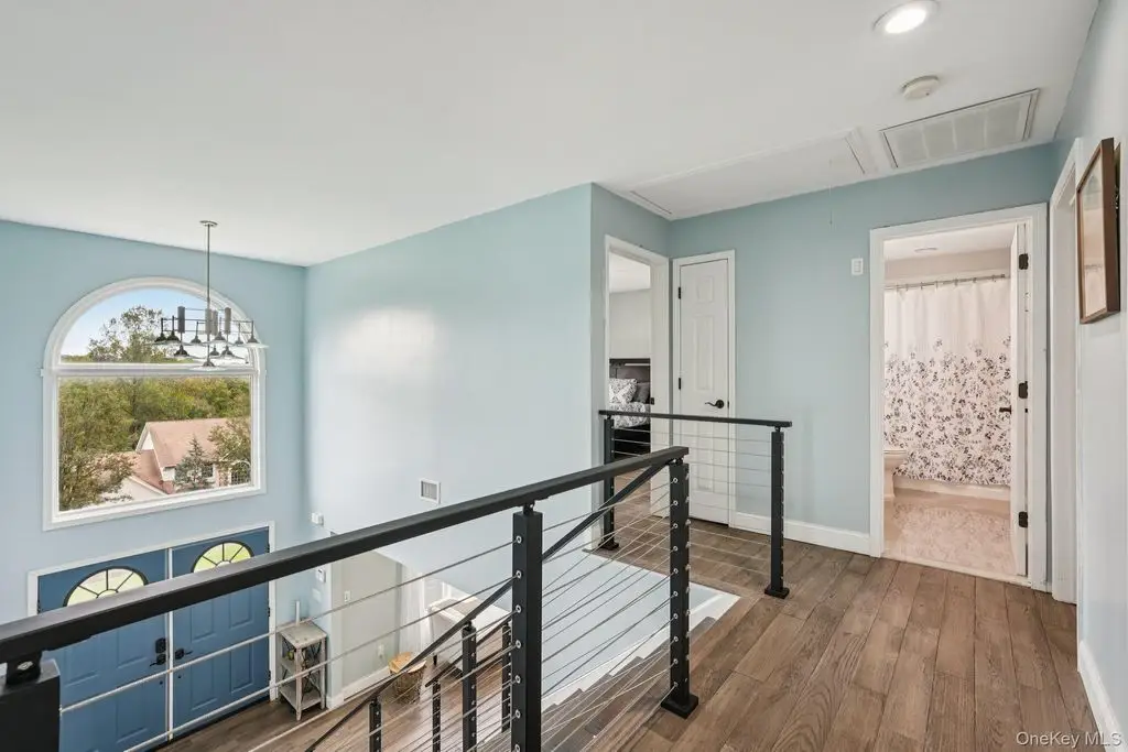 Beautifully maintained colonial with an impressive two-story entry leading to a bright, open layout accented by oversized casement windows throughout. Oak floors run throughout the home, while recessed lighting with adjustable color temperature (warm to 6000K LED) creates a modern, customizable ambiance. The kitchen offers abundant cabinetry and a large eat-in area with a custom island, flowing seamlessly into an airy dining space with sliders to an expansive Trex deck perfect for entertaining. The family room features a wood-burning fireplace, cathedral ceiling, and opens to a versatile bonus room.Upstairs, the elegant primary suite boasts a tray ceiling, walk-in closet, and a luxurious primary bath with soaking tub, walk-in shower, vaulted ceiling, and skylight. Three additional bedrooms and a full bath complete the upper level. The finished lower level provides flexible living options, including an additional living area, walk-in closet, storage space, and full bath ideal for guests, recreation, or a home office.This home includes modern upgrades such as in-ceiling speakers in the living room, primary suite, with bath, and garage, perimeter cameras, and a beautifully landscaped exterior with paver walkways. The backyard features a private retreat with a heated saltwater in-ground pool, custom pavers, and landscape lighting. A three-car attached garage and generous driveway provide ample parking.