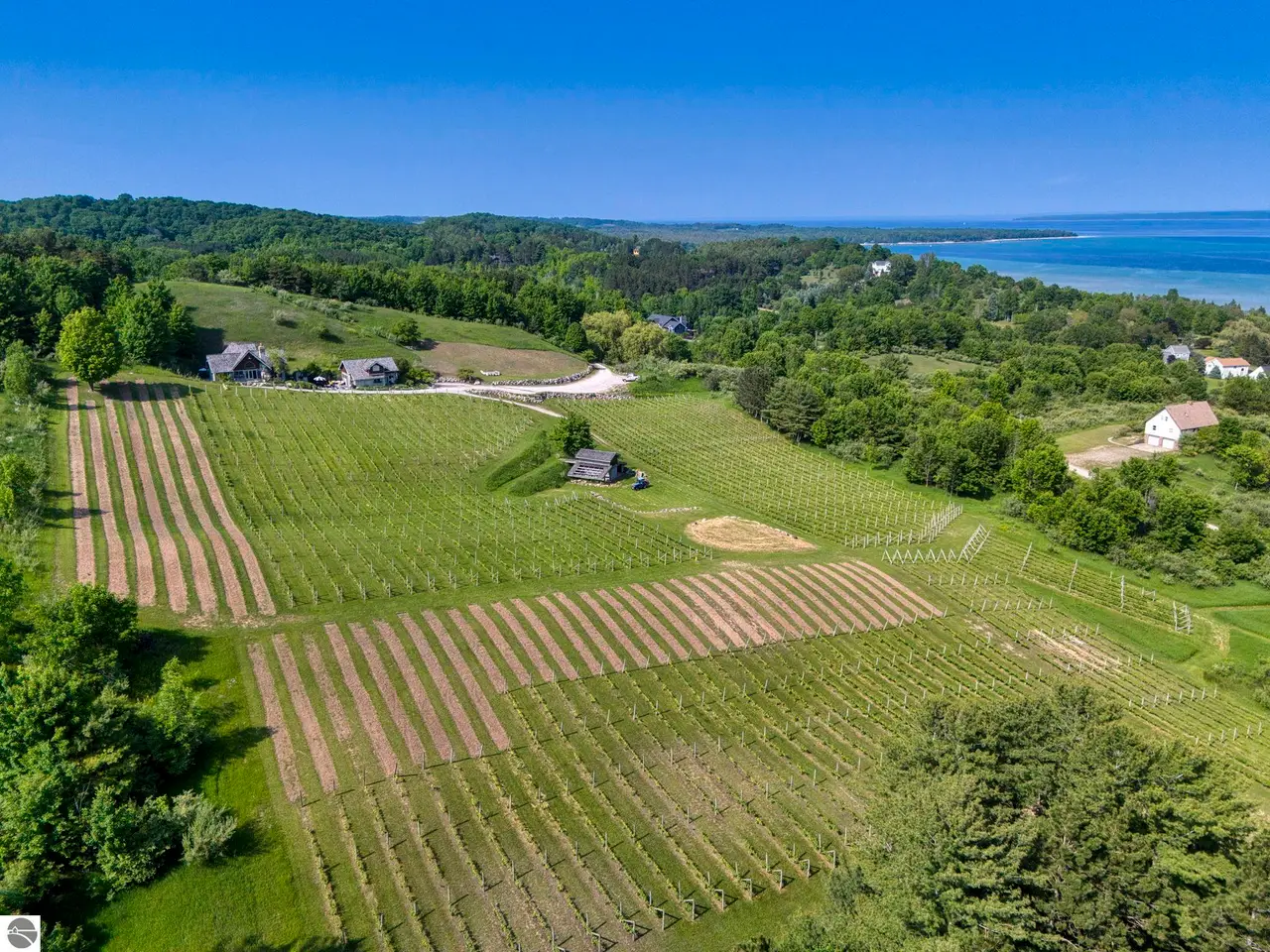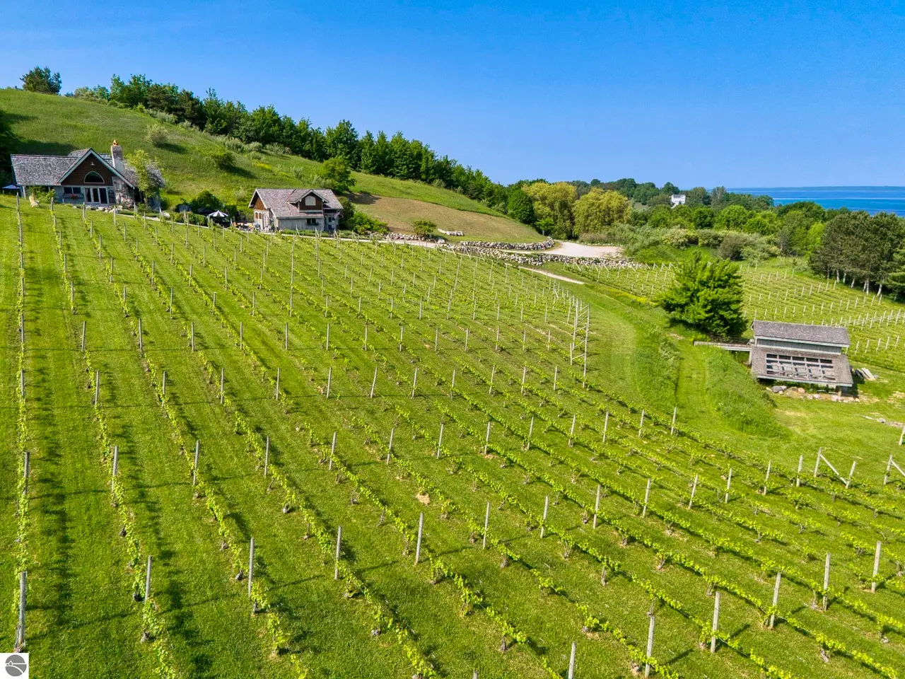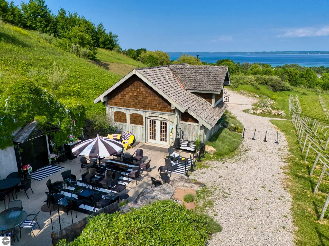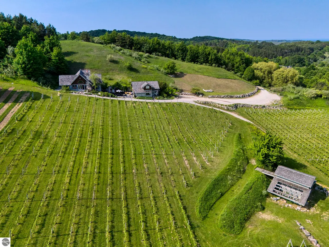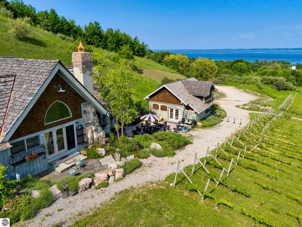 One of a kind property with the most incredible views over West Grand Traverse Bay offers many possibilities. Currently the home to Willow Winery & Vineyard - the 5th oldest working vineyard & winery on the Leelanau Peninsula, named the #2 wine region by USA today (next to Napa). This well-established, turn-key property includes a French Provencal villa designed to capture the up close water and vineyard views. The 11.45 acre site makes it the most approachable & manageable for the novice wine maker, the experienced or for existing wineries to add this magnificent site to their assets with a tasting room and residence. The villa features classic board-and-batten siding, a cedar shake roof, fireplace and imported cathedral doors from France that open into the primary suite. The impressive stone landscaping has a timeless, century-old character that blends perfectly into the rolling vineyard backdrop. The lower level of the villa is fully outfitted for winery production. A separate winery tasting room, built in the same architectural style, includes a indoor and outdoor guest seating, a bar area, retail space, 1/2 bath and storage above. A two-level equipment barn offers ample space for storage. Currently, the villa operates as a successful Airbnb rental, providing an additional revenue stream. Options to use as a private residence, continued short-term rental or full-time winery operation, Willow offers flexibility, history and unmatched charm in the heart of Leelanau Wine Country. Included in price is Wine Inventory. Shown by appointment only.