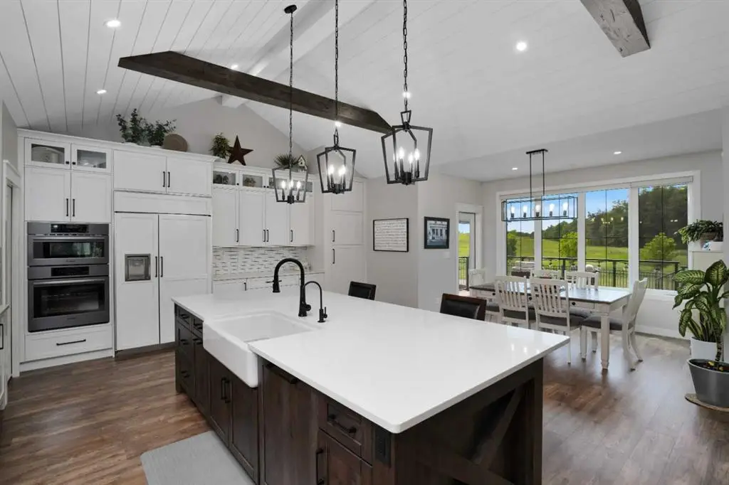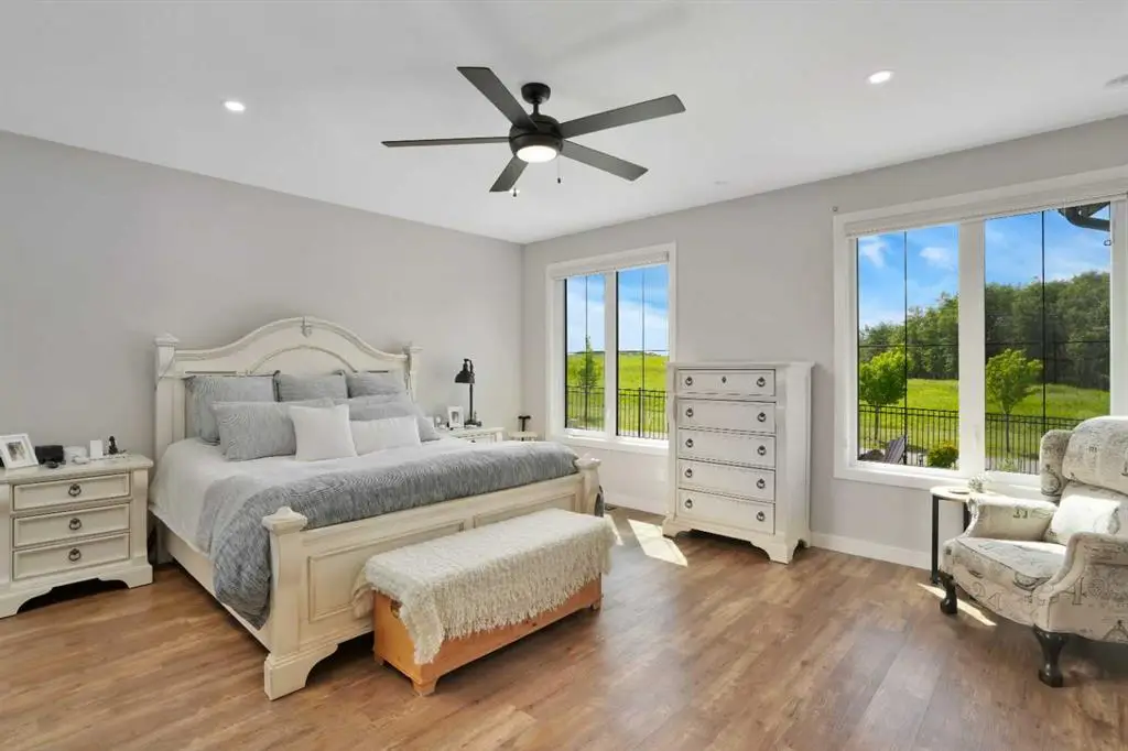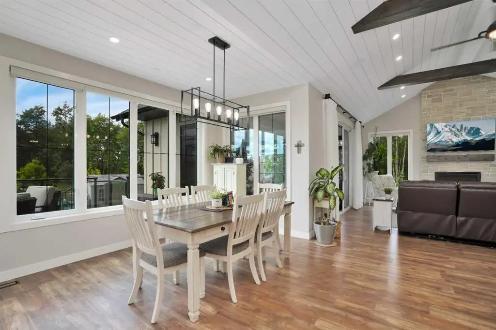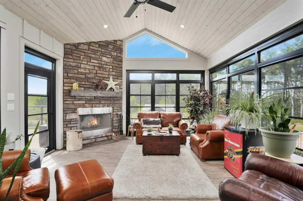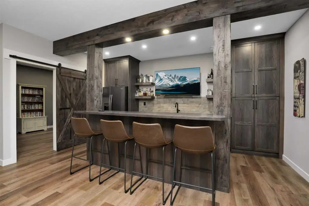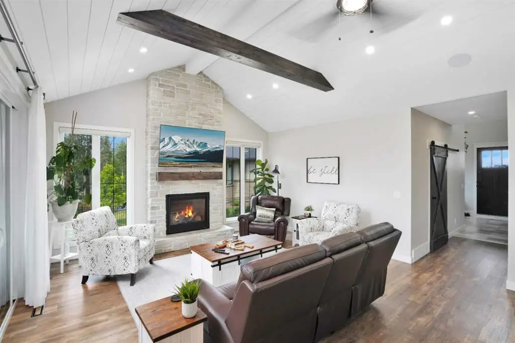 This extraordinary home in Sixty West redefines luxury living with a level of craftsmanship, space, and comfort rarely seen in Central Alberta. With over 3,400 square feet of above-grade living space, it offers a grand yet grounded experience. Soaring ceilings and expansive windows flood the main floor with natural light, framing views of surrounding parkland and walking trails. The expansive layout connects a thoughtfully curated dream kitchen to a warm, welcoming living area. The kitchen is both functional and stunning, with a massive island, premium appliances, and a hidden coffee bar and prep space, perfect for entertaining or everyday ease. Solid wood accents and barn doors add texture and charm throughout, including a quiet main-floor office. Seamlessly integrated into this space is a discreet feature door that opens to the crown jewel: a spacious, private primary retreat that feels more like a luxury spa than a bedroom. The enclosed sunroom with a wood-burning fireplace offers year-round comfort perfect for last-minute get-togethers or quiet mornings with a coffee and a good book. Upstairs, there’s plenty of space to stretch out for yoga, weight training or even host golf nights on your private golf simulator. A wet bar and full bathroom complete the upper floor. The lower level is designed for connection and fun, with a full-sized bar, spacious media room, games areas, and two large bedrooms with private ensuites, perfect for visitors or teenagers. Outside, a fully landscaped, manicured yard with underground sprinklers and multiple decks maximizes outdoor living. The heated three-car garage features a secure dog run and an indoor wash station. Built to an exceptional standard and thoughtfully designed for effortless living, this home offers beauty, comfort, and opportunity in one of Sylvan Lake’s most coveted neighborhoods. This one-of-a-kind home is on a level of its own.
