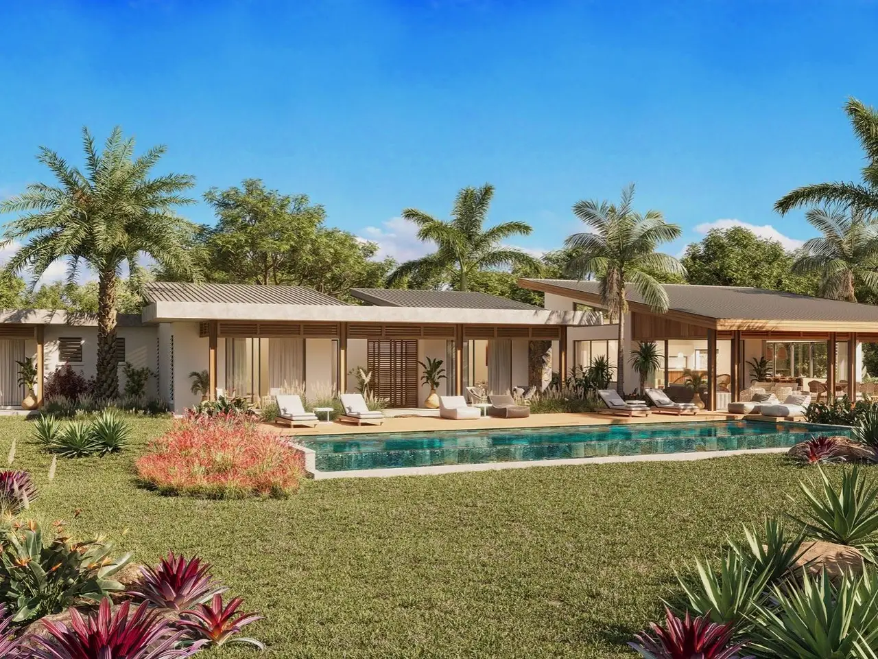 Nestled within the flora environment beneath La Tourelle Mountain in Tamarin, this brand new, off-plan villa is part of a development composed of 47 luxury villas of 6 different designs, as well as A to Z resort facilities including a Clubhouse, a concierge service with all the advantages of a hotel, a kids’ corner, a restaurant, a lounge bar, a superbe 120 m2 pool and a fitness club.  On a 2273 m2 plot of land, this 458 m2 villa offers 5 en-suite bedrooms, of which four bedrooms gives access to a private terrace and the garden, and the master-bedroom offers a walk-in cupboard and a bathroom with bathtub. As you walk in you are welcomed by an inviting entrance hall which leads to the open-plan living room with kitchen, lounge and dining area, which leads in turn to a covered verandah overlooking the pool. As practical as it is beautiful, the property also offers a laundry room, a store room, an office, a double garage and 3 additional parking spaces. Life within the environmentally conscious domain will be defined by luxury living in touch with nature, food, sport, work, relaxation and service. The domain also offers a fully equipped business centre where residents benefit from an office space in close proximity to their homes; or welcome business travellers and e-nomads. Merging leisure, work and sustainability within its core ethos, this project is firmly committed to respecting the integrity of its surrounding environment, emphasising energy optimisation, waste control and social involvement. The estate benefits from an exceptional location, at the gates of Tamarin, a former fishing village that has become one of the most popular seaside hubs on the island. Residents will be able to enjoy the advantages of this village which has beeb named the “Smart and Happy Village”. Its surf spots, its internationally popular golf course(the Tamarina Golf Club) as well as its many shops and established French and English schools are all less than 10 minutes away.  Space; this is a key factor within this development and it is not only found within the villas but also in the communal areas. Fluid and airy circulation is ensured in particular by a wide enough main road and by the integration of shaded pedestrian path. Having already accomplished property developments in France, Portugal and in Mauritius, the developers work alongside reputed partners in order to ensure the quality of their products and services.