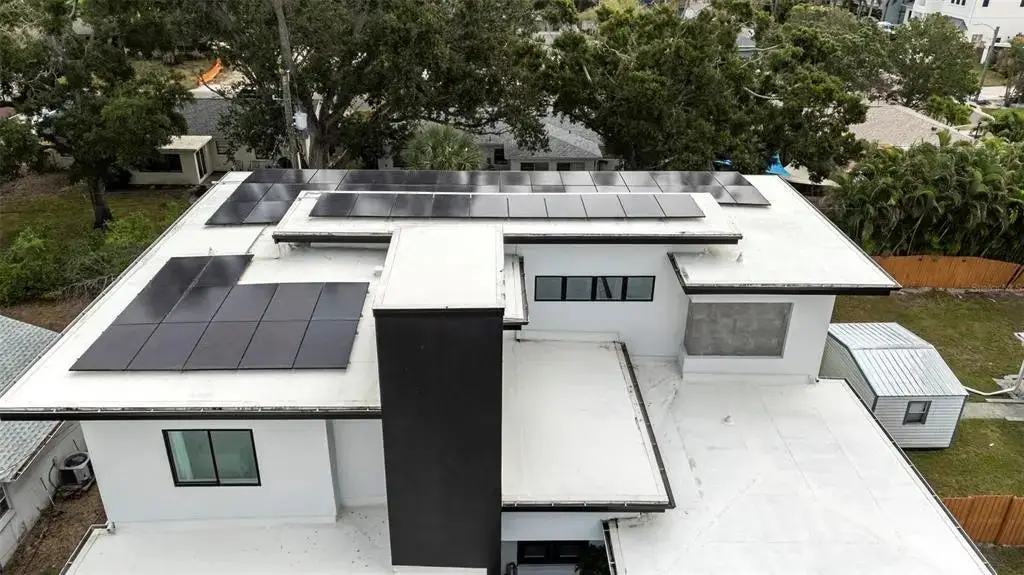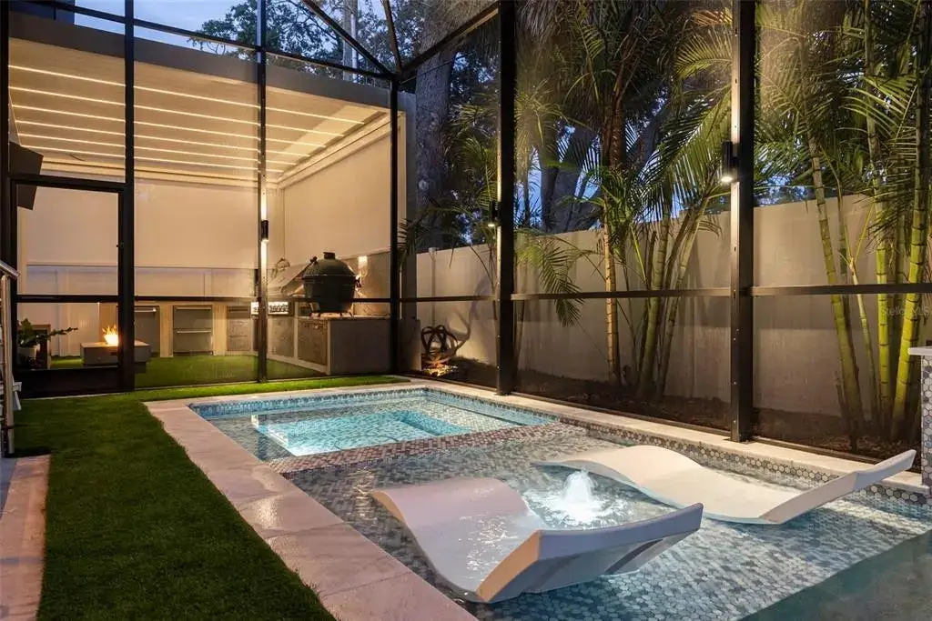 Welcome home to this 2019 Mid-Century Modern masterpiece by premier builder Ferncliff, Inc., perfectly positioned high and dry at 10.64ft in sought-after Bel Mar Shores within the coveted Mabry, Coleman, and Plant A+ school district. Designed for both casual elegance and modern living, this 5-bedroom plus office, 4.5-bath home offers over 4,150 square feet of thoughtfully designed space showcasing exceptional craftsmanship and the highest-quality finishes throughout. The open-concept great room impresses with soaring ceilings, abundant natural light, and expansive hurricane-rated sliding doors that flow seamlessly to the outdoor living areas. The chef’s kitchen is anchored by a dramatic waterfall Quartzite island and features imported Italian white lacquer cabinetry, Quartz countertops and backsplash, top-of-the-line stainless steel appliances, including a 5-burner induction cooktop with hood, double wall ovens, 42” built-in refrigerator, and dishwasher. A walk-in butler’s pantry, under-cabinet lighting, pendant fixtures, a wine bar with stainless sink and refrigerator, and a central vacuum system complete this exceptional culinary space. The first-floor owner’s suite is bright and serene, featuring a custom walk-in closet and a spa-inspired bath with a 6' x 14' walk-in shower with Kohler fixtures, Quartzite double vanity, freestanding soaking tub, and large-format porcelain tile floors. Completing the main level is a home office or playroom, a half bath, a mudroom with built-in storage, and a large laundry room. Upstairs, a striking open-tread staircase with stainless cable railing leads to a gallery landing with 13’ ceilings, three en suite bedrooms with walk-in closets, and a flexible bonus room perfect for a gym, office, or media space. The outdoor living area is a showpiece of its own, featuring a new pool and spa (completed Nov 2024) with color-changing LED lighting, and custom tilework, a 15x19 weatherproof pergola with auto louvers and integrated sun/wind shades, and a full Hestan outdoor kitchen with a 42” grill, 24” power burner, and refrigerator. The entire backyard is finished in lush turf for a clean, low-maintenance lifestyle. Additional highlights include a state-of-the-art whole-home solar power system that keeps electric bills around $15 per month, supported by smart backup batteries for seamless energy reliability (21.56kW system with 56 Meyer Burger 385W panels, 56 IQ8+ microinverters, and Anker Solix backup batteries with smart switch), Marantz surround sound system (living area, kitchen, and primary bath), 50-amp Tesla charger, water softener, custom primary closet built-ins, Dimplex fireplace wall, Swann security system, and new interior and exterior paint (Feb 2025). The oversized two-car garage offers 250 sq ft of elevated storage and a new epoxy floor (Feb 2025), with a ToughShed for additional storage on the southside. All windows and doors, including the garage, are hurricane-rated and high-security impact-grade, and the home includes dual-zoned 16 SEER HVAC, a smart DSC security system with app control, LED lighting throughout, in-wall pest tubes, and a Rainbird irrigation system. Located just minutes from Tampa’s best dining, shopping, and cultural attractions—and only seven miles from Tampa International Airport—this home perfectly blends architectural sophistication, energy efficiency, and the relaxed elegance of South Tampa living.