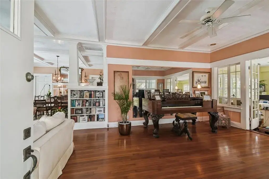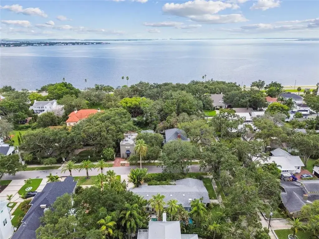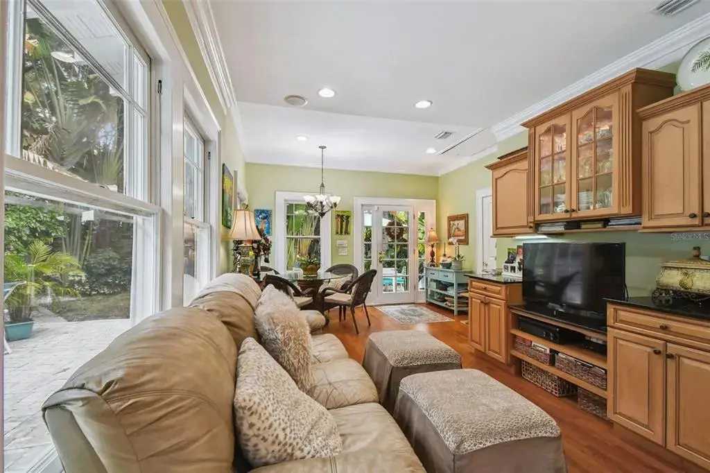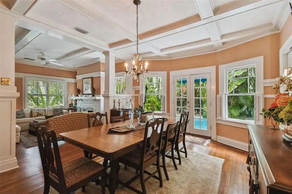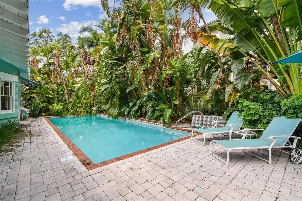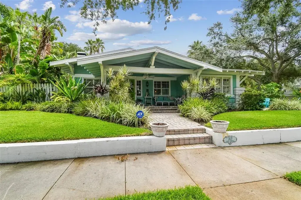 This timeless 1914 Hyde Park residence offers 2,276 square feet of character-rich living space on a rare lot and a half, perched approximately 20 feet above sea level. The property presents a unique opportunity to enjoy a smaller-scale home in Hyde Park or take advantage of the generous lot to add a garage or guest house. Inside, hardwood floors, ornate crown molding, custom shutters, and high coffered ceilings create a sense of grandeur throughout. The formal living room showcases built-in bookshelves and a wood-burning fireplace, while the formal dining room features beveled baseboards, a coffered ceiling, and bay windows overlooking the pool. A sunroom overlooking the side yard brings abundant natural light into the home. The kitchen is a chef’s delight, complete with dual ceiling fans, a center island with bar seating, GE Profile 5-burner natural gas cooktop with vented hood, double built-in ovens, and a cozy corner dining spot. A secondary sitting area with French doors opens to the patio, while a large laundry room adds everyday convenience. The primary suite offers a walk-in closet and a spacious sitting/dressing room that can easily be converted into an ensuite. Bedroom two highlights heart-of-pine wood floors, a custom-built bookshelf with desk, and closet units framing large double-hung windows. Outdoors, the tropical backyard is a private retreat with a resurfaced 40x15 heated pool, outdoor shower, and lush landscaping maintained by a 6-zone reclaimed water sprinkler system. A brick-paved driveway and both side and rear parking pads with space for three vehicles provide ample parking options. Additional features include underground utilities (electric, phone, fiber optic), private paver alley, Roof (2016), AC (2018). This property is a rare find—original features, elegant touches, and room to expand—all in one. Whether you’re drawn to its historic charm or envisioning future possibilities, this home offers a truly unique opportunity