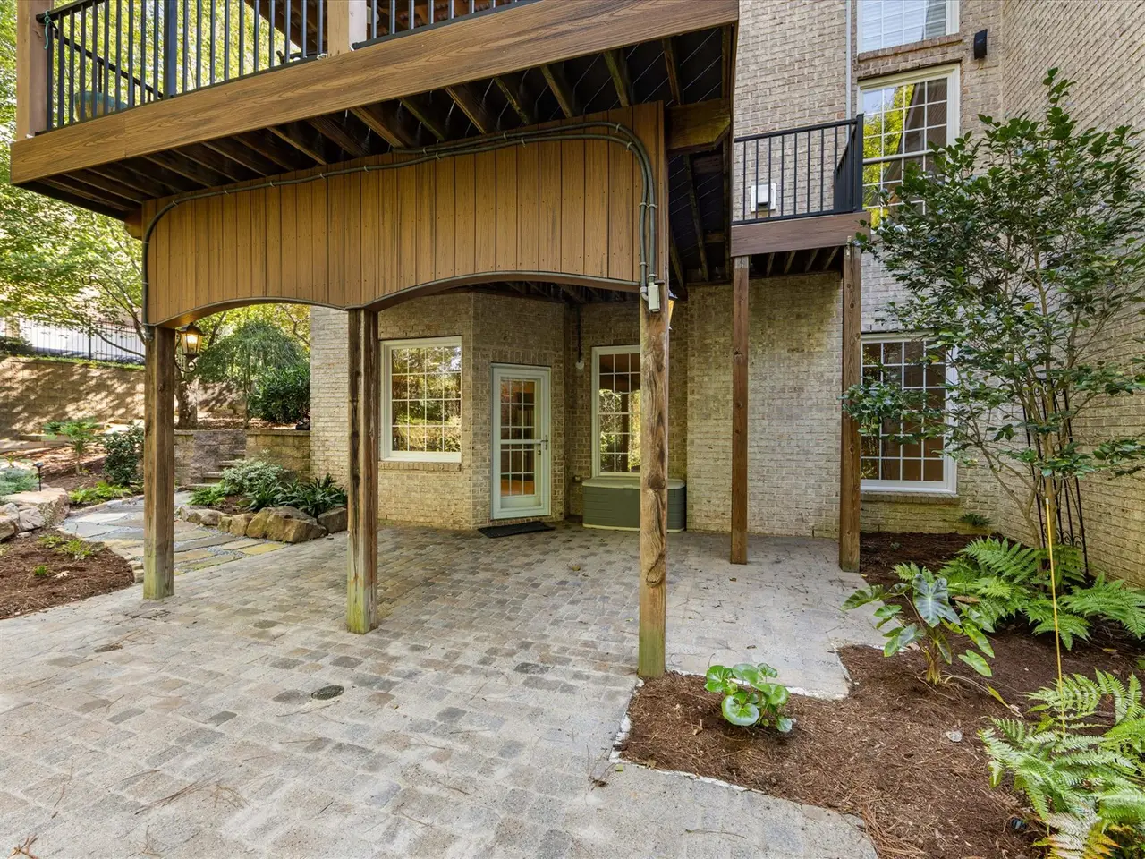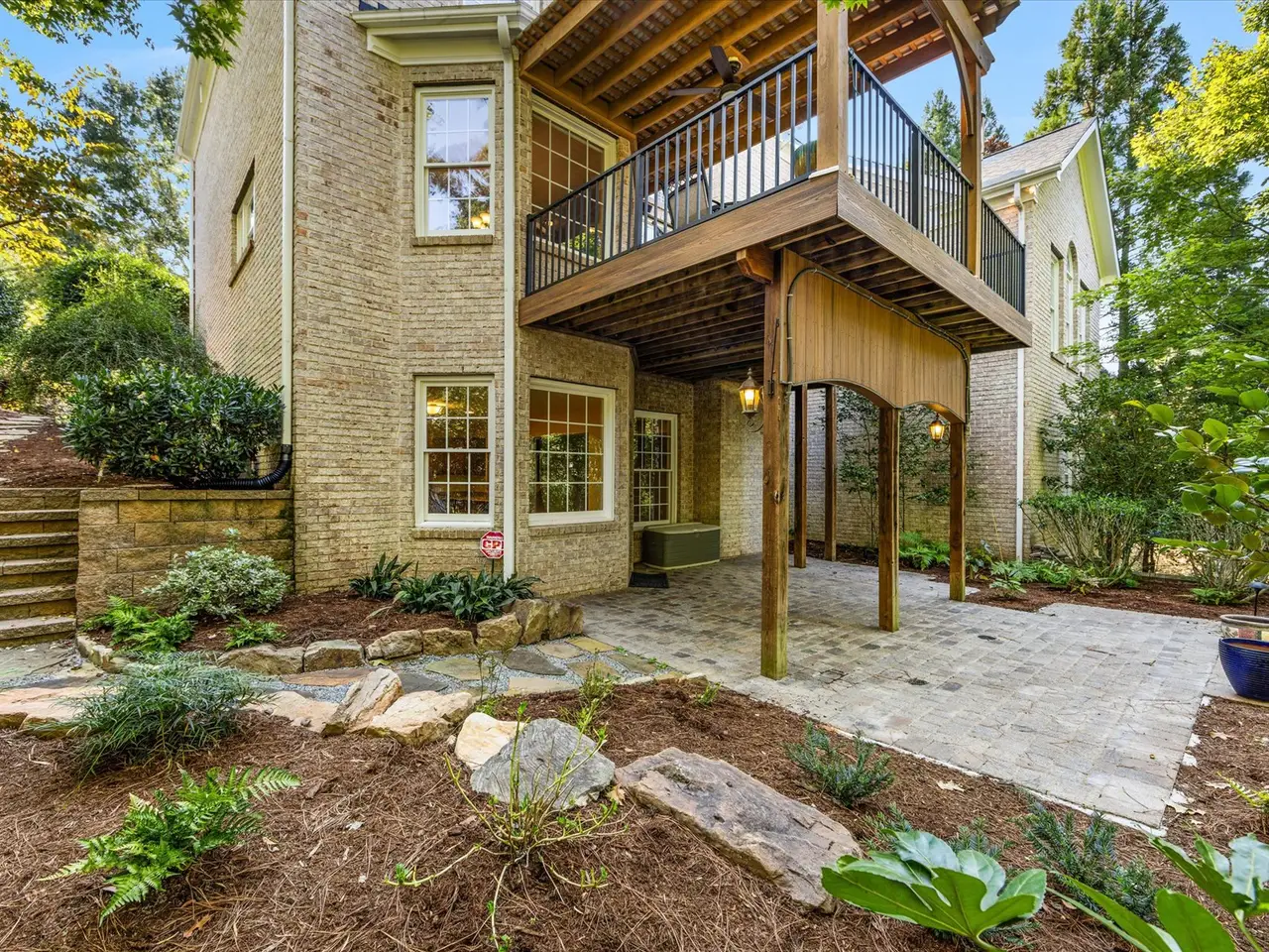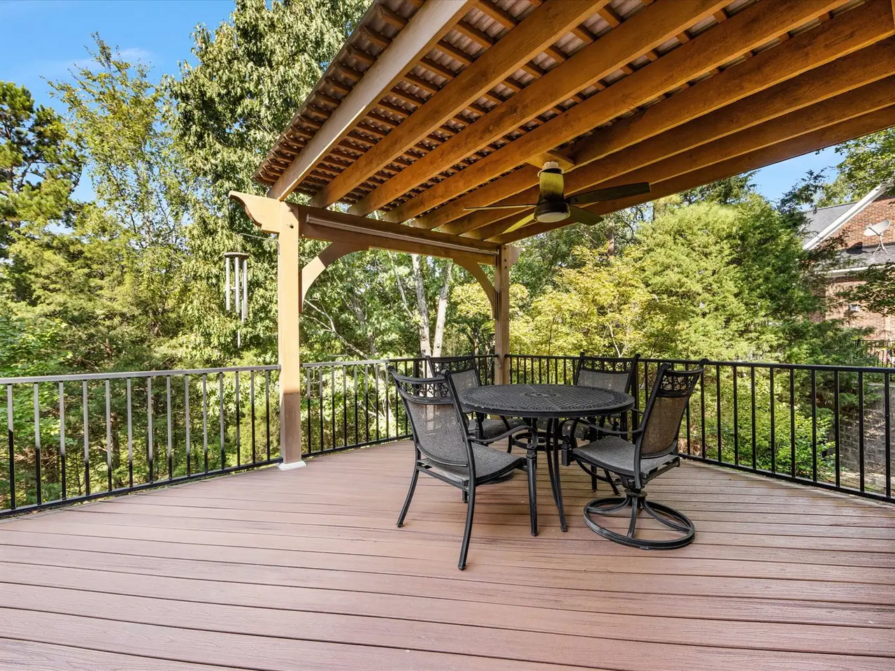 Covered deck overlooking landscaped backyard