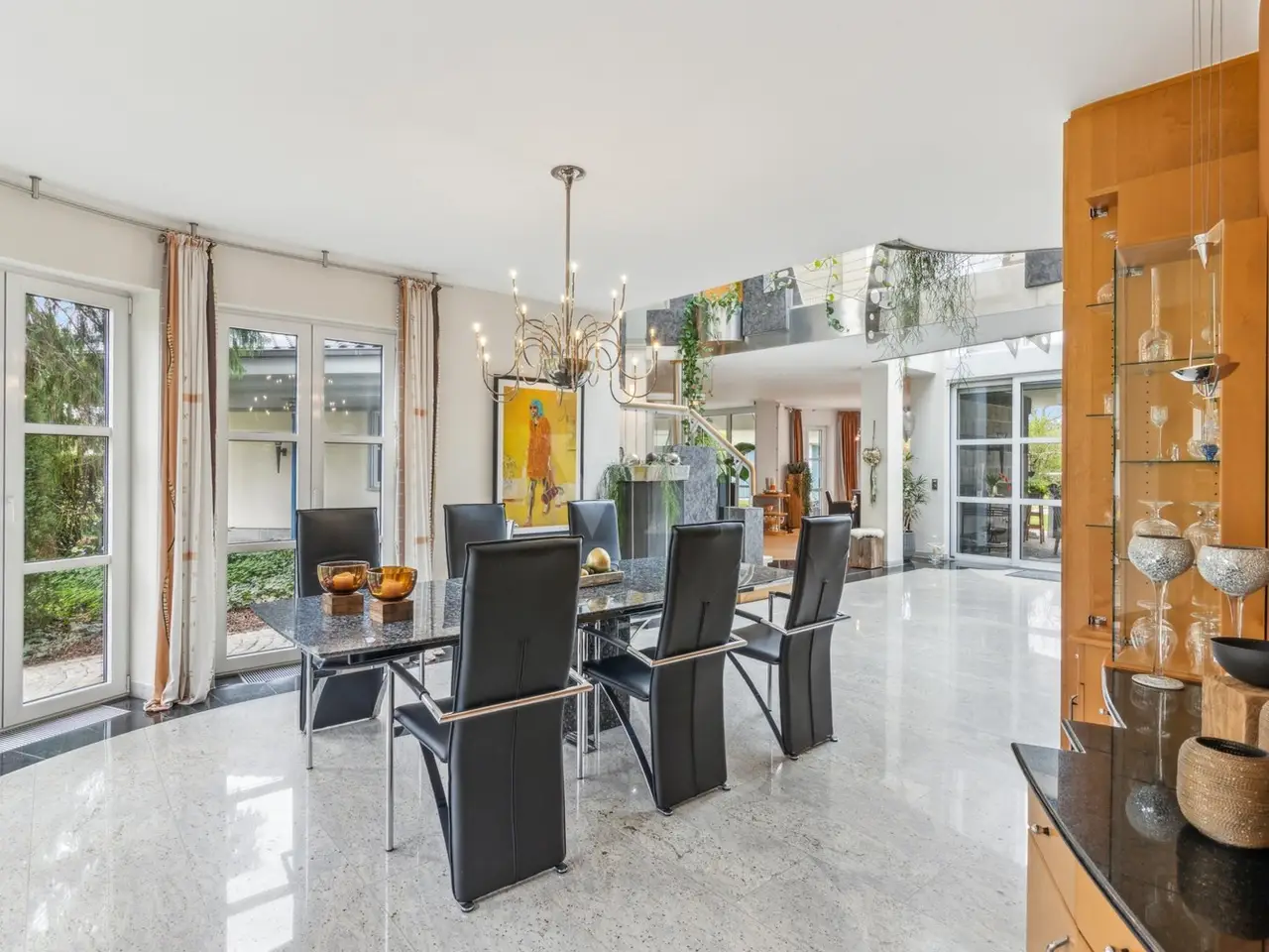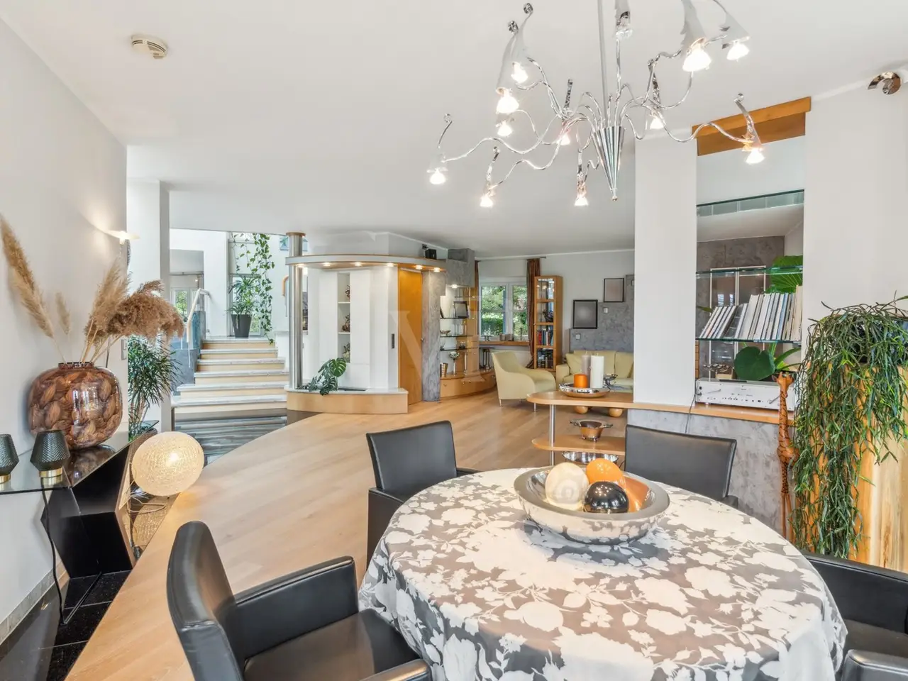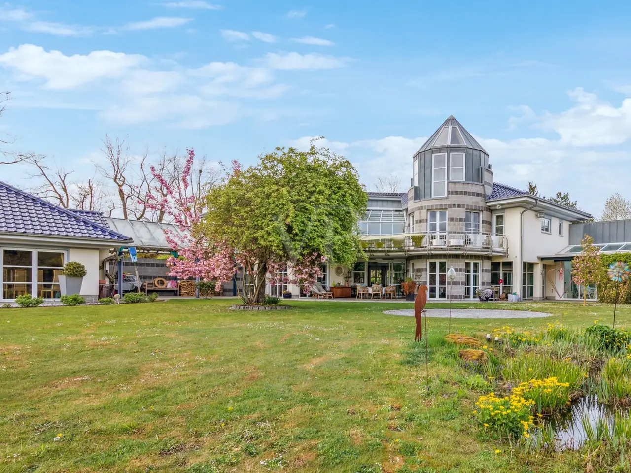 VON POLL IMMOBILIEN Zweibrücken presents this exclusive villa property that leaves nothing to be desired. The slightly elevated position not only gives you a magnificent view, but also the desired degree of privacy. The almost 10,000 m² plot of land, the beautifully landscaped garden with herb beds, greenhouse and private pond, the extremely generous amount of space, the high-quality furnishings with custom-made fittings and the private spa and wellness area are just some of the highlights that make this offer unique. The stylish property was built in 1997 and impresses with its well thought-out and versatile floor plan. The elegant combination of high-quality materials, such as the granite and wooden floors, has created a particularly pleasant living atmosphere despite the spacious rooms. The living space of more than 600 m² offers a wide range of possibilities for individual design. Spread over three levels, the spacious windows provide plenty of light and an impressive view of the greenery. The elegant living area is connected to a high-quality kitchen with its own cold storage room and large pantry and offers direct access to one of the numerous terraces. The transition from the dining room to the living area is seamless and forms the heart of the house with a fireplace room, a further dining/tea area and the classic living room. When the weather is nice, the open gallery area with its glass roof can be connected almost seamlessly with the outdoor area thanks to large sliding doors. The covered terrace leads you to a 50 m² outbuilding which is equipped with a kitchen and a large pizza oven - the ideal place for larger parties. Another outbuilding in the western part of the property is currently used as an office. Both are equipped with sanitary installations, making it conceivable to convert them into a separate apartment for an au pair or family. The bedrooms are located one level higher. The master bedroom has a dressing room, an en-suite bathroom and a further tower room. There is also a bathroom for the two children's bedrooms. The floor can be reached via two staircases. This makes it possible to separate the parents' and children's or guest areas if required. The wellness area with a large swimming pool, whirlpool, sauna, steam bath and a fitness room with glass windows overlooking the garden is certainly a very special highlight. Thanks to the short distances, the sports and relaxation program can be easily integrated into the daily routine. A generous number of parking spaces, both open and closed, and additional cellar rooms round off the offer. We will be happy to answer your initial questions in advance by telephone on 0 63 32 - 90 57 477 or in our store at Homburger Straße 40 in Zweibrücken or send you the detailed exposé by e-mail.