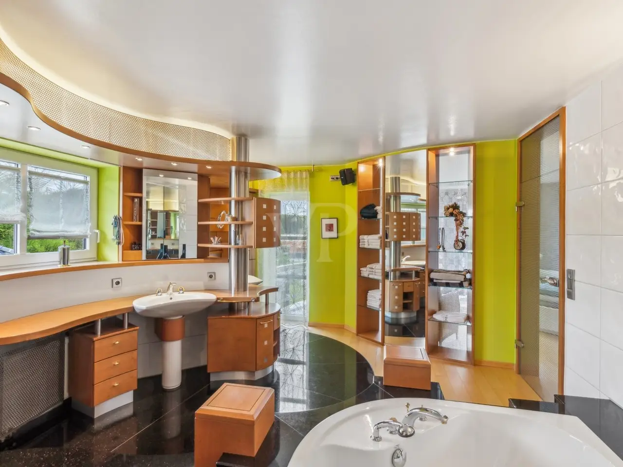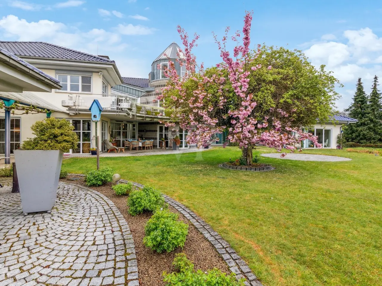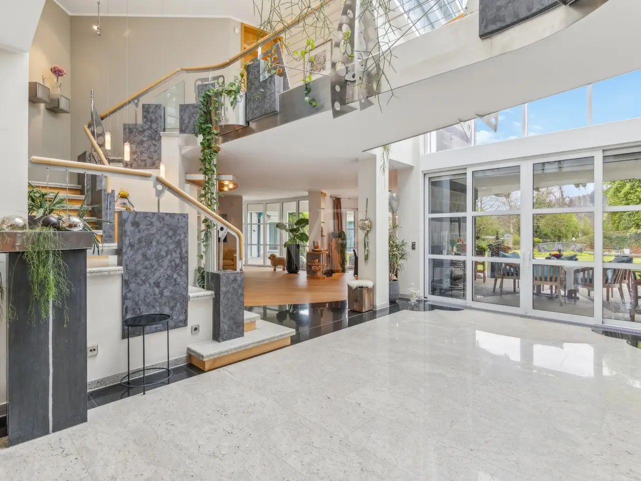 VON POLL IMMOBILIEN Zweibrücken presents this exclusive villa property that leaves nothing to be desired. The slightly elevated position not only gives you a magnificent view, but also the desired degree of privacy. The almost 10,000 m² plot of land, the beautifully landscaped garden with herb beds, greenhouse and private pond, the extremely generous amount of space, the high-quality furnishings with custom-made fittings and the private spa and wellness area are just some of the highlights that make this offer unique. The stylish property was built in 1997 and impresses with its well thought-out and versatile floor plan. The elegant combination of high-quality materials, such as the granite and wooden floors, has created a particularly pleasant living atmosphere despite the spacious rooms. The living space of more than 600 m² offers a wide range of possibilities for individual design. Spread over three levels, the spacious windows provide plenty of light and an impressive view of the greenery. The elegant living area is connected to a high-quality kitchen with its own cold storage room and large pantry and offers direct access to one of the numerous terraces. The transition from the dining room to the living area is seamless and forms the heart of the house with a fireplace room, a further dining/tea area and the classic living room. When the weather is nice, the open gallery area with its glass roof can be connected almost seamlessly with the outdoor area thanks to large sliding doors. The covered terrace leads you to a 50 m² outbuilding which is equipped with a kitchen and a large pizza oven - the ideal place for larger parties. Another outbuilding in the western part of the property is currently used as an office. Both are equipped with sanitary installations, making it conceivable to convert them into a separate apartment for an au pair or family. The bedrooms are located one level higher. The master bedroom has a dressing room, an en-suite bathroom and a further tower room. There is also a bathroom for the two children's bedrooms. The floor can be reached via two staircases. This makes it possible to separate the parents' and children's or guest areas if required. The wellness area with a large swimming pool, whirlpool, sauna, steam bath and a fitness room with glass windows overlooking the garden is certainly a very special highlight. Thanks to the short distances, the sports and relaxation program can be easily integrated into the daily routine. A generous number of parking spaces, both open and closed, and additional cellar rooms round off the offer. We will be happy to answer your initial questions in advance by telephone on 0 63 32 - 90 57 477 or in our store at Homburger Straße 40 in Zweibrücken or send you the detailed exposé by e-mail.