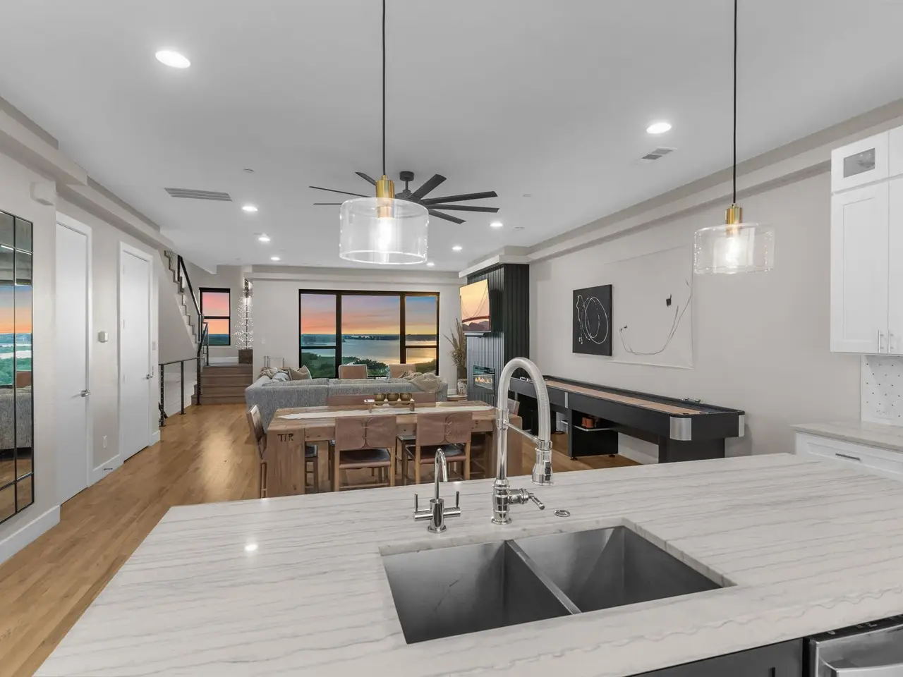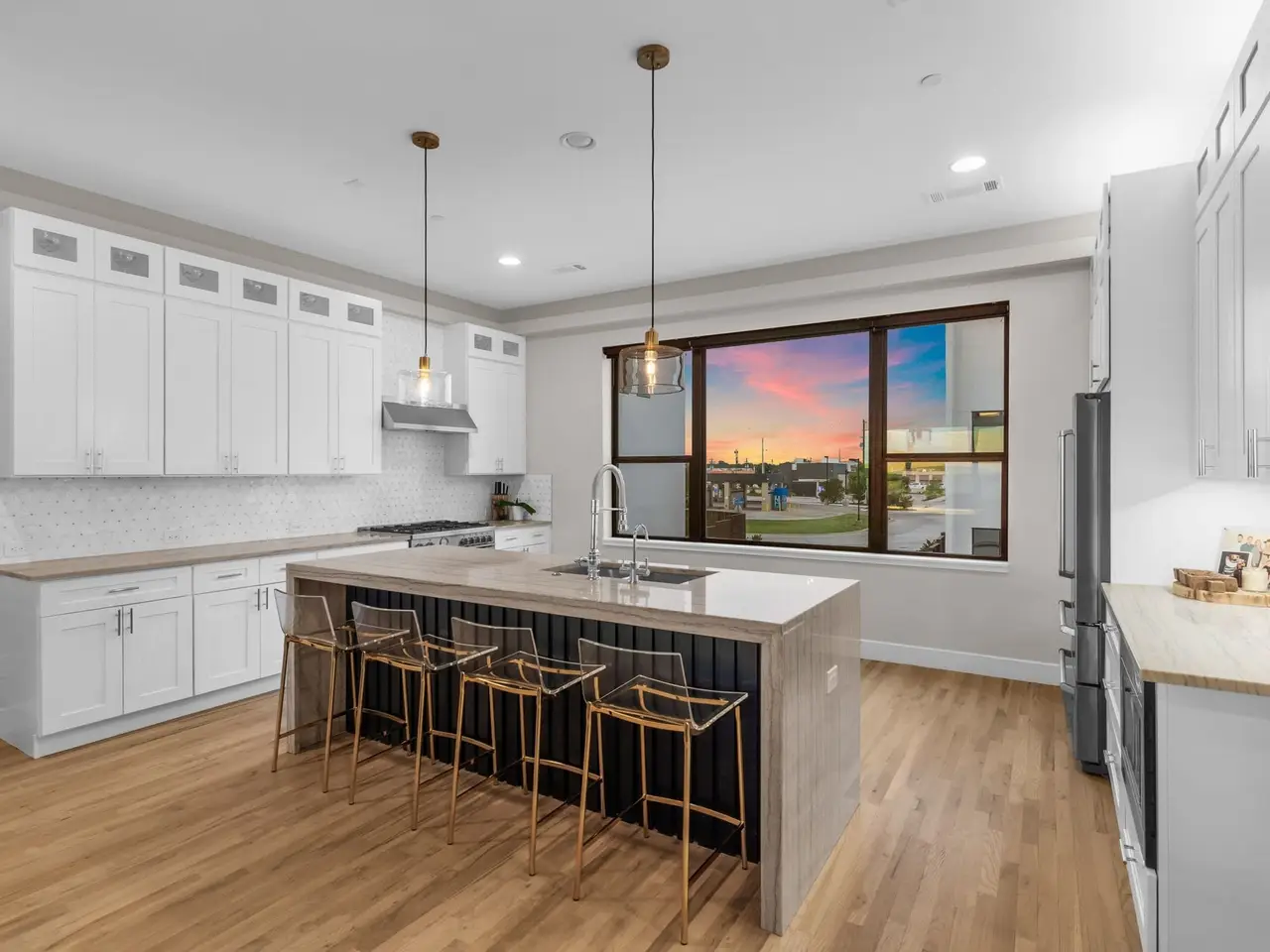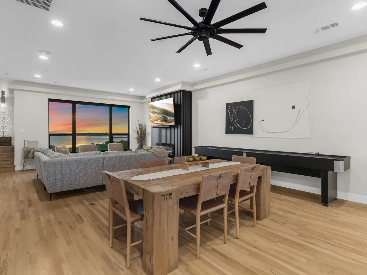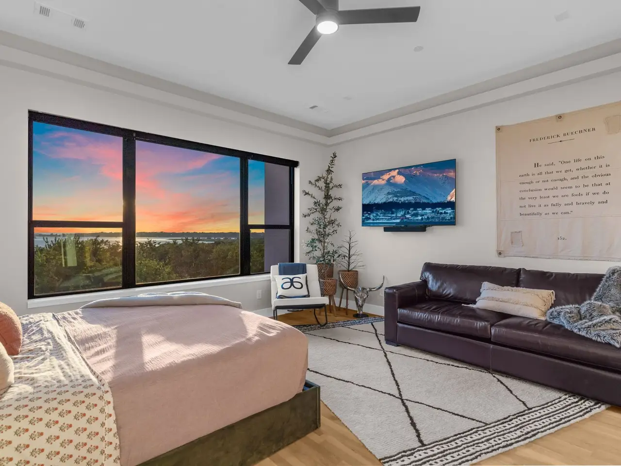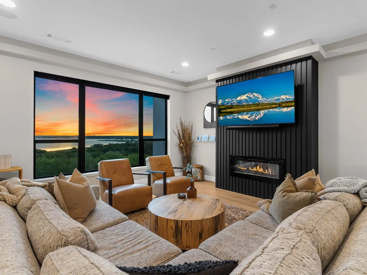 UNOBSTRUCTED BREATHTAKING VIEWS OF LAKE LEWISVILLE from all levels! STUNNING SUNSETS atop this low maintenance, lock and go lifestyle with your own ROOFTOP PATIO! This modern, three-story townhome is designed for those who love clean lines, natural light, and effortless indoor-outdoor flow. Every level of this home has purpose. The ground floor greets you with sleek concrete flooring, tall ceilings, and leads to a flexible space that can serve as a guest suite, office, or studio, complete with its own full bath and direct access to the private garage. The 2nd floor is for rest and retreat. The primary suite offers lake views and a spa-inspired ensuite bathroom, featuring a walk-in shower, free-standing tub, double sinks, lots of storage and a custom closet. A 2nd bedroom with an ensuite bath and walk in closet complete the level, along with a laundry space tucked neatly away. Upstairs, opens up to a spacious kitchen that anchors the heart of the home with custom cabinetry, quartz countertops, and high-end appliances - all within easy reach of the open dining and living areas. Natural light floods in through large picture windows, framing glimpses of the lake and beyond. But the crown jewel is above. Up one more flight, the rooftop patio is your own private escape. Outfitted for lounging, dining, or simply watching the world turn golden, this space offers panoramic lake views and sunsets that are truly magical. Glass railing keeps the view clear, and there's a tastefully designed outdoor kitchen complete with a grill, fridge and sink along with a fireplace, lounging area with a TV and room for a spa, prewired. Whether you're entertaining or unwinding, this townhome delivers modern living with nature and picturesque views from every window. Nothing between you and the lake but COE land with meandering trails and beautiful foliage. SMART HOME features and an ELEVATOR provide added convenience. Two miles to 121, 17 miles to DFW Airport, 5.5 miles to The Star, 3 miles to Grandscape, 9 miles to PGA.
