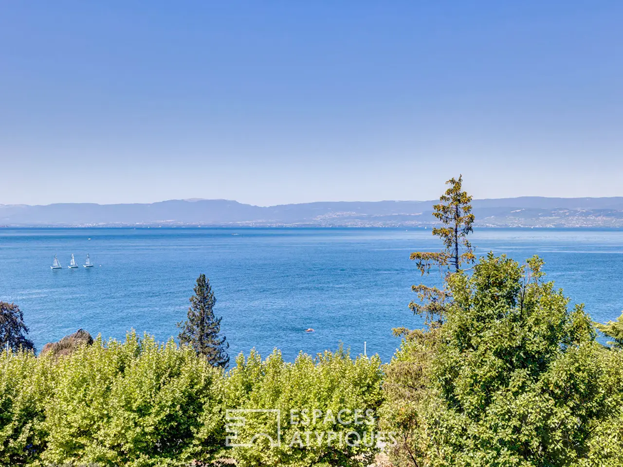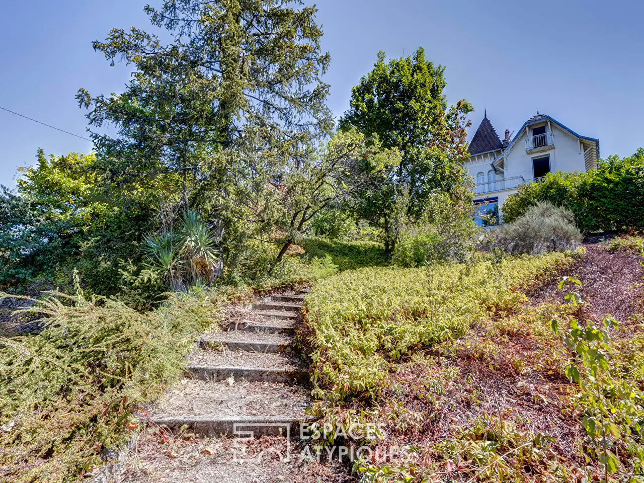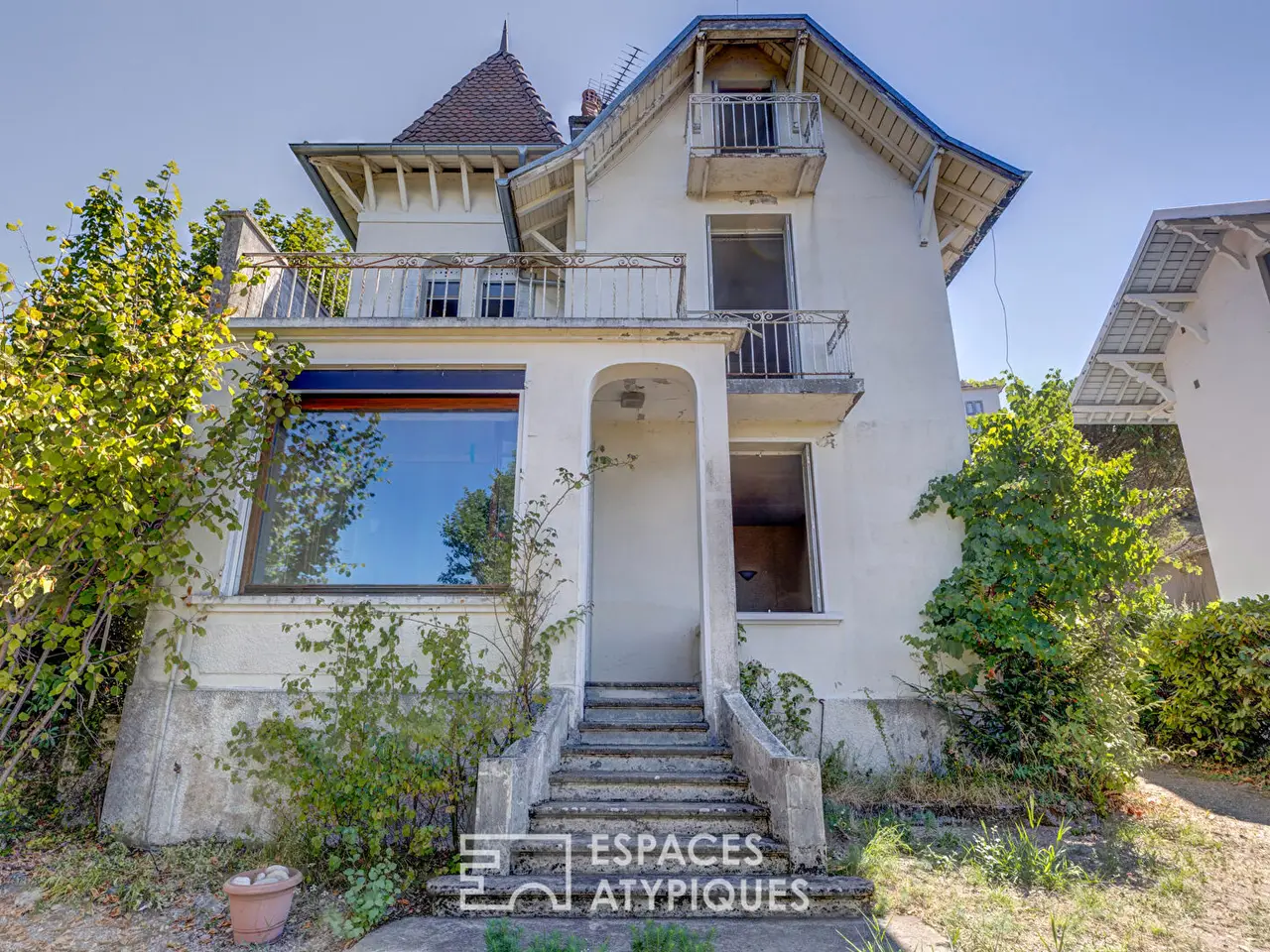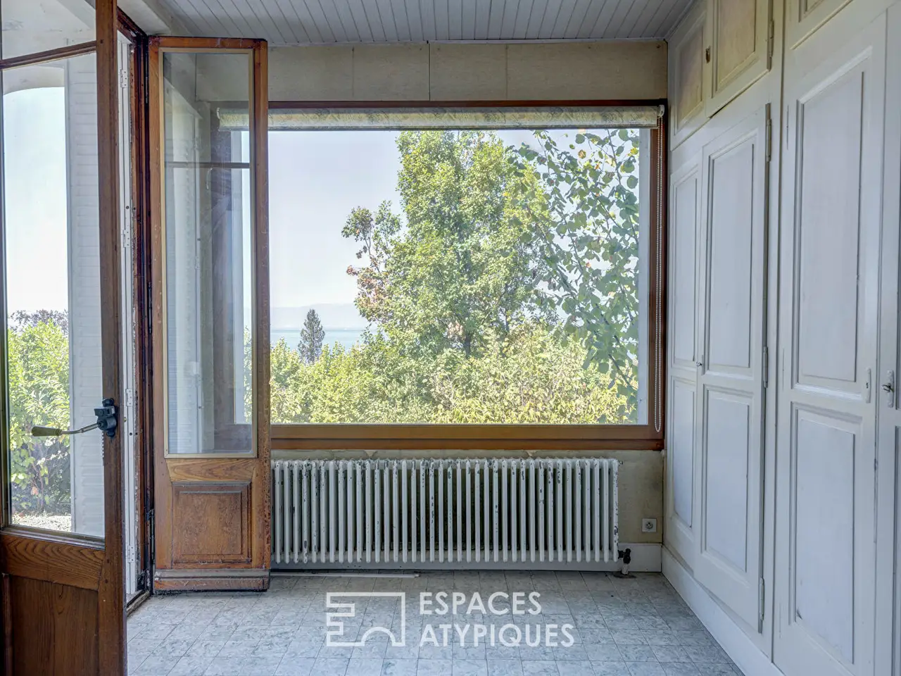 In a privileged setting, offering a breathtaking view of the lake, this characterful 1913 house boasts 104 m² of living space. It sits in a lush green setting on a 1,541 m² plot, featuring six levels of terraced gardens and a 49 m² annex comprising two apartments. From its gate, a garden staircase leads to the foot of the house, facing its porch, opening directly onto the living area. The main entrance leads, via a hallway, to a living room with a wood-burning stove and a separate kitchen with direct access to the garden. The upper floor houses two bedrooms facing the lake. One of them has a balcony extended by a terrace. A bathroom with a toilet and a laundry area complete this level. The top floor, with its attic, houses a bedroom with a small shower room and toilet and a balcony, enjoying a commanding view. A room located in the turret serves as an office, a dressing room, or even a fourth children's bedroom. Upstairs, an annex houses two independent apartments on two levels, each with a garden. The first level consists of a studio with a space that could be converted into a kitchenette adjoining a shower room and toilet. The second level opens, from its charming balcony entrance, onto a living room adjoining a bedroom. A wooden extension extends beyond and serves as a shower room and toilet. A cellar, a garden shed, and a garage of approximately 25 m² complete this idyllic location with undeniable charm. The property, facing a pleasant landscaped promenade, benefits from a second pedestrian access on the dominant part of the land. It is close to the lake and its marina, amenities, and public transport. This property, in need of renovation and protected by a protected conservation area, is part of the historical heritage of a remarkable complex, boasting architectural and landscape value from the 1930s. ENERGY CLASS: G / CLIMATE CLASS F: Estimated average annual energy costs for standard use, based on 2021 energy prices: between €2,330 and €3,220. Dwelling with excessive energy consumption. The law requires that the energy performance level of real estate, currently class F/G, be between class A and class E as of January 1, 2028. Information on the risks to which this property is exposed is available on the Georisques website for the affected areas: www.georisques.gouv.fr. REF. 1720EA Additional Information * 8 rooms * 5 bedrooms * 1 bathroom * 1 shower room * Land area: 1,541 m² * Property tax: €1,740 Energy Performance Assessment Primary energy consumption g: 426 kWh/m²/year Extremely efficient housing