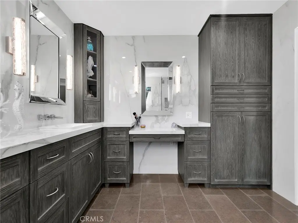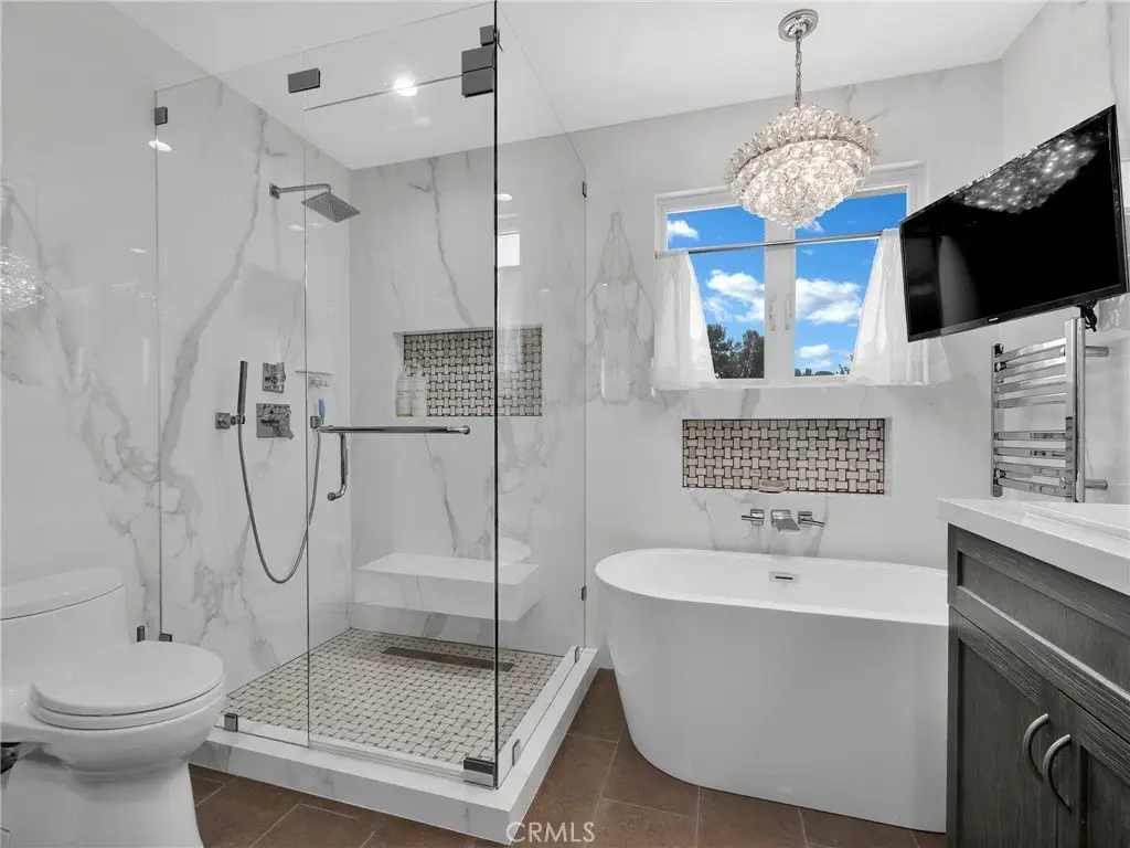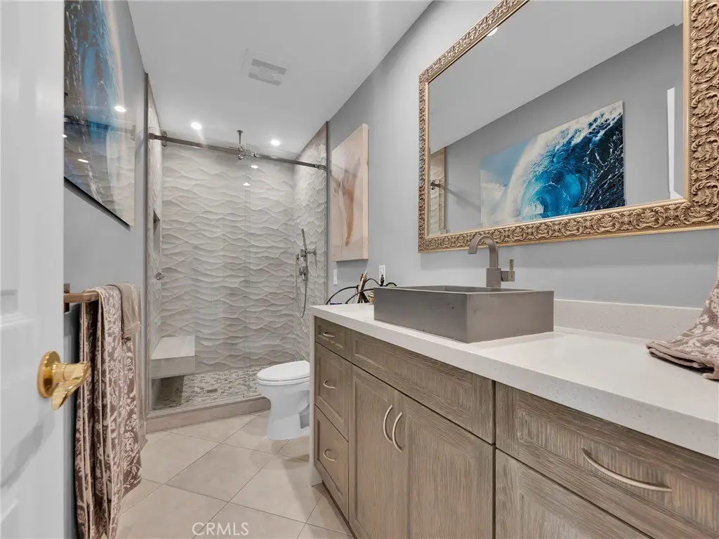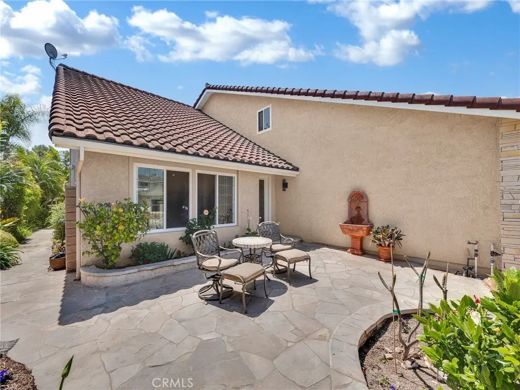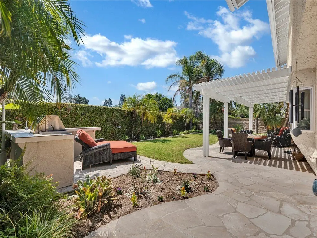 This elegant two-story home blends timeless sophistication with modern upgrades. Energy efficiency meets luxury with a fully paid-for solar system that keeps annual electric costs under $50. Featuring 4 bedrooms, 3 remodeled bathrooms, and a three-car garage, this residence is thoughtfully designed for both everyday comfort and stylish living. Enter through a charming courtyard entry into an inviting living and dining space adorned with travertine flooring. The heart of the home is the chef’s kitchen, showcasing a large center island, custom cabinetry, granite countertops, and a spacious walk-in pantry—ideal for entertaining. The open-concept family room is filled with natural light and includes a built-in flat screen TV. French doors lead to a private backyard oasis, complete with a built-in BBQ, custom patio cover, and room for a pool—perfect for summer fun and outdoor gatherings. Upstairs, retreat to the luxurious primary suite, where a 2022 remodel transformed the bathroom into a true spa experience. Highlights include soapstone floors, porcelain walls and counters, custom cabinetry, double sinks, freestanding soaking tub, oversized walk-in shower, designer fixtures, towel warmer, and an expansive walk-in closet. Two additional upstairs bedrooms share another beautifully remodeled full bath, while a main-level bedroom and bathroom (remodeled in 2022) offer a flexible space perfect for a home office, guest suite, or multigenerational living.