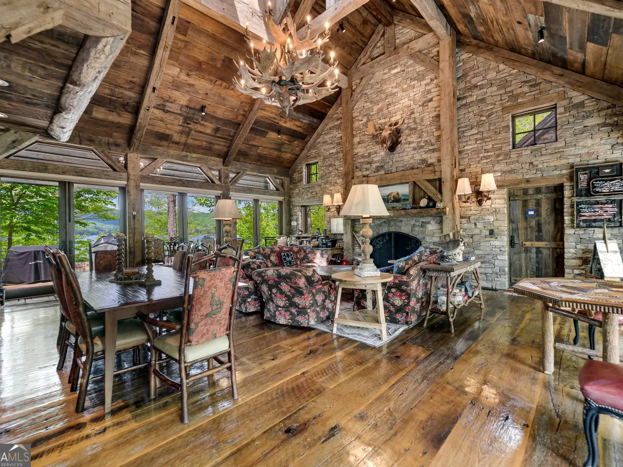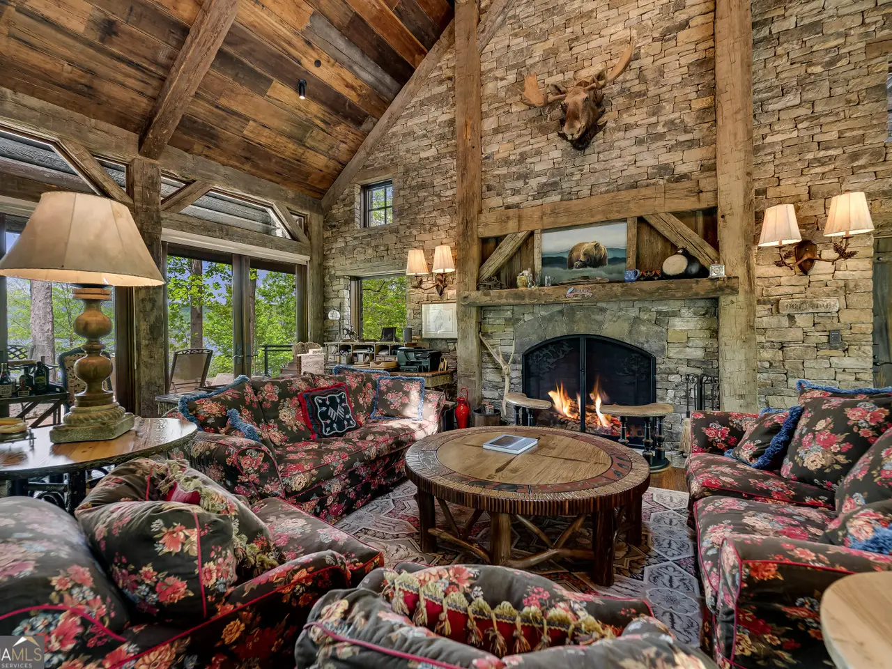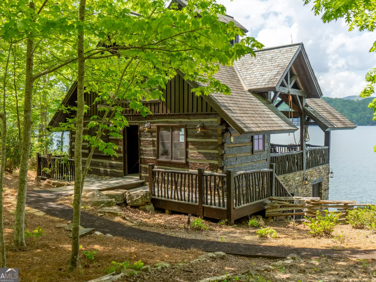 Once-in-a-Lifetime Private Island Estate on Lake Burton Discover the pinnacle of lakeside luxury with this extraordinary 6,186 sqft mountain lodge, perched on its own private island in the heart of Lake Burton's coveted big basin. Offering 360- degree lake and mountain views, total privacy, and Yellowstone-inspired rustic elegance, this one-of-a-kind estate redefines waterfront living. Crafted from reclaimed timbers sourced from Southern cotton mills, the residence exudes old-world craftsmanship and frontier charm. Hand-hewn oak siding with classic chinking, dry stack Tennessee fieldstone, rough-sawn wide plank oak floors, and steel structural supports anchor the home with strength and character. An elegant entry foyer welcomes you from two directions, showcasing east and west views through an open riser staircase with reclaimed treads and flagstone flooring. The soaring great room features lake views from 2 walls, a dramatic cupola, flanking fireplace posts reclaimed from Zachary Taylor Scott's historic home, and a moose antler chandelier complete with a buckshot hole. The chef's kitchen blends style and substance with black soapstone countertops, custom barn wood cabinetry, Viking 6-burner range, dual Bosch dishwashers, refrigerator drawers, custom soapstone sinks and two pantries. The private owner's suite features 3 walls of lake views, a barn wood clad vaulted ceiling and stone fireplace. Each guest bedroom offers unique views and details. The main floor provides 2 guest bedrooms, each with chinked log walls and a private bath. Upstairs, a clever bunk room offers access from 2 separate hallways with a full bath on each end. A large hidden pocket door opens to separate the space into 2 separate bunkrooms when desired. A library with a vaulted ceiling and lake views is currently styled as another guest bedroom upstairs. The terrace level offers a spacious yet cozy media room with a wall of bunk beds against the back wall, a kitchenette with a full fridge/freezer combo, range, sink and dishwasher and laundry room with sink. The gym was designed to mirror the upstairs bunk room, featuring full bathrooms on each end. This space could easily be converted into 2 separate guest bedrooms with the addition of a wall. Outdoors, expansive flagstone patios wrap the home offering views from all directions. Meandering trails of recycled tire wrap the Island, leading to the east wharf and swim dock, putting green, and west side 2-story, 2-stall covered boathouse overlooking one of the most epic sunset views on Lake Burton. Additional Details include: self-contained fire suppression system, copper-clad Kolbe windows, antique terracotta tile, LiteTouch lighting system, extensive security system, 1GB Fiber Optic Internet, slate roof, lightning rods, Generator, central vac. Proof of Funds required before showing. There are security surveillance cameras throughout the island. Do not attempt to access the property without listing agent being present.