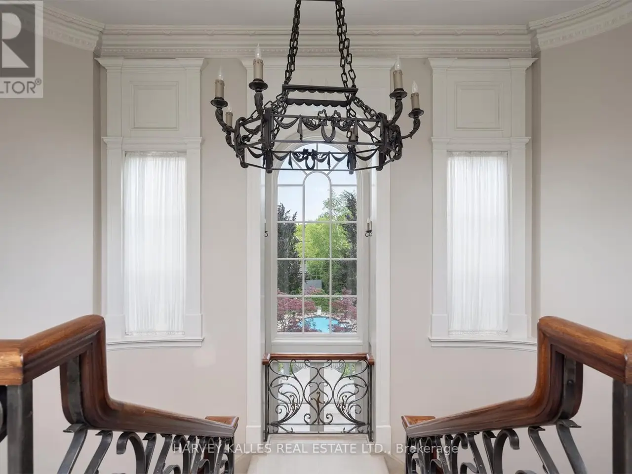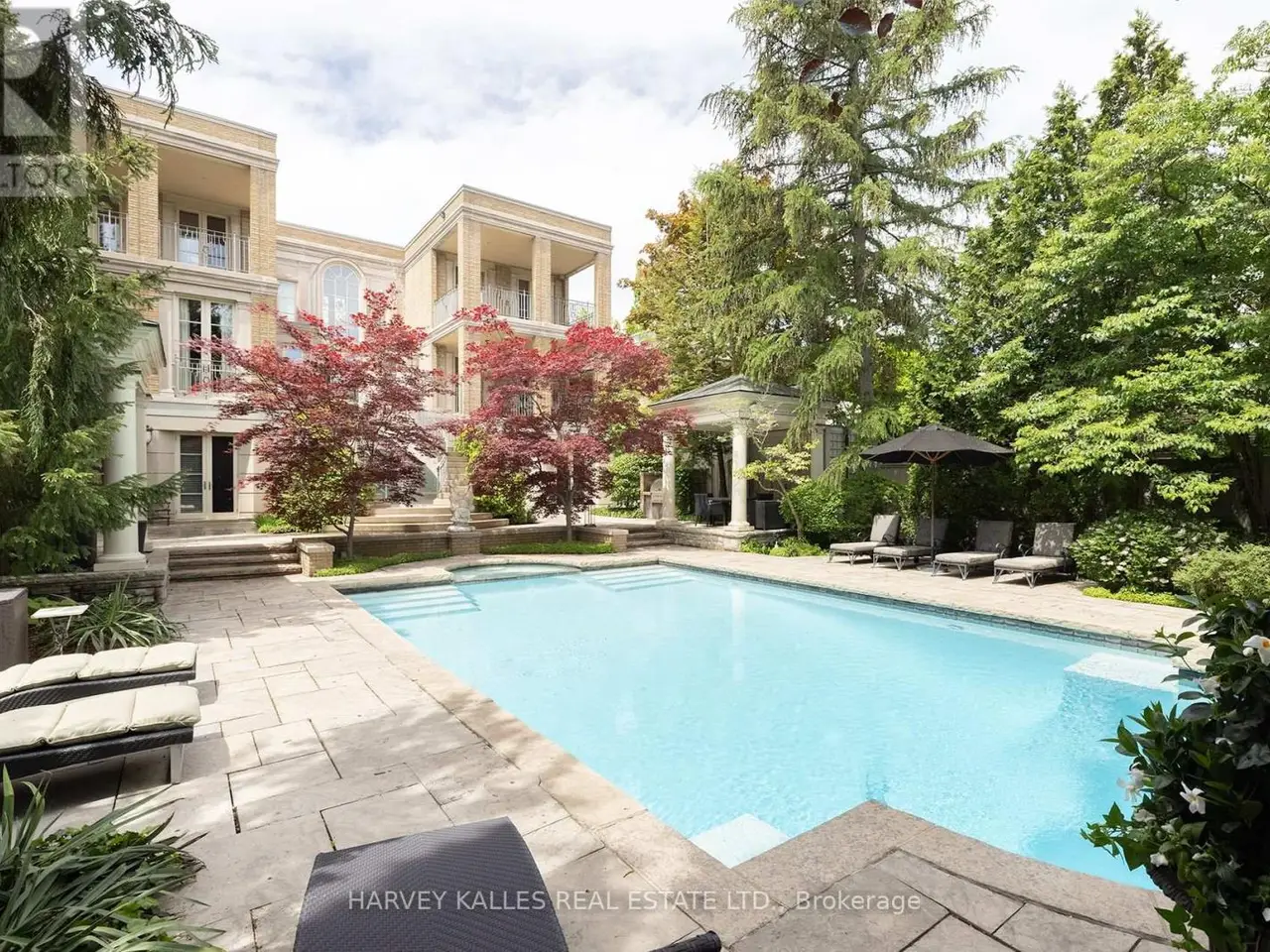 Majestically situated on one of Forest Hills most prestigious streets, this captivating residence masterfully designed by world-renowned architect Gordon Ridgely exemplifies timeless elegance and impeccable craftsmanship. Rooted in classical principles of symmetry, proportion, and balance, the home offers a remarkable blend of grandeur and comfort, ideal for both lavish entertaining and refined everyday living. A wealth of floor-to-ceiling windows, French doors, Juliette balconies, and multiple terraces bathe the interior in natural light, creating an airy, seamless flow throughout the living spaces. Exquisite finishes abound, including wide-plank mahogany hardwood floors and Indiana limestone flooring. The mahogany-paneled library, complete with a wood-burning marble fireplace, offers a warm and sophisticated retreat. A dramatic double staircase leads to the second level, where the serene primary suite features its own fireplace, a spacious walk-in dressing room, and walkout to a private covered terrace. The lower level is a haven for relaxation and recreation, boasting a full spa, entertainment and exercise rooms, and walkouts to beautifully landscaped gardens. Outdoor highlights include a charming gazebo, built-in BBQ, elegant fountain, and a stunning pool all shaded beneath a canopy of mature trees, providing an idyllic and private setting. An incomparable sense of privacy radiates timeless grace and charm, offering a sanctuary in the heart of the city. Perfectly positioned in an enviable location, this distinguished address places you within walking distance of Toronto's finest private and public schools, the boutiques and cafés of Forest Hill Village, premier recreational facilities, and just minutes from downtown and the financial district. (id:6370)