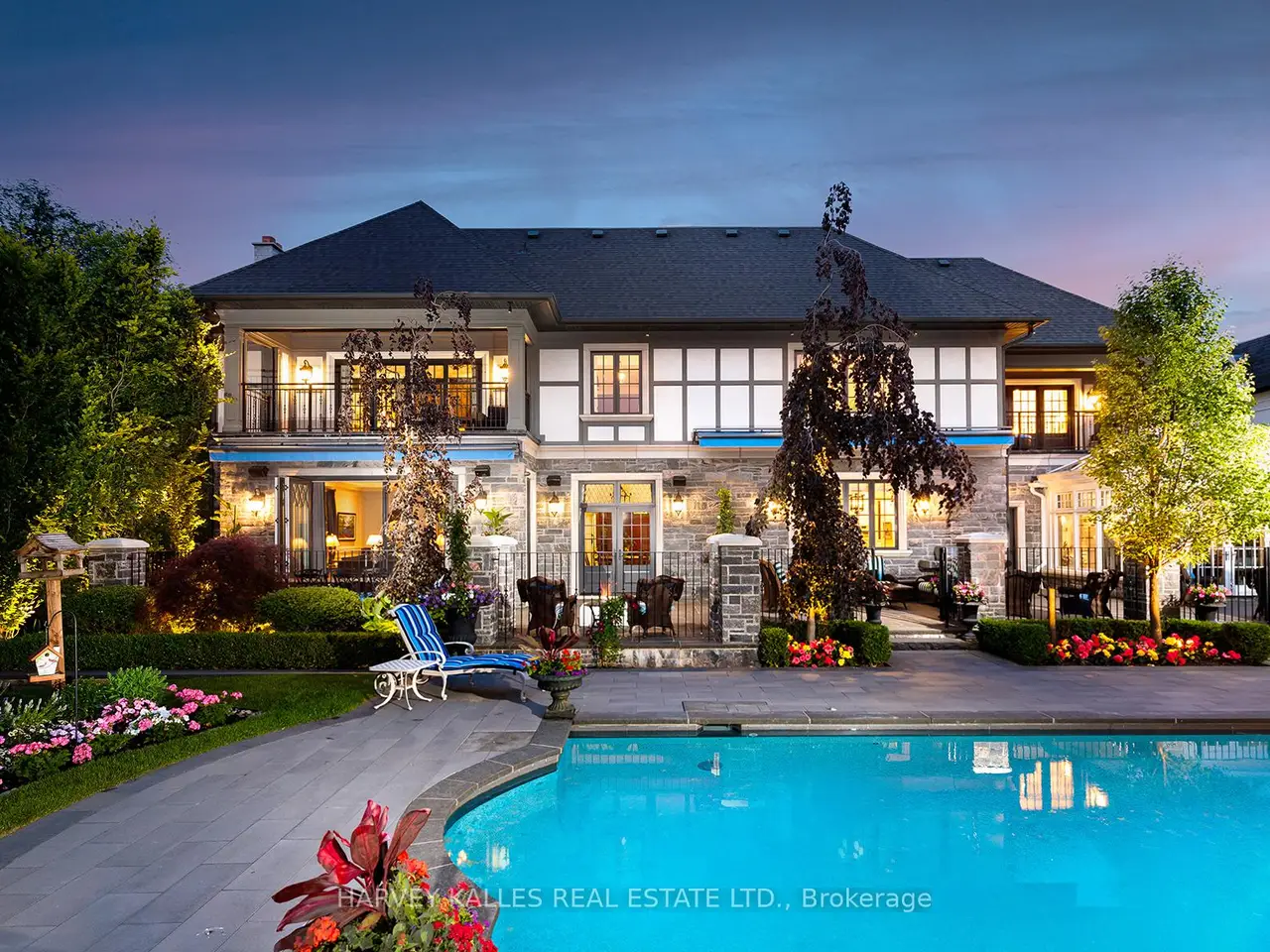 From vision to fruition, 8 Swansdown Drive stands as a truly unique and masterfully built residence. Every element was carefully chosen with intention, resulting in a home that exudes sophistication, comfort, and timeless beauty. Set on a secluded, lush lot in one of Toronto's most prestigious neighbourhoods, the property offers unmatched privacy. A grand circular heated driveway welcomes you and your guests with ease, while a three-car garage securely houses your most prized possessions. The striking freestanding waterfall and manicured gardens create an instant sense of calm and retreat from the city. Inside, the double solid-oak doors open to a breathtaking two-storey foyer with soaring ceilings and open sightlines to the stunning rear gardens. The elegant living room features a wood-burning fireplace and retractable Floridian-style glass doors that open to a stone patio for al fresco dining. The sun-drenched kitchen and breakfast room overlook the lush grounds, while the formal dining room connects via a butlers pantry. The garden solarium is perfect for nurturing plants year-round. Additional main floor highlights include a cheerful office, art studio with water access, and a one-of-a-kind octagonal library with handcrafted detailing, a ceiling medallion, and hidden staircase. The second floor is accessed by a sweeping staircase or a wrought-iron Parisian-style elevator. A skylit hallway leads to four generous bedrooms, each with its own ensuite. A separate two-piece bath, laundry room, and pet spa complete this level. The lower level offers an impressive array of spaces: gym, yoga room, sauna, rec room, large storage, study, soundproof music room, guest suite, and more. Outdoors, enjoy over a million dollars in landscaping, a chlorine pool, fire pit, two covered pavilions (one with bar and bath), and stone pathways weaving through a magical setting. A rare offering. Welcome home.