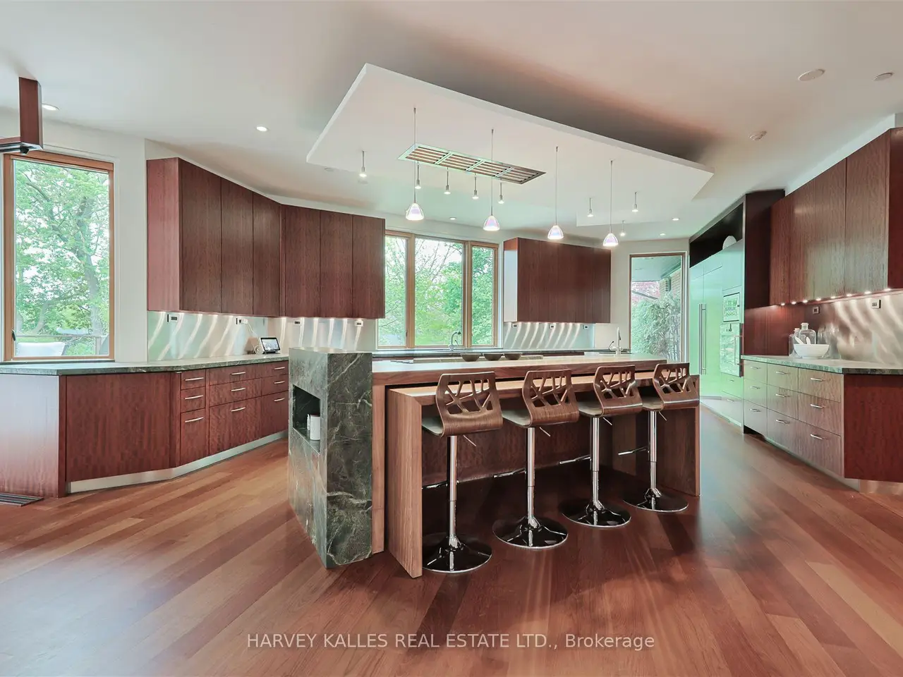 Discover a gem, custom-built as a multi-generational home, offering over 11,000 sq ft of luxurious living space on a rare 125ft double lot at the edge of the Humber Valley in the tree-lined Kingsway neighbourhood. This residence is a statement of contemporary elegance and sophistication, perfect for the discerning family. Inside, experience clean lines and exquisite details that enhance comfortable luxury living, including sound-isolated suites, Jatoba hardwood floors, stunning Persian serpentinite kitchen countertops, and heated stone floors for ultimate comfort. Accessibility is a key feature, with snow melt for the front porch, steps, ramp and driveway, a commercial 4x6 ft elevator, and 4 ft wide hallways to ensure effortless movement throughout the residence. The ground floor features a bright, open-plan living area that seamlessly integrates the chefs kitchen, dining, and living spaces, extending to a partially covered upper deck with a 17ft wide opening. A heated 3-car garage is cleverly positioned at the side of the house. The primary retreat is where luxury meets tranquility, featuring two generous walk-in closets and two ensuites one complete with a massage room and whirlpool tub offering tree-top views. Two additional spacious bedrooms, each with walk-in closets, share a thoughtfully designed bathroom suite with dual sinks, ample storage, and a separate area for added privacy. The oversized fourth bedroom also includes its own ensuite bathroom and walk-in closet, providing comfort and convenience for family or guests. The ground floor bedroom suite with a Juliet balcony offers a perfect retreat for guests. Venture to the finished lower level, where 10+ ft ceilings create a light and airy ambiance. This expansive space features a wide sliding door leading to the lower deck, ideal for entertaining. With multiple entertainment areas, including a stepped home theatre and sprawling park-like backyard, this home is designed for those who appreciate spacious comfort.