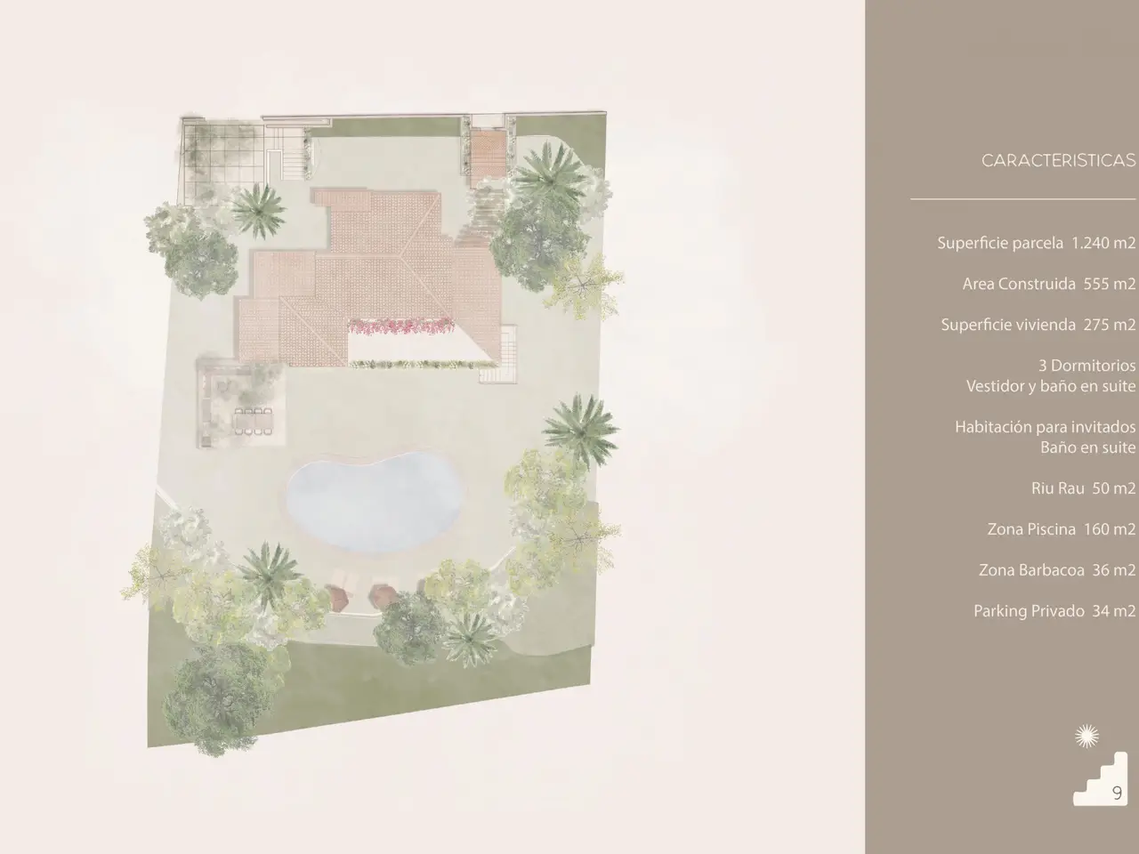 This exclusive Mediterranean-style villa is located in the prestigious El Tosalet residential area in Jávea, Alicante, surrounded by Mediterranean pines and south-facing to make the most of the sun’s warmth. The property, known as Casa Xaloc, stands out for its vernacular architecture, using noble materials and lines that respect local tradition, giving it a natural harmony with its surroundings and an authentic Mediterranean lifestyle. The villa has a built area of 555 m², of which 275 m² correspond to the main residence, set on a spacious 1,240 m² plot. It offers four bedrooms, three of them with walk-in closets and en-suite bathrooms, and a guest room also with a private bathroom, ensuring privacy and comfort for all residents and visitors. The home includes a smart home system, air conditioning, aerothermal heating, and video intercom, guaranteeing maximum comfort and energy efficiency. On the main floor, you will find the living room with access to the naya-Riu Rau, dining room, and kitchen, with access to the laundry area, as well as a guest toilet and a bedroom with a walk-in closet and en-suite bathroom. The first floor features the sleeping area with two bedrooms, each with a walk-in closet and en-suite bathroom. Both have access to the terrace overlooking the garden. On the lower floor, there is an independent guest room with an en-suite bathroom, a barbecue area with an outdoor kitchen, and a dining area. This floor has direct access to the garden. Outside, the property offers an impressive 160 m² pool area with views of the countryside and mountains, surrounded by a well-maintained private garden. The space is complemented by several terraces, both covered and uncovered, a 36 m² barbecue area ideal for outdoor gatherings, and a traditional 50 m² Riu Rau that adds character and functionality. In addition, there is a private parking area of 34 m². The location is unbeatable, with proximity to services, transport, shops, the town center, the port, golf courses, and the beaches of Jávea. The kitchen is fully equipped and the home has a laundry room, ensuring everyday convenience. Casa Xaloc represents a unique opportunity to enjoy the serenity, tradition, and quality of life offered by the Costa Blanca.