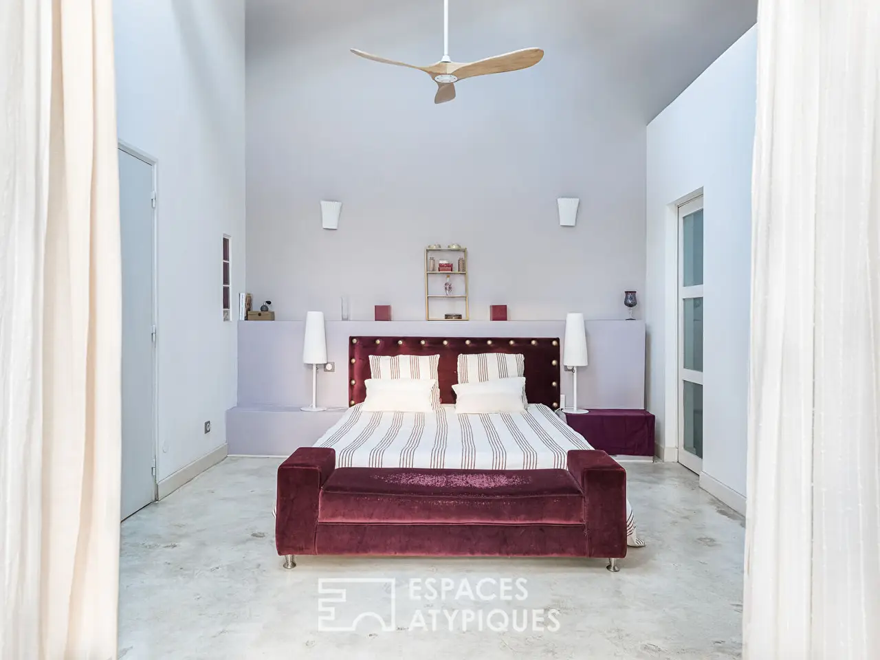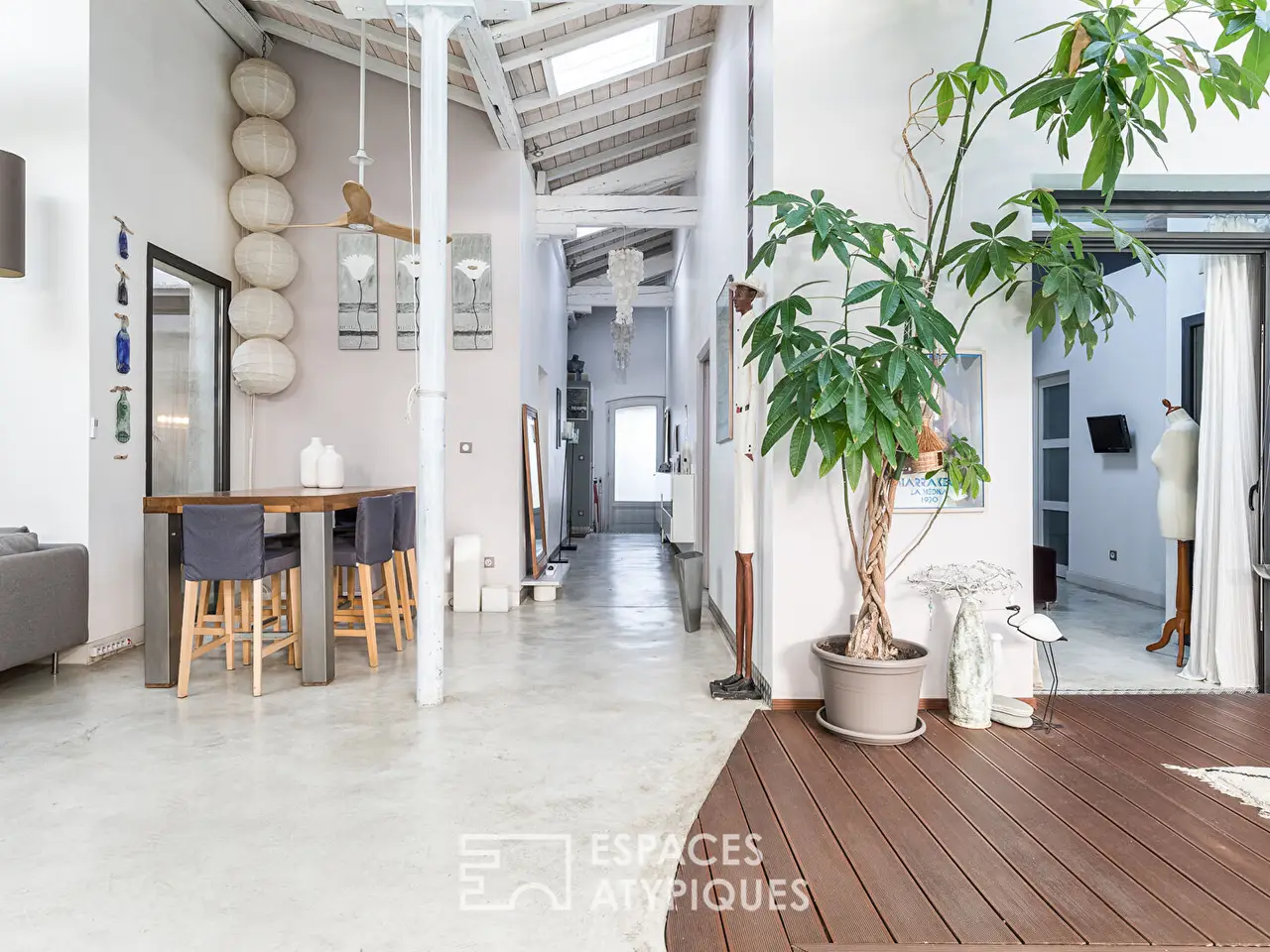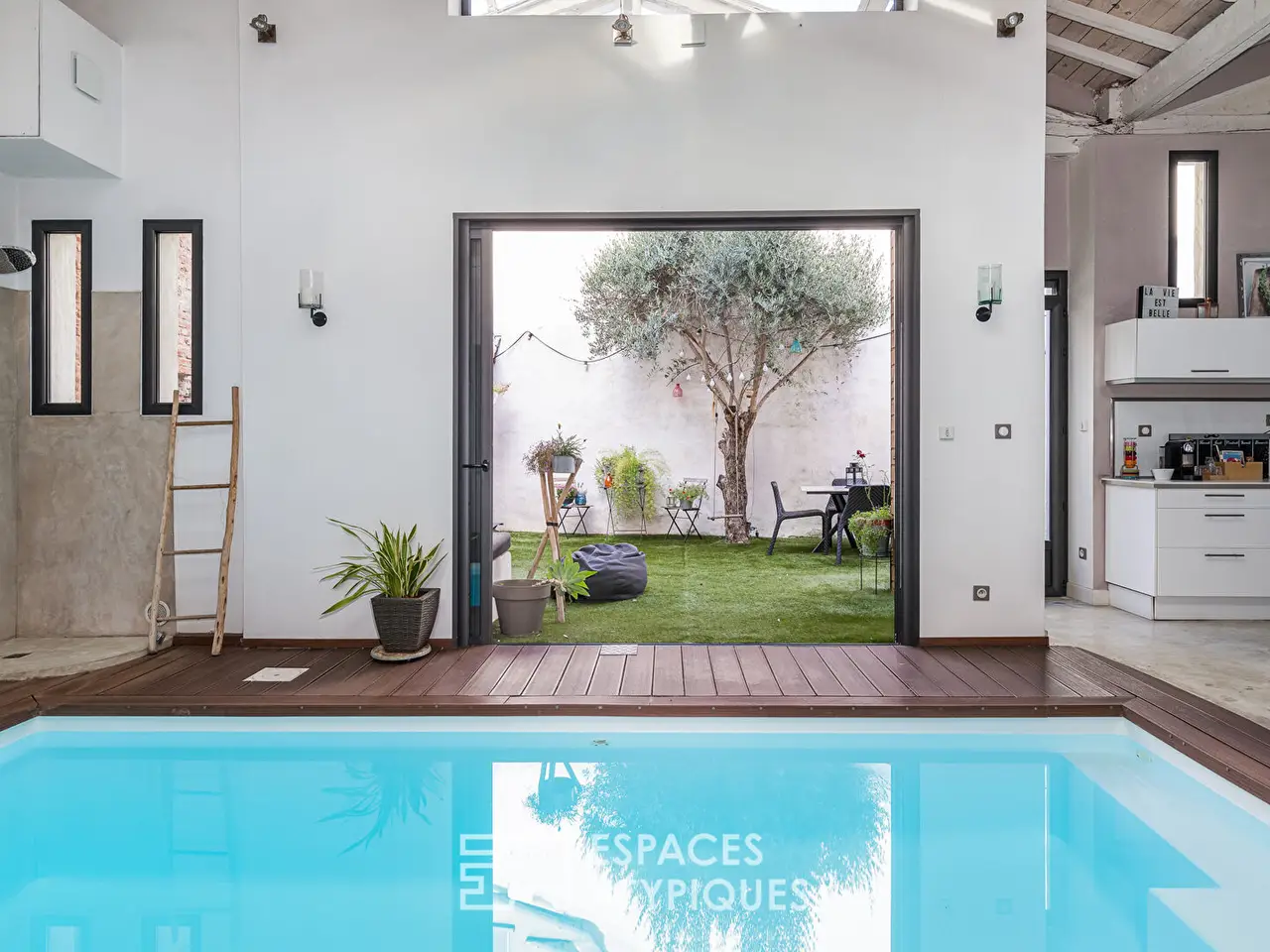 This old boilermaking factory in the heart of Amidonniers, a popular Toulouse district, was completely renovated in 2009 to create a magnificent 220m2 loft and a completely independent 35m2 T2. The main apartment offers a large living room, with a cathedral living room, of 110m2. It is built around an open kitchen, a dining room, a living room with fireplace and an indoor swimming pool. This sublime space combines modernity with a concrete floor and contemporary decoration with the remains of the past by having preserved the imposing wooden frame. All bathed in light through the large roof windows and opening onto an intimate terrace without any vis-à-vis. This loft offers 4 bedrooms. The guest room is accessible from the entrance to give it maximum privacy. Then a corridor leads to 2 other mirrored bedrooms, with the beds on mezzanines. They are linked around a shared bathroom and a patio. Finally the master suite which opens directly onto the swimming pool and the garden. This property is added to a completely independent T2 apartment, which can thus provide rental income. - Laundry room - Garage - 2 parking spaces in front of the house - 5×3 bromine swimming pool with counter-current swimming - Underfloor heating - Heat pump REF. 8450 Additional information * 6 rooms * 4 bedrooms * 3 bathrooms * Outdoor space : 420 SQM * Parking : 2 parking spaces * Property tax : 1 736 €