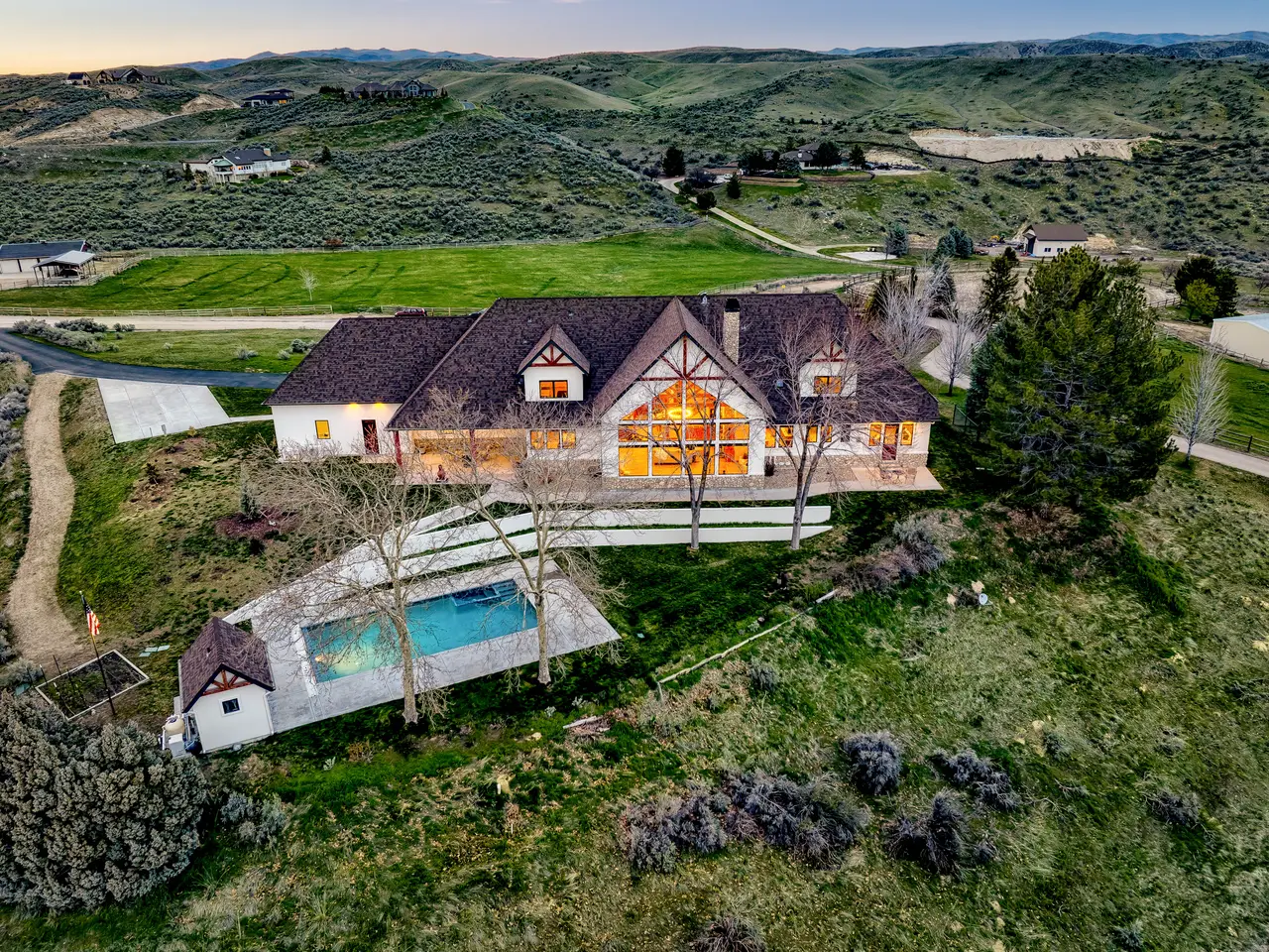 This rare 5 acre estate boasts incredible 360-degree views of the Treasure Valley, including the Owyhee mountains, and Bogus Basin is nestled at the end of a cul-de-sac to ensure privacy and tranquil living. High-end wood flooring and finishes are abundant throughout this sprawling craftsman home with an airy open floor plan. The gourmet chef’s kitchen features high-end appliances, ample storage and a large walk-in pantry. The main-level primary boasts a gas fireplace, heated flooring in the en suite, and a private patio. Floor to ceiling fireplace and windows in the great room, an expansive, climate-controlled garage and ventilated indoor, soundproof gun and archery range round out the unique amenities of this estate in the foothills. Enjoy the covered patio overlooking the in-ground pool and spa, complete with a pool house with a half bath. The RV parking is equipped with full-service hookups. Rest easy knowing your view will never change as all neighboring lots have been developed. Enjoy true Idaho living.