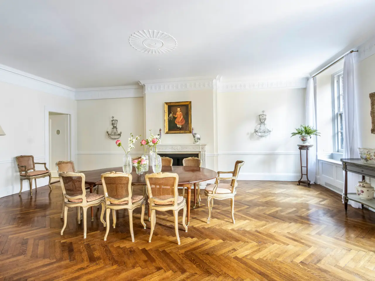 Ideally located in one of Park Avenue's finest prewar cooperatives, at the corner of 72nd Street, this extraordinary 14-room residence has massive proportions and 100-feet of Park Avenue frontage. Designed by renowned architect Rosario Candela, the residence offers grand scale rooms with a graceful layout accentuated by magnificent original architectural elements. Resplendent with glorious light streaming in from 25 windows, the sprawling home spans all four exposures. It has soaring ceilings enhanced by traditional moldings and tall doorways; pristine hardwood flooring may be found throughout. A private elevator entry opens to a vast 29-foot-by-12-foot gallery, providing an impressive introduction to the home. The gallery opens onto a grand corner 33- foot corner living room with herringbone flooring and a wood-burning fireplace. The living room's western window captures a peek of Central Park in the distance. Enhanced by custom wood-working and custom built-ins, the 20-foot library faces Park Avenue and has a wood-burning fireplace. There is a gracious and inviting 25-foot formal dining room with a fireplace and two large windows facing 72nd Street. A sprawling 28 x 17 Eat-in-kitchen has open views northward over landmarked townhouses. The kitchen photos shown reflect an example of the renovation potential of this impressive space. An enormous staff wing consisting of five small individual bedrooms is located off of a separate corridor leading northward from the kitchen. This wing could be re-configured as additional primary bedrooms, or as a large den/media room off of the eat-in-kitchen. The main bedroom wing of the residence includes four oversized bedrooms, each with an en-suite bathroom and ample closets space. Three of the four bedroom suites have beautiful views over Park Avenue, and the fourth bedroom has open city views to the east, overlooking landmarked townhouses below. Built in 1927, the limestone and brick Italian Renaissance building is one of the most distinctive buildings on Park Avenue. Residents of this prestigious white-glove cooperative enjoy the highest levels of service and privacy, as well as a recently renovated and enlarged gym. There is a 3% flip tax payable by the purchaser. The building now permits up to 50% financing, and heavy renovations may be done during the six month period between April 1 and October 1.
