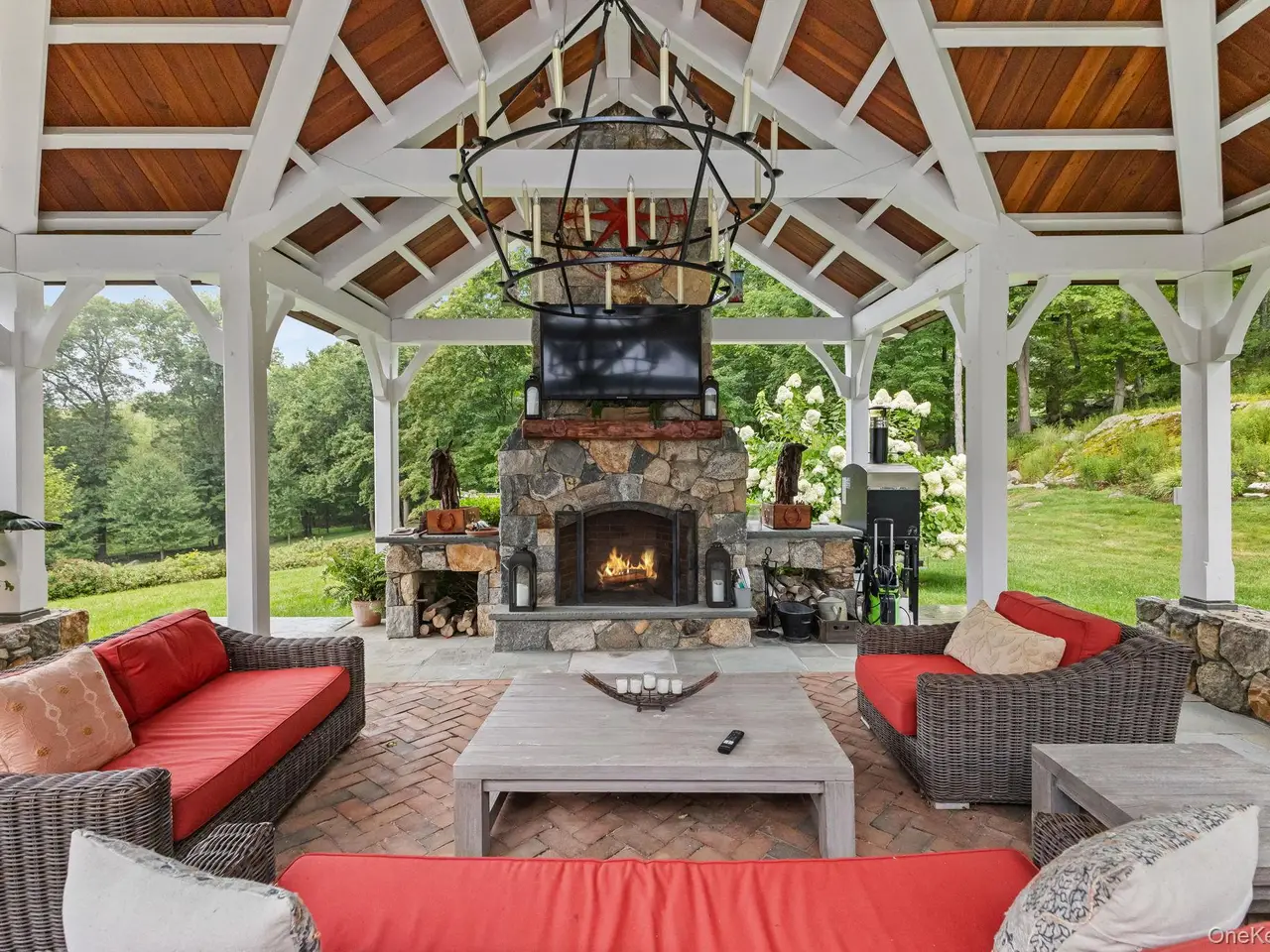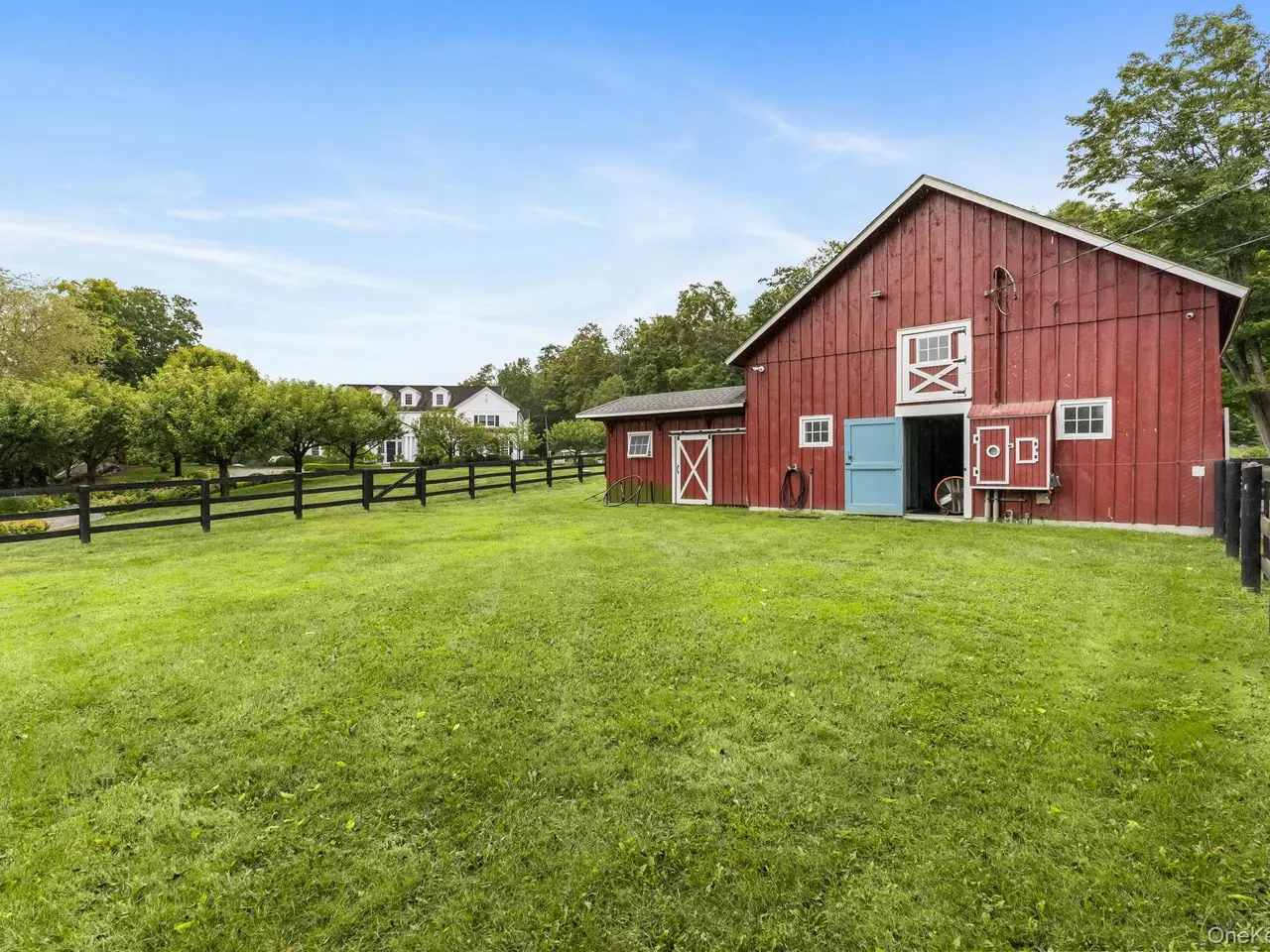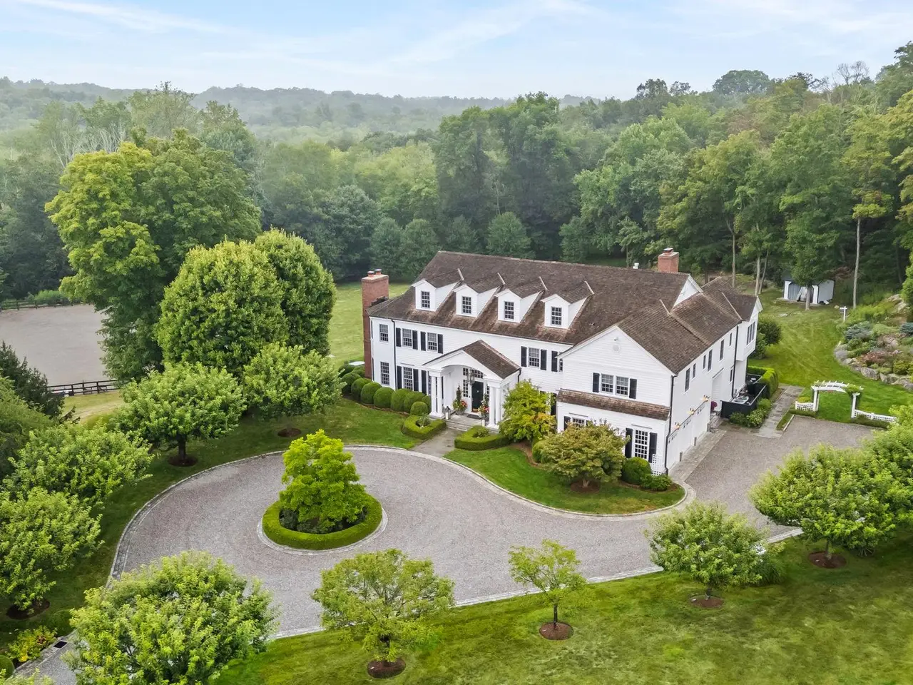 Olympic Hill Farm - A rare and remarkable estate nestled on 20 breathtaking acres in the heart of historic Guard Hill. A gated Belgian block-lined drive leads to park-like grounds with mature trees, gardens, and sweeping lawns. Every inch of this home reflects exceptional craftsmanship, from wide plank oak floors and coffered ceilings to elegant millwork and French doors. The grand two-story foyer opens to formal living and dining rooms, a stunning library and fireplace, and a state-of-the-art Christopher Peacock kitchen featuring La Cornue, Wolf, Sub-Zero, and Miele appliances, plus marble and copper finishes. Spacious family rooms on both levels, each with fireplaces, offer refined comfort. The luxurious primary suite includes a fireplace, dressing room, spa bath, and Juliet balcony. Five additional ensuite bedrooms (including one on the main level). Lower level offers a custom wine cellar and tasting room with fireplace, theater, golf simulator, and dog spa. Equestrian facilities include an 8-stall stable with direct Bedford Riding Lane access, four paddocks, and an arena. Outdoor highlights: fireplace, patios, pergola, gardens, English greenhouse/potting shed, putting greens, and trails. Prime location near trains, highways, schools, and dining.