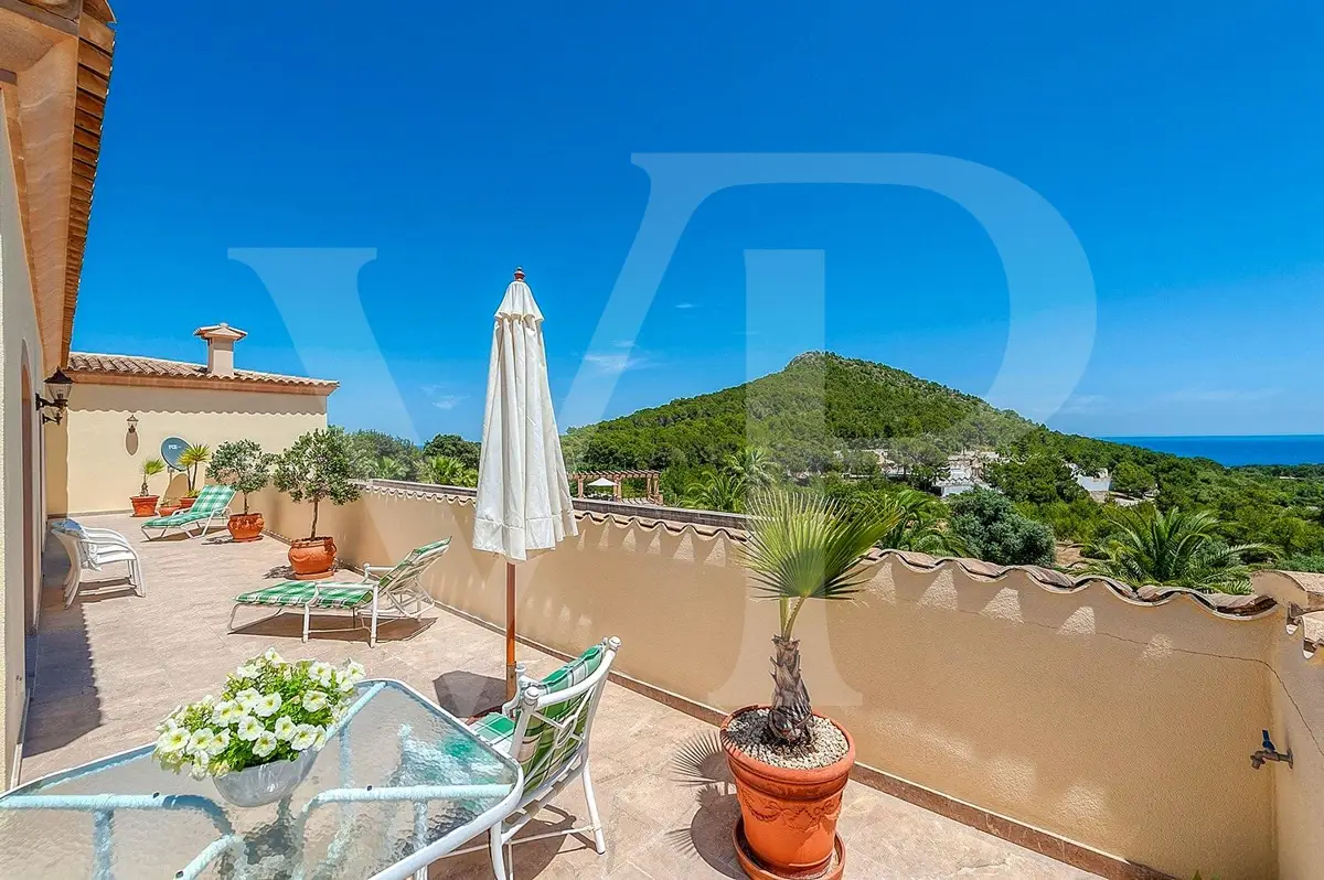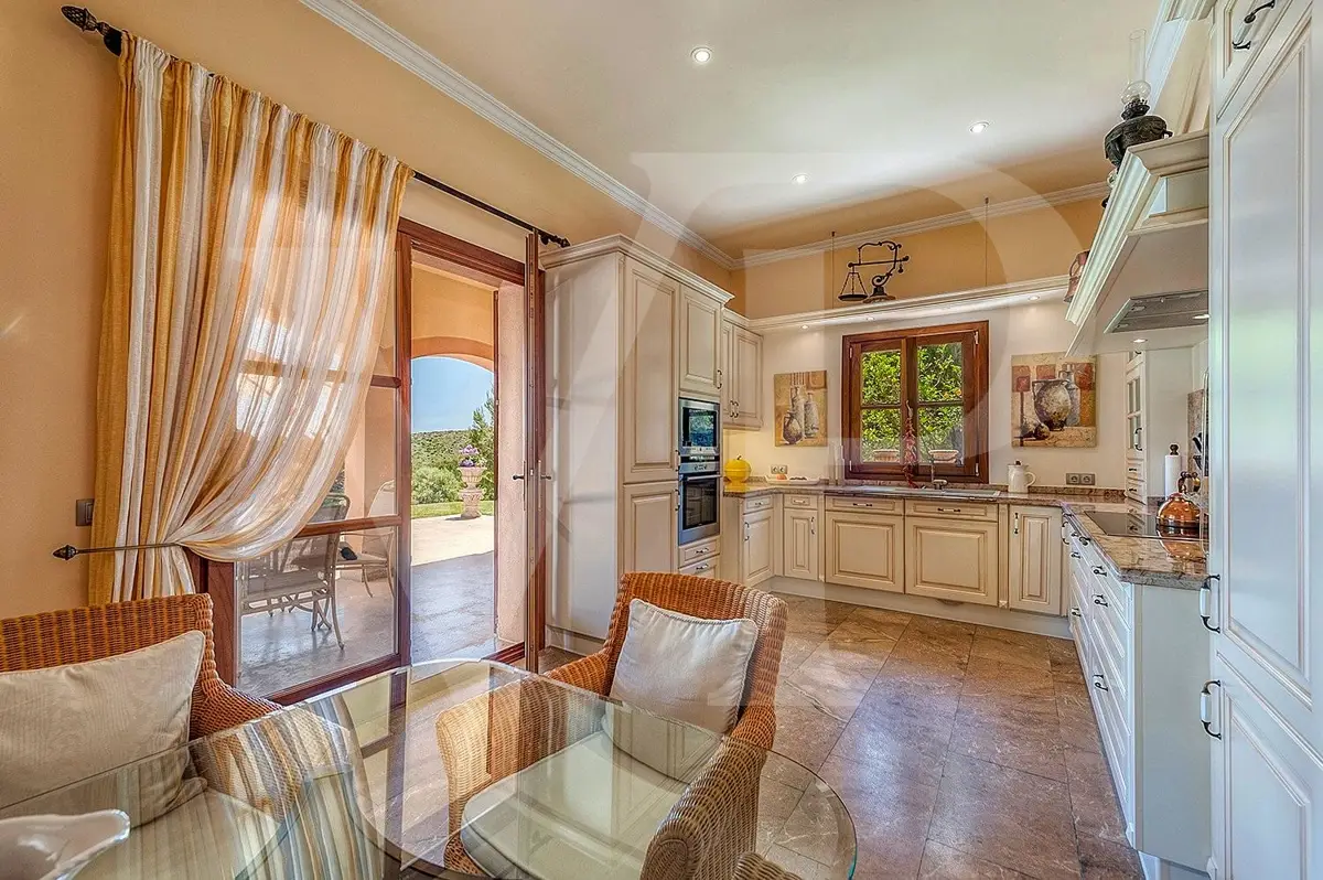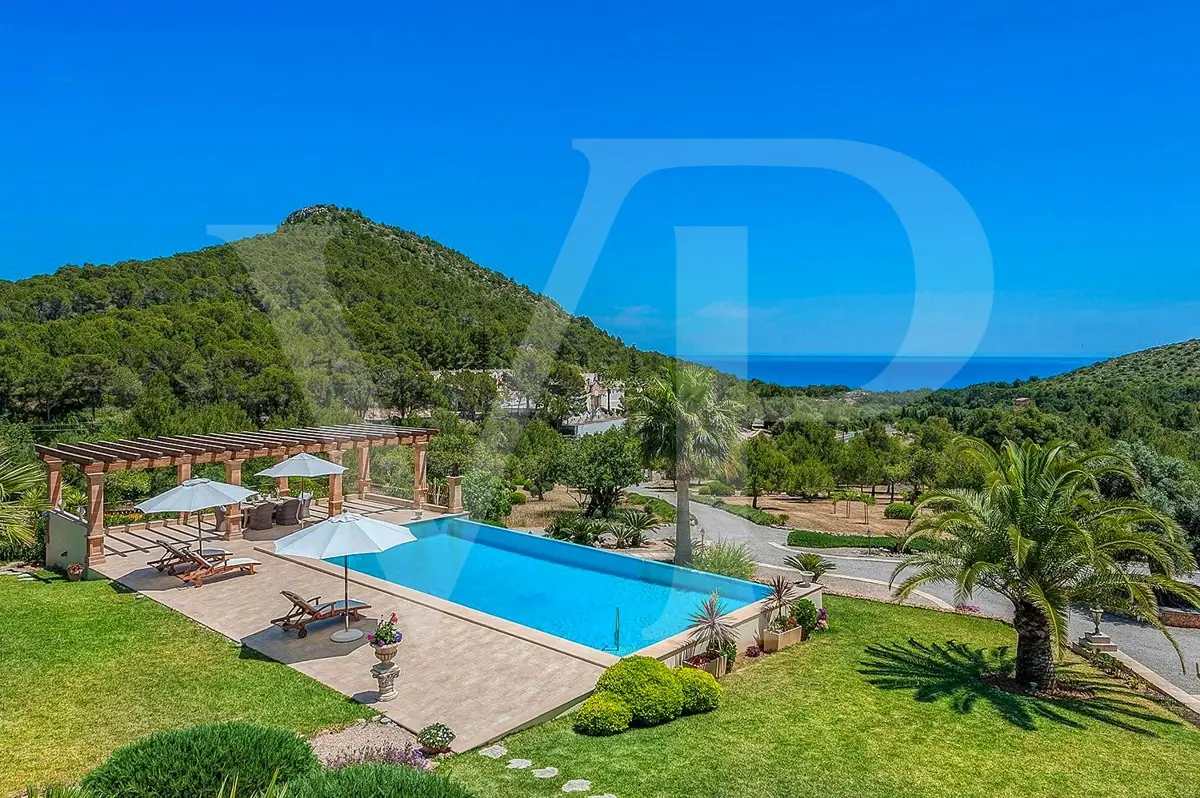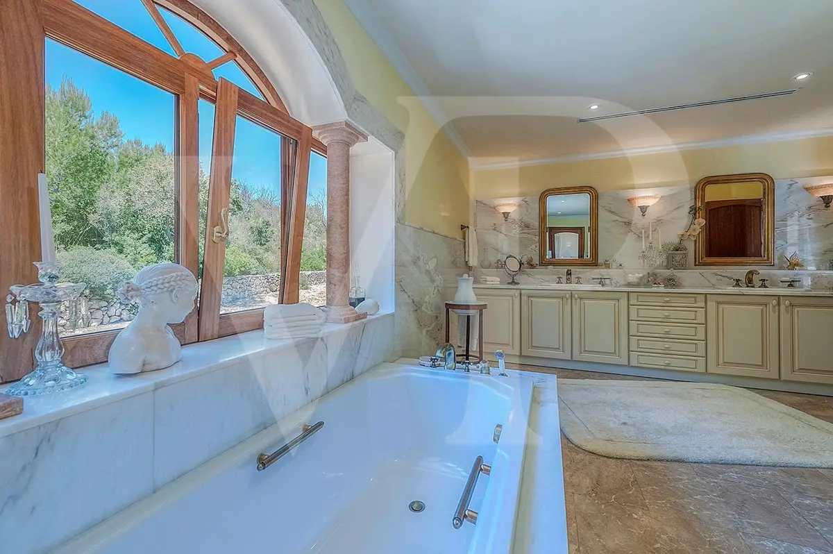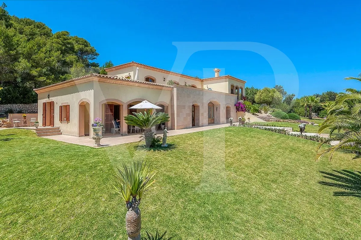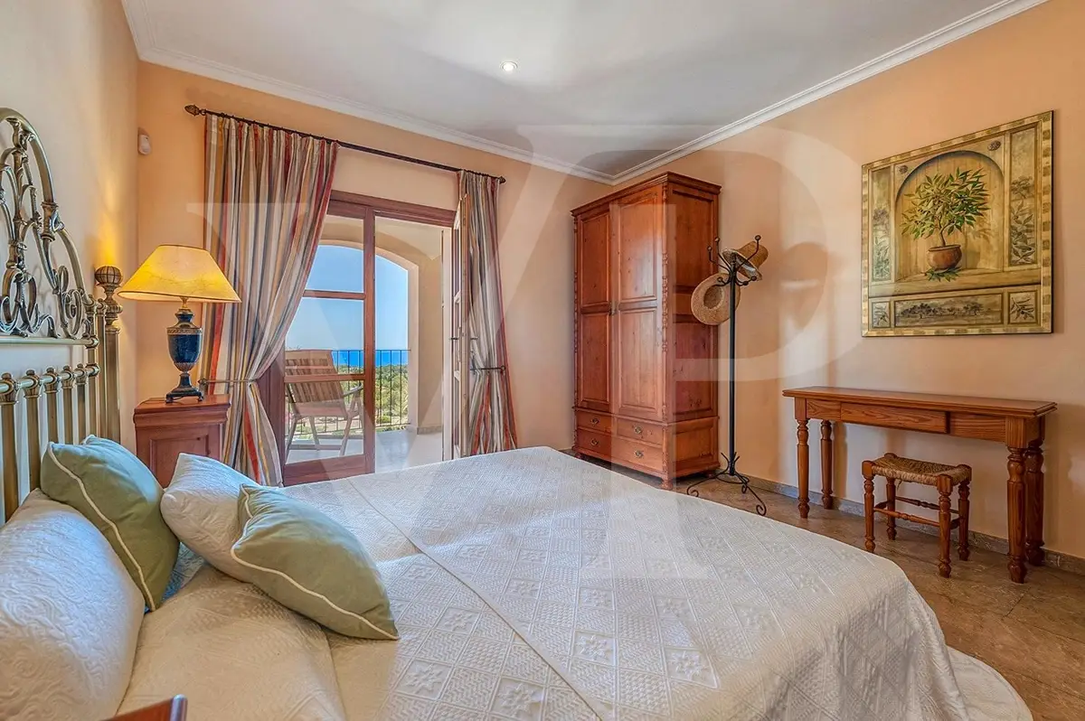 This wonderful finca property in Capdepera on the north-east coast of Mallorca is located on an 18.6 hectare plot with fantastic views and overlooking the sea. It was built in 2009 according to the owners' specifications in high quality and with a lot of charm. The finca with the main house and a separate guest part has a living space of 350 m2, which has two floors and is divided into five spacious bedrooms, four marble floors, a guest toilet and an additional bathroom. On the lower level there are spacious living rooms with a fireplace, a fully equipped kitchen-living room with dining table and an additional fitted kitchen. From the various covered terraces you can access the park-like garden and the large saltwater pool with beautiful sun terraces. The house has oil central heating, fireplace, marble floors, own well, electricity connection and much more. This high-quality property on Mallorca is located on the edge of a nature reserve but is only a few minutes walk from the town center of Capdepera. The town of Cala Ratjada with its many restaurants, boutiques, bays and the harbor can be reached in a few minutes by car. There are also many well-known golf courses in the immediate vicinity. An absolutely attractive property in a wonderful location on Mallorca.