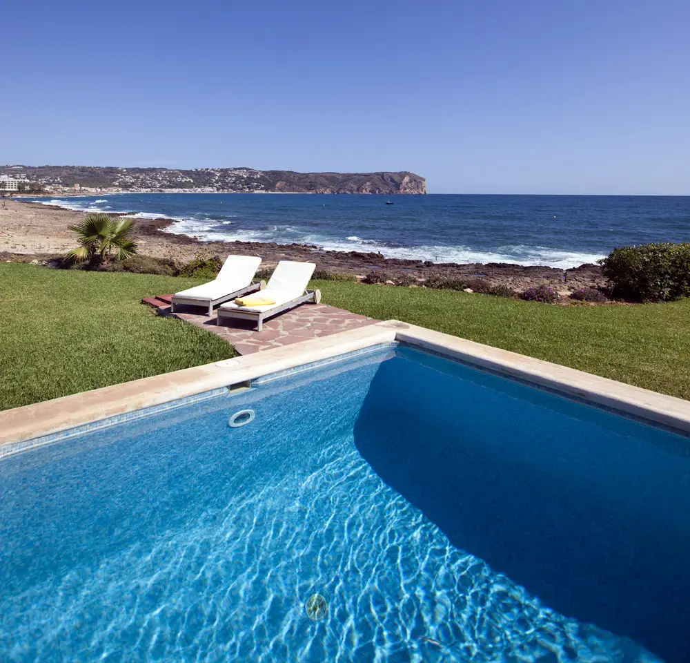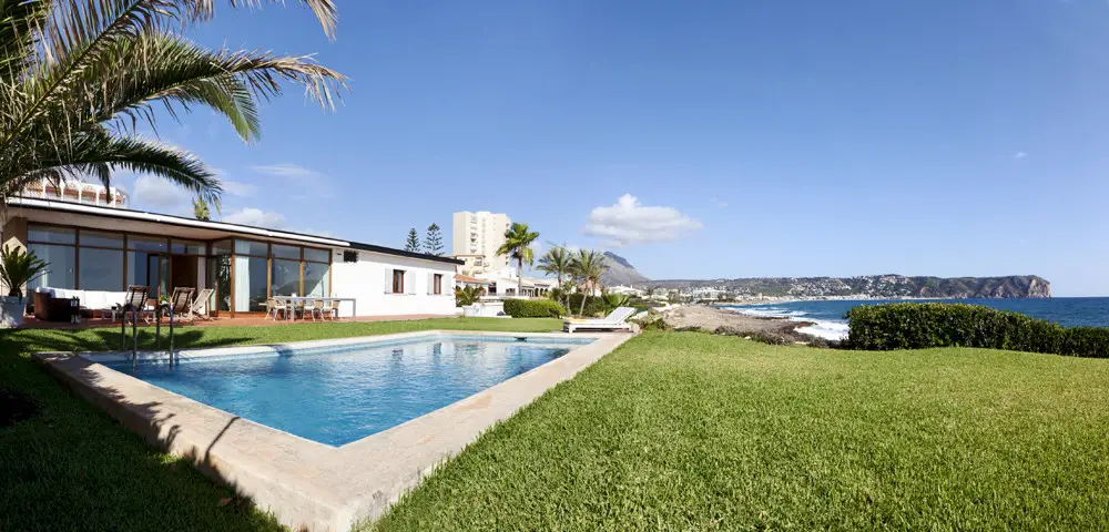 Exclusive villa with a front-line position in the prestigious area of Montañar II, with direct access to the sea and with fantastic views over Jávea Bay. The property stands on a 1,800 sq.m plot and the living space is spread over one floor. Of modern style, with straight lined design, the home comprises of very comfortable and practical living spaces, at only a few minutes stroll from all amenities and several leisure facilities at Jávea's Arenal beach. The villa features a dining room with tall panoramic windows which frame fantastic views of the sea. Outdoors there is a swimming pool and a BBQ area. The property further comprises 4 double bedrooms with walk-in wardrobes, 3 family bathrooms, a fully-equipped kitchen with an office area and with access onto the outdoor patio and the utility room. The residence enjoys a privileged location, surrounded by beautiful gardens filled with Mediterranean plants and palm trees. Next to the pool there is an outdoor terrace with awnings, from which one can enjoy the unbeatable views and the Mediterranean sea breeze. Other notable features include; A/C, a large garage and an alarm system. All the rooms have wooden flooring and the lounge has stone walls, a feature typical of properties in Jávea, creating a very welcoming atmosphere. From the terrace one can enjoy the impressive views over the sea. This is one of the most exclusive front-line homes in Jávea with direct access to the sea.