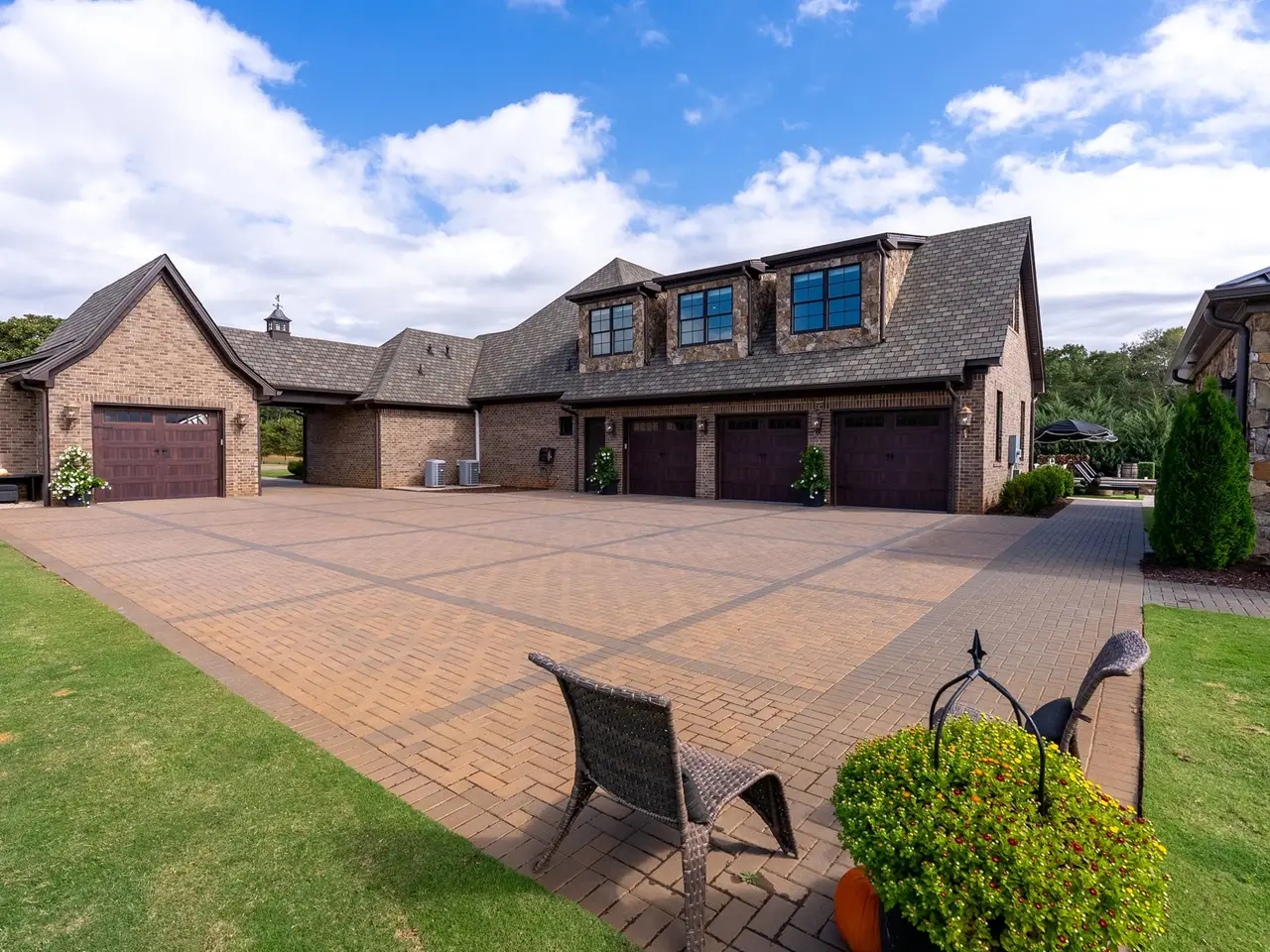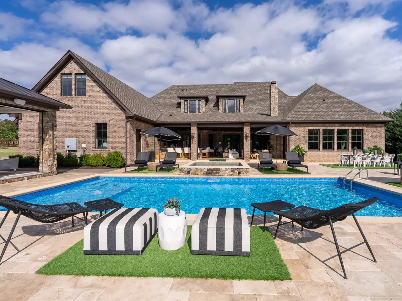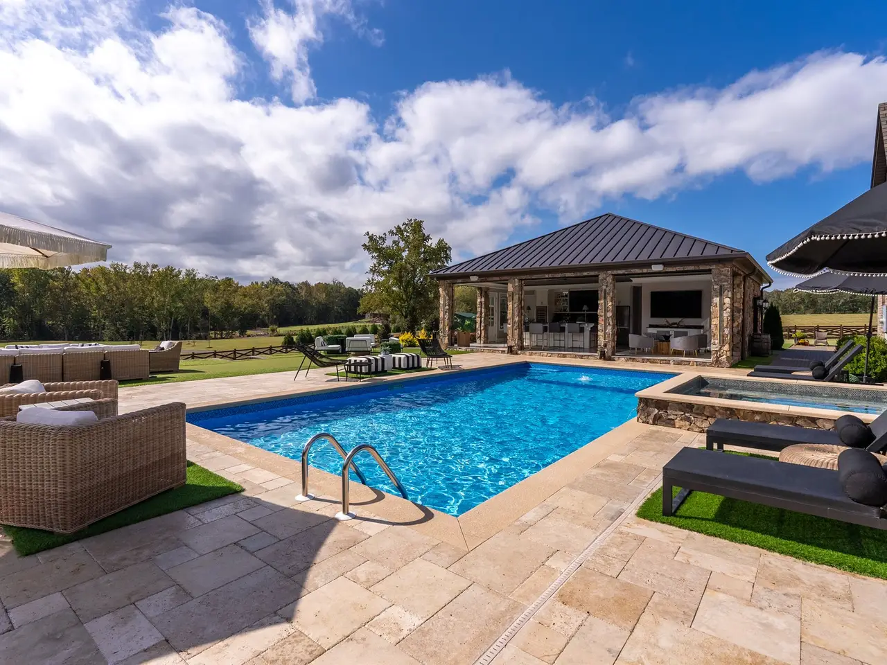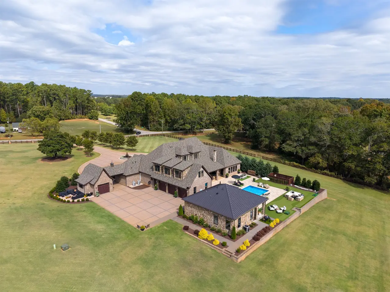 Imagine more than ten acres of pristine, perfectly curated land with an extraordinary home designed for entertaining at every level. Agape Acres Estate is tucked behind private gates, down a tree-lined paver driveway where a graceful fountain welcomes you home. This grand estate feels worlds away from everything, yet remains perfectly positioned close to all modern amenities in Simpsonville, SC. While every corner holds its own charm, the backyard truly steals the show- breathtaking, functional, and unforgettable. A sparkling saltwater pool with a spillover spa glistens beneath the Carolina blue sky, with a nearby putting green ready for friendly poolside competitions. An expansive covered porch spans the width of the home, featuring an outdoor living room, wood-burning fireplace, and full kitchen/grilling area. This space can be fully enclosed and climate-controlled for year-round comfort. Perfect for hosting holiday gatherings that flow effortlessly from indoors to the outdoor fireplace. Enjoy your morning coffee as the mist rises off the pond or unwind fireside beneath the stars. From game days to quiet nights, all the outdoor space has been intentionally designed for every South Carolina season. The pool house feels like a private resort suite, luxurious, stylish, and perfectly situated in the Carolina countryside. Inside, you'll find a hotel-inspired bedroom with ensuite luxury bath overlooking the lush backyard, an additional full guest bath, laundry area, and an attached garage with extensive storage. The poolside kitchen features a large hibachi grill ideal for brunches or alfresco dinners, and like the main porch, this entire area can be fully enclosed, and temperature controlled. These are the spaces where good food and laughter linger long after the plates are cleared. The land itself invites exploration, whether by four-wheeler or alongside a few barnyard friends. Horses or goats would feel right at home here, grazing by the pond stocked with Large Mouth Bass and Bream. The perfect spot for a quiet afternoon of fishing. Roughly four acres are fully fenced, offering a sense of peace, privacy, and panoramic views at every turn. Inside, the same sense of warmth and refinement continues. Rich hardwoods and elegant tile run throughout, with no carpet in sight. The great room, anchored by a grand fireplace and custom built-ins, flows seamlessly into the chef's kitchen, breakfast area, and elegant dining room. The formal dining space feels both sophisticated and inviting, complete with an adjoining bar that turns dinner parties into lasting memories. Imagine hosting the upcoming holidays in this elegant yet comfortable setting. The main-level primary bedroom suite is a serene retreat with a showstopper gas-log fireplace, sitting area, and two custom closets with washer/dryer area. It has the most amazing view of the backyard/pool. Two additional bedrooms with full ensuite baths, an elegant office or sitting room with a gas fireplace, and a home theater room with a wet bar/kitchenette for movie nights are all located on the main level. You'll also find two conveniently placed powder rooms and a spacious walk-in laundry room on this floor. Head to the second level to find two additional ensuite bedrooms, each with beautifully custom-tiled baths, along with an extra office, and a spacious recreation/living area featuring a well-appointed kitchenette. This home is ideal for multi-generational living or hosting long-term guests. With over ten acres of land, there's enough room to add future home sites or additional amenities. Every detail of this grand estate has been carefully curated, from the custom ceiling designs and designer lighting, to the fully finished, epoxy-coated five-car garage. Every closet custom, and every space designed to showcase exceptional craftsmanship. This is a home that seamlessly blends indoor and outdoor living spaces together. You will certainly have a hard time choosing your favorite spot.