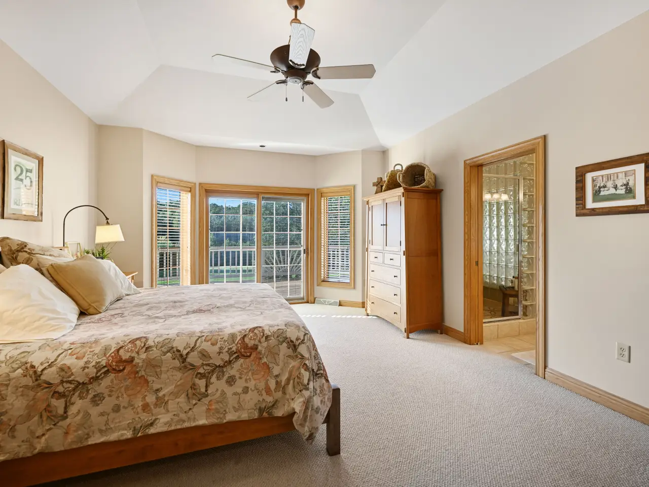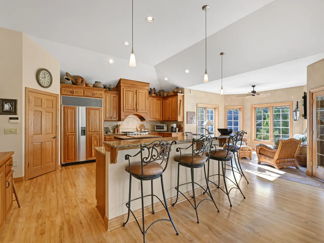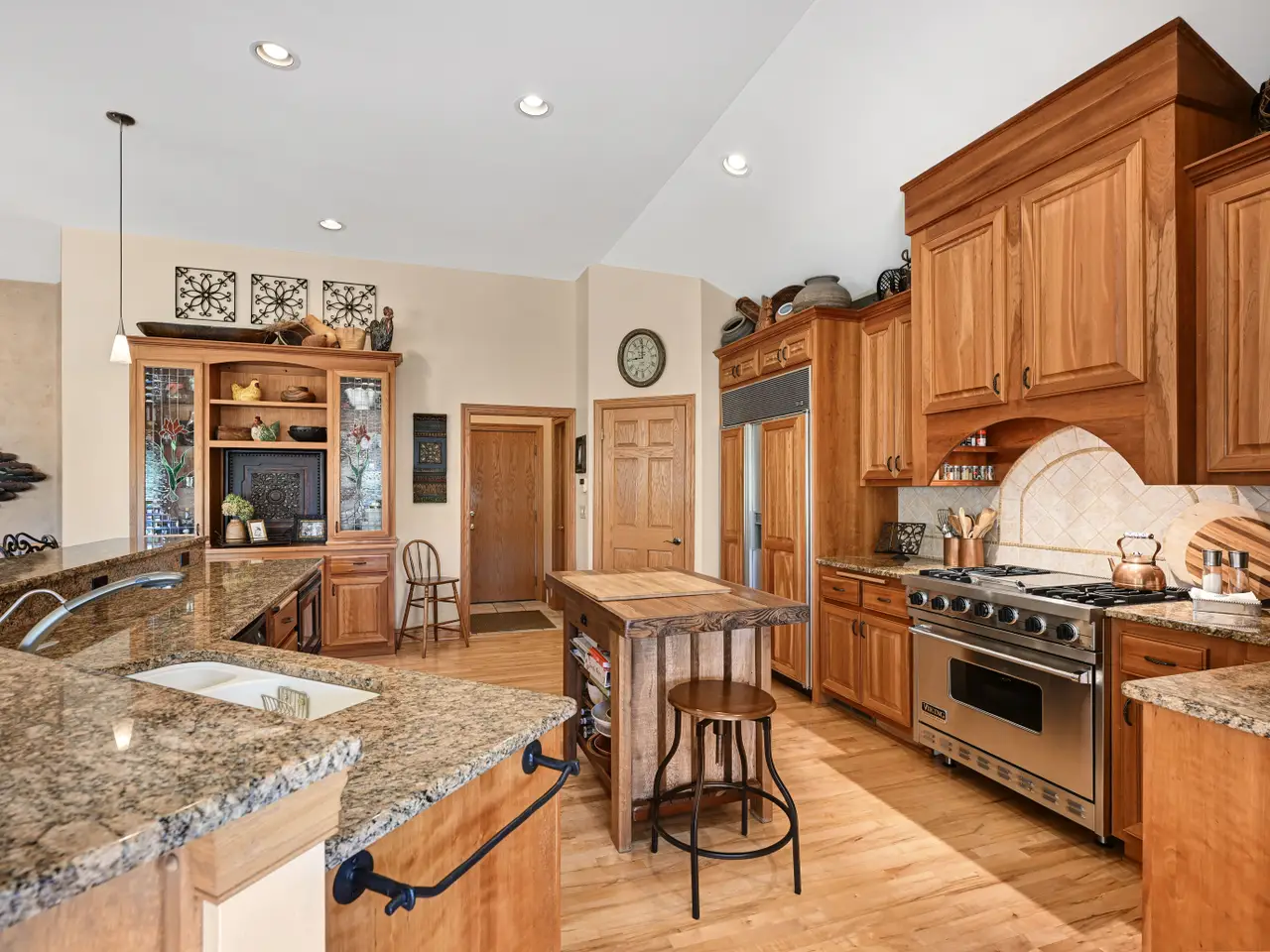 Secluded Executive Walk-Out Ranch. Tucked away on a quiet cul-de-sac, this stunning 3-bedroom, 3.5-bath executive walk-out ranch offers luxurious living space on a serene, park-like 1.9-acre wooded and fenced lot. Designed with quality in mind, this home combines privacy, elegance, and functionality. The open-concept great room features a wall of windows that flood the space with natural light and seamlessly connects to the formal dining area, sunroom, and chef's kitchen. The gourmet kitchen is a dream, complete with a large breakfast bar, cherry wood cabinetry, granite countertops, a professional-grade Viking stove, and a Sub-Zero refrigerator - perfect for entertaining or everyday living. 3.5-car heated garage includes a built-in dog wash and direct stair access to the lower level. The fully finished walk-out lower level is ideal for multigenerational living or in-law accommodations, featuring a bedroom, full tiled bath, large family room, and rec room - all finished with the same high-quality craftsmanship as the main level.