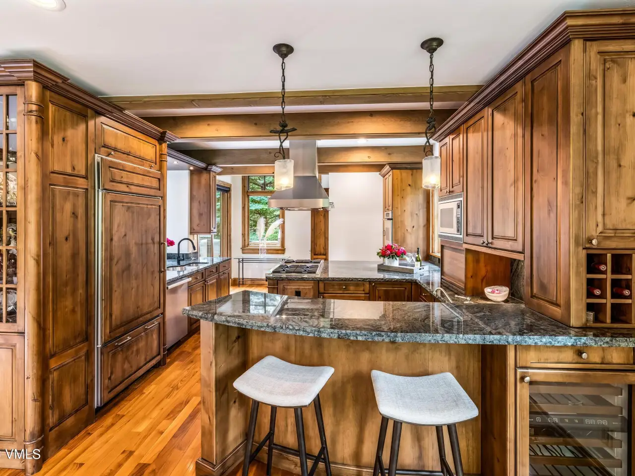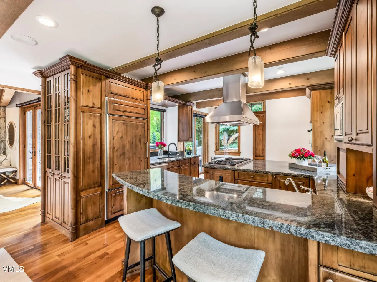 Situated on a quiet cul-de-sac in the coveted Vail Golf Course neighborhood, this remarkable single-family residence defines timeless elegance, sophistication and convenience. Just east of Golden Peak, it is a mere stone's throw from world class skiing on Vail Mountain, the prestigious Ford Park and Amphitheater, endless hiking and biking and all the amenities of Vail Village. Ride or walk a flat scenic street to town or enjoy the free Vail bus just steps away. With its stunning design by renowned architect, Kyle Webb, and meticulous attention to detail, this home is a testament to fine craftsmanship and quality construction. A warm blend of natural materials and clean lines creates both a striking sense of entry and glowy interior. Boasting five generously- sized bedrooms, each with its own luxurious en-suite bathroom, this residence is designed to provide comfort and luxury for you and your guests. The allure doesn't end there. The fifth bedroom has space for a family or game room and is complete with a kitchenette; perfect for accommodating extended family or friends. It's an ideal space with its own entrance, patio and washer and dryer; offering endless possibilities. An additional room on the upper level with its own patio offers yet more sleeping space or may function as an office, playroom or library. A gourmet kitchen boasts top-of-the-line appliances, Vent-a hood, additional prep sink, wine refrigerator, second dishwasher and double ovens. Whether you're hosting an intimate gathering our preparing a culinary masterpiece, this kitchen is sure to inspire your inner chef and entertainer. Step outside onto the spacious deck, an extension of the kitchen and great room, and soak in the breathtaking views of the surrounding mountains. Create sumptuous meals with the built in grill and prep area and dine al fresco before a short stroll to a summer concert. Experience this home and see why some of Vail's founders chose and stayed in this area for decades.