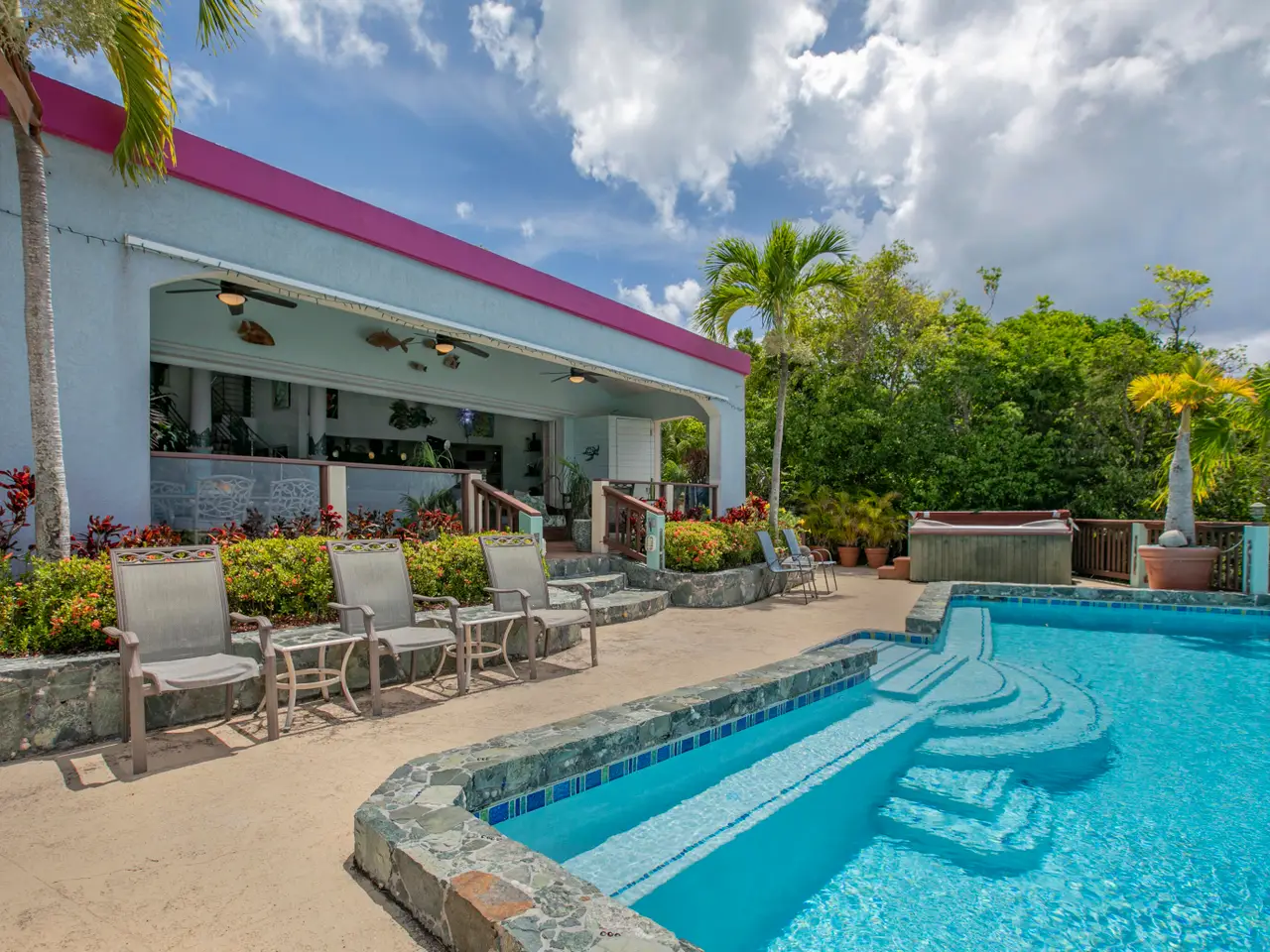 Villa Amour is a successful vacation rental that is also ready to be a home with an apartment. The expansive view overlooks Neltjeberg Beach all the way to the BVI. The property has a lush, remote feel while still being 5 minutes from a grocery store. The main house has 4 bedrooms with their own AC units and bathrooms, and an additional half bath on the main floor. The spacious living room has pocket doors that allow a seamless flow to the back porch, pool and hot tub. The apartment is a spacious studio with AC and a separate entrance. This concrete home is also equipped with a 25kW diesel generator w/300 gallon tank, and 45 solar panels with 9.2kW capacity. The sale includes adjoining lot 16-Rem Estate Neltjeberg.
