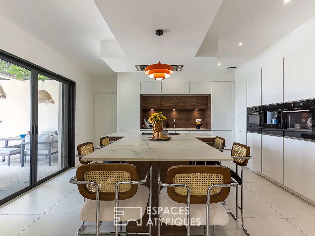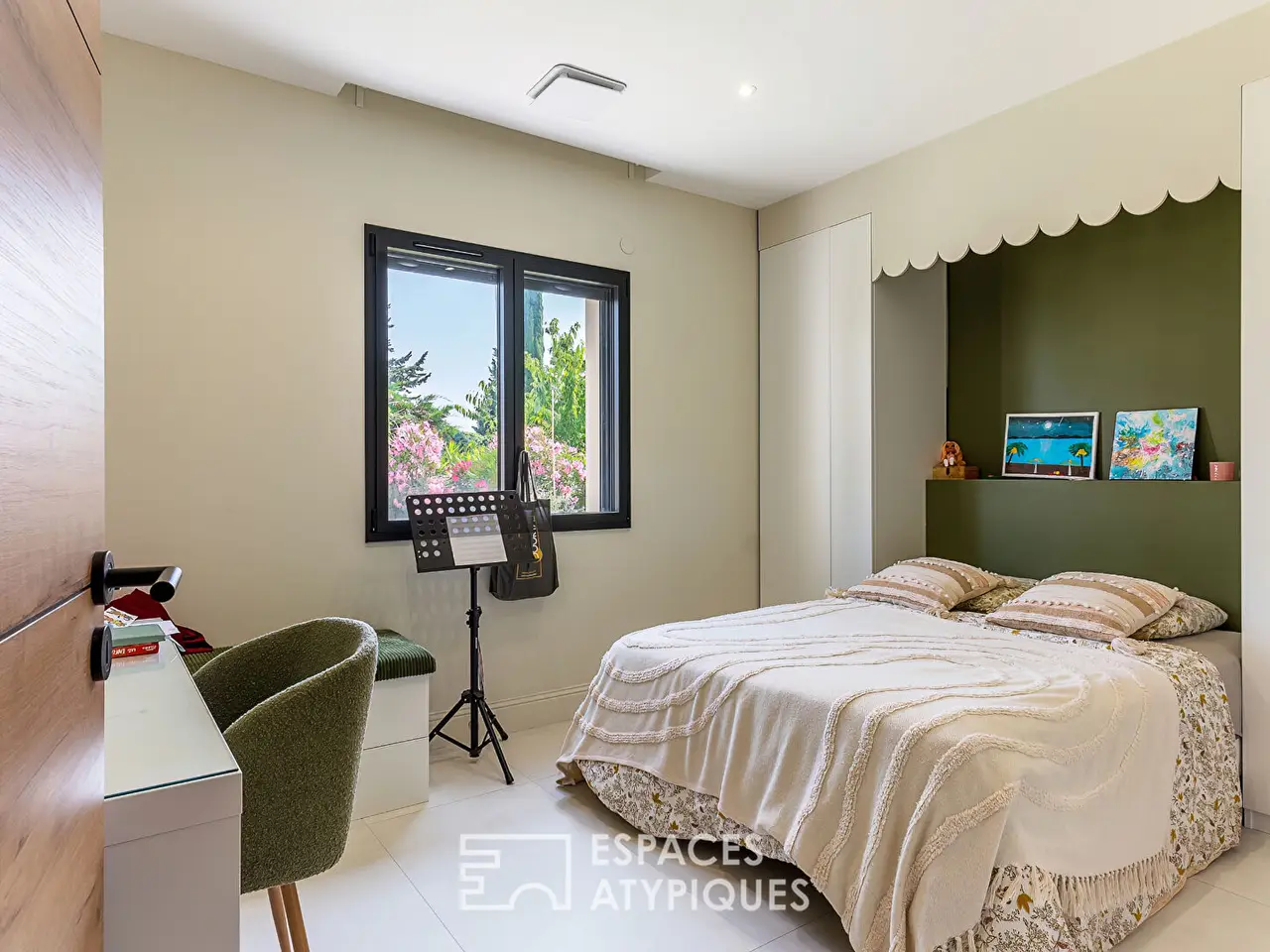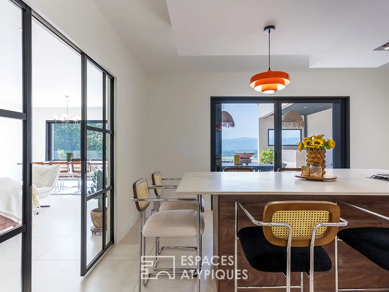 In the residential hills near Étoile-sur-Rhone, this single-storey architect-designed villa, due for completion in 2024, offers almost 200 m2 of living space on a landscaped plot with a swimming pool. This exceptional property captivates at first glance with its contemporary lines, natural light and high-end amenities. An elegant and functional retreat, designed for lovers of design and comfort.Beyond the electric gate, a large double garage and outdoor parking space welcome your vehicles. The garden offers an immediate surprise: a commanding view of the valley, a swimming pool elegantly set into a large 56 m2 terrace, and a landscaped garden adorned with fig trees, Mediterranean shrubs and olive trees ? everything exudes a gentle way of life.The entrance opens onto a large, light-filled hall with custom-made cupboards and a reception area that sets the tone. At the heart of the house, the spacious 42 m2 double living room flows harmoniously into the high-end fitted and equipped kitchen, which features a central island perfect for convivial meals. The whole is enhanced by large aluminium sliding glass doors, which naturally extend the living spaces to the outside.The master suite enjoys an ideal west-facing position. It consists of a spacious bedroom with a view, a large dressing room and a refined en-suite bathroom with double sinks and a double walk-in shower. The sleeping area has four other bedrooms, each with its own distinct atmosphere, tastefully decorated and fitted with custom-made wardrobes. A family bathroom with a freestanding bathtub and double shower, two separate WCs and a laundry/storage room complete the amenities.All materials and equipment have been carefully selected: underfloor heating with heat pump, ducted air conditioning, motorised roller shutters, adjustable sunshades (BSO), fibre optics, videophone, sophisticated interior and exterior lighting, security system ? everything here has been designed for optimal comfort and peace of mind every day.Outside, the harmony continues: the covered terrace allows you to extend your summer evenings, sheltered under a green roof. The garden, beautifully structured on two levels, offers play areas for children and charming flower beds. A utility room, outdoor toilets and storage space complete this highly functional picture.Located in a sought-after residential area, this house is just a few minutes from local shops, schools and motorway access to Valence and Montelimar. The natural surroundings will appeal to lovers of hiking, country walks or relaxing by the pool.A resolutely contemporary villa, as elegant as it is easy to live in. A place to live that ticks all the boxes for a sure-fire favourite, just a stone's throw from Valence. Don't wait to discover it.REF. 553DAAdditional information* 7 rooms* 5 bedrooms* 1 bathroom* 1 bathroom* Outdoor space : 900 SQM* Property tax : 1 €Energy Performance CertificateEPC : 27 kWhEP/m2.year* A 450Agency feesThe fees include VAT and are payable by the vendorMediatorMediation Franchise-Consommateurswww.mediation-franchise.com29 Boulevard de Courcelles 75008 ParisInformation on the risks to which this property is exposed is available on the Geohazards website : www.georisques.gouv.fr