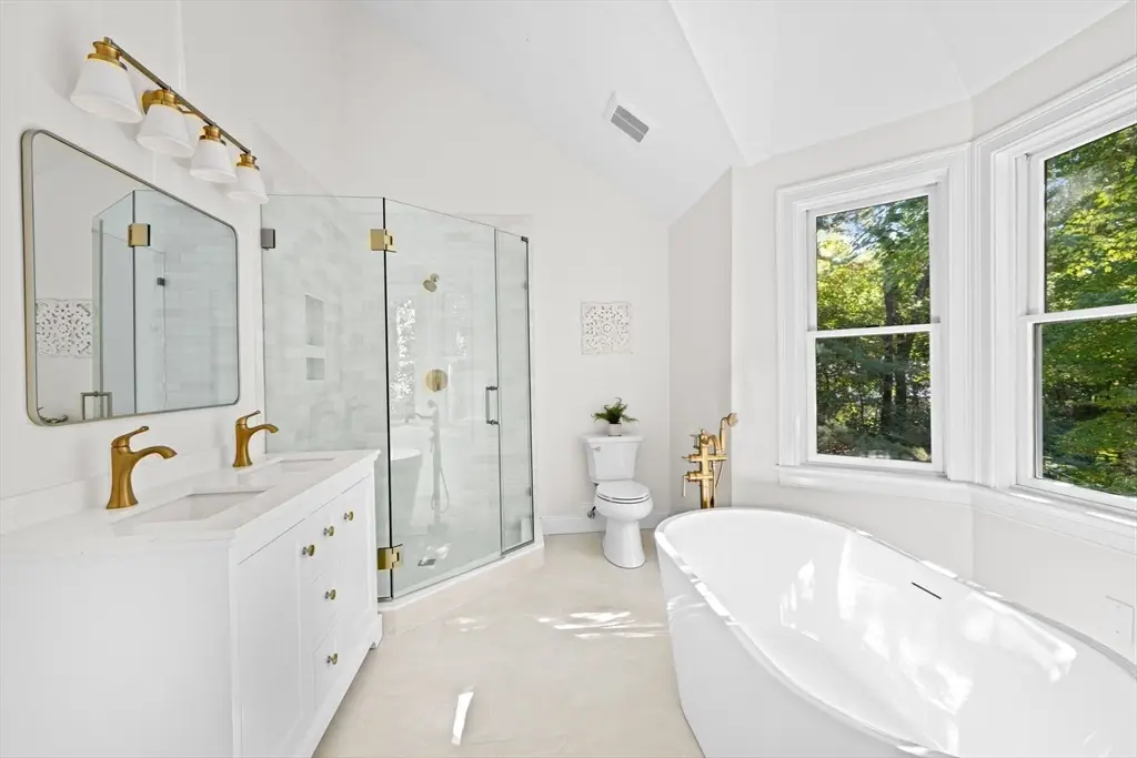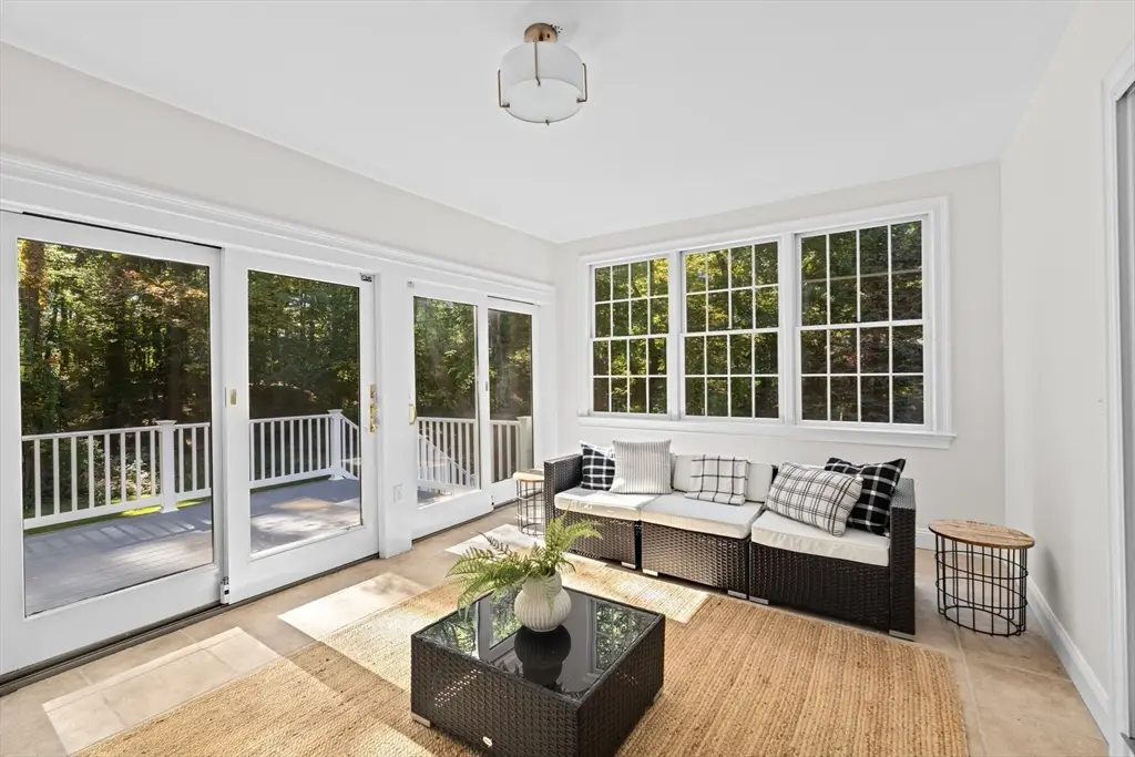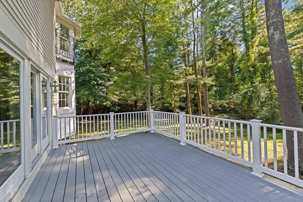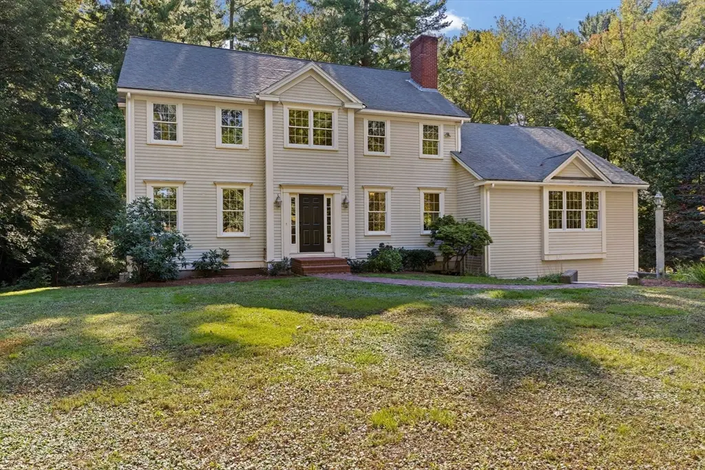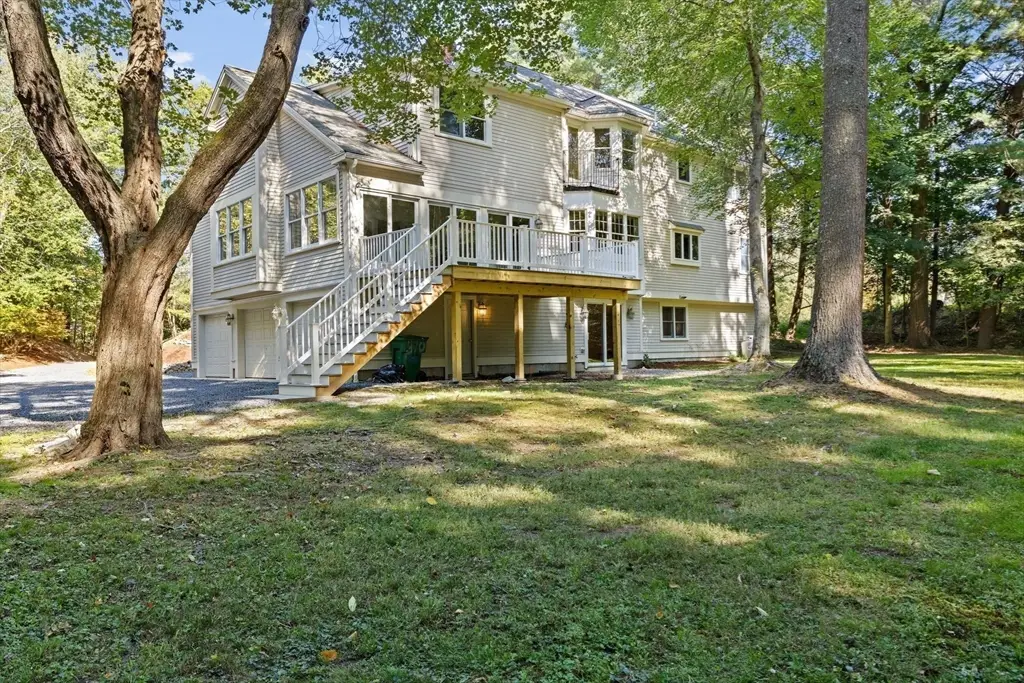 Spacious and Tranquil! This lovely Colonial is perfectly nestled on a private retreat lot offering a serene setting and a sprawling front yard. The heart of the home is the expansive kitchen featuring two islands, new appliances, and a sunlit breakfast area. The first floor also includes a formal living room, laundry room, and a spectacular family room with soaring 17-foot ceilings and a see-through fireplace connecting to the dining room. An inviting sunroom opens to a newly built composite deck overlooking the peaceful backyard. Upstairs, the primary suite is a true retreat with a Juliet balcony, walk-in closet, and a luxurious en-suite bath with a soaking tub. Two additional beds ,a full bath and office complete the second floor. The walk-out lower level offers a versatile playroom, ample storage, and a three-car garage. Conveniently located near Wompatuck State Park, South Elementary School and the train to Boston.