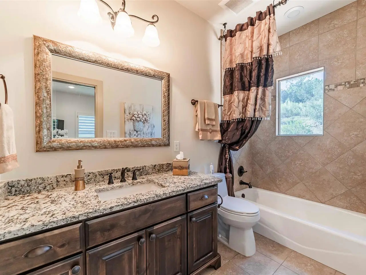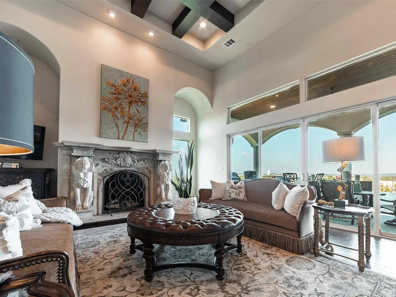 The crown jewel of Bella Montagna, where every arrival feels like a grand entrance. Perched on the premier hilltop with commanding presence and visibility, this estate makes a statement from the moment you arrive. A gated drive leads to an expansive motor court with parking for 15+ vehicles, setting the stage for grand scale living and entertaining. Texas limestone, tile roof, and double Cantera iron doors open to a hand-painted barrel ceiling entry framing sweeping Lake Travis and Hill Country views. Inside, soaring ceilings and custom artistry abound--wood beams, floating and hand-painted ceilings, and layered details throughout. Designed to live like a single story, all four bedrooms offer en-suite baths and walk-in closets, with an upstairs wing providing two additional bedrooms, a living area, and its own HVAC zone. The open kitchen, dining, and family areas center around a massive double-ogee granite island, with chef's amenities including double dishwashers, pot filler, six-burner cooktop with griddle, convection/steam ovens, warming drawer, built-in refrigerator, walk-in pantry, copper prep sink, and extensive cabinetry. A Cantera-door wine room with refrigerator and bar completes the space. The owner's retreat opens to ±1,000 sf of covered outdoor living with summer kitchen, hot tub, and resort-style pool -- perfectly oriented for year-round breezes. The suite also features an exercise alcove with views, a custom stone bathtub, and a triple-sized custom closet. Additional highlights include 3 oversized garage bays with storage and attic, granite windowsills, custom carved stone fireplace, plantation shutters, meticulous landscaping across 1.3 acres, and a low tax rate and HOA. Every room enjoys a view, every detail elevates the experience--an extraordinary chance to own the most visible and celebrated hilltop estate in Lakeway's prestigious Bella Montagna.