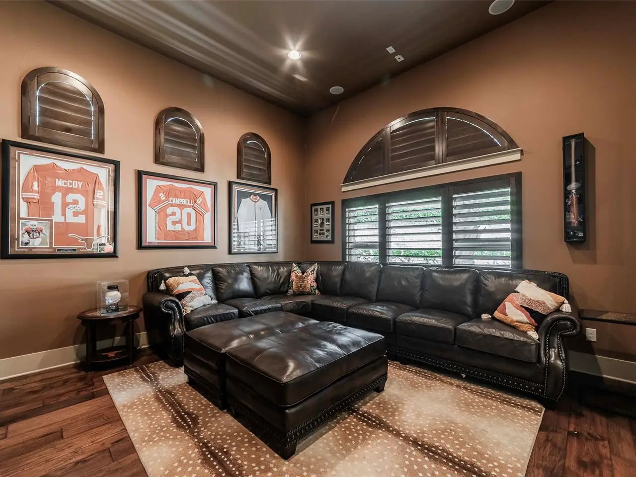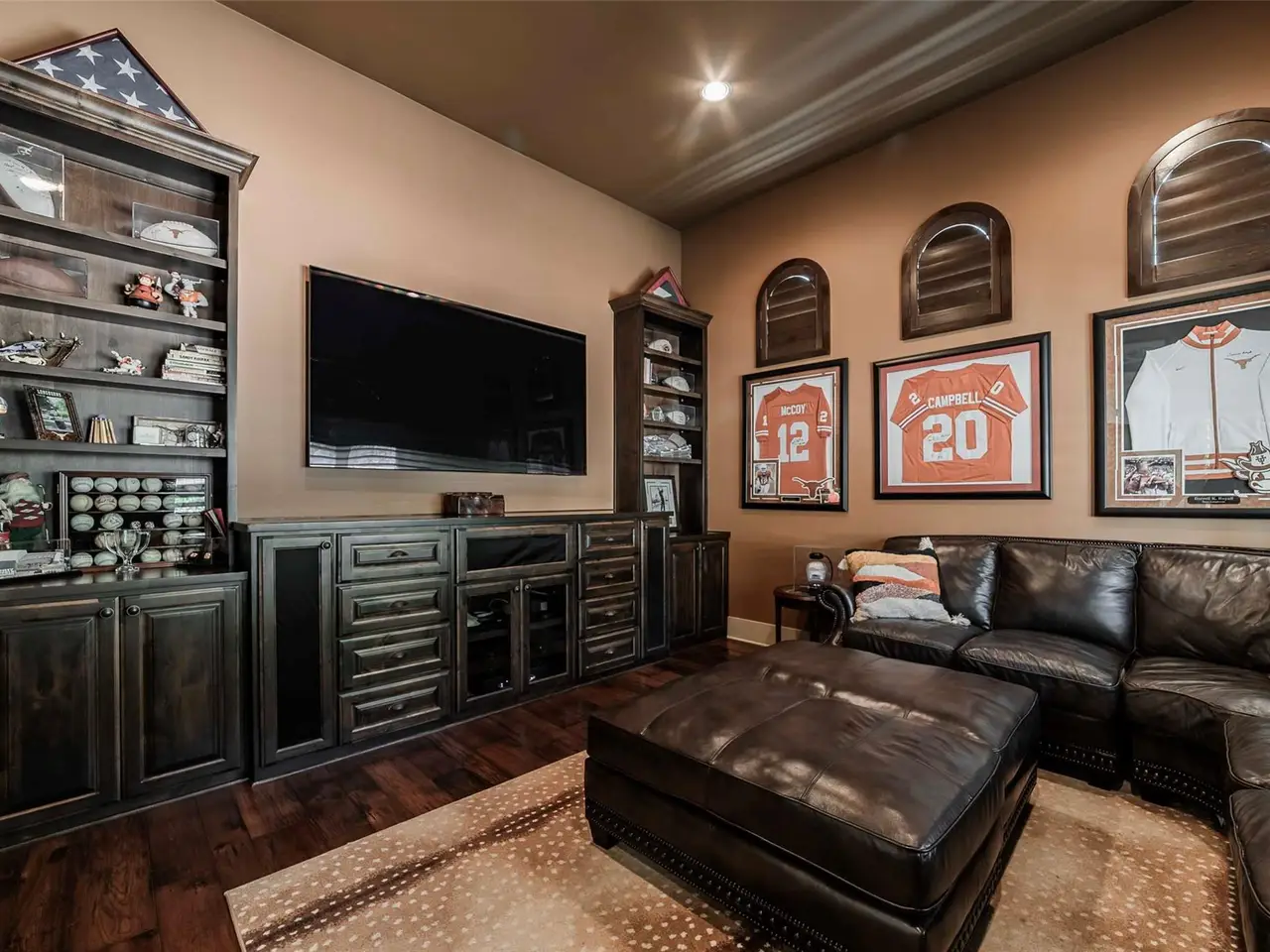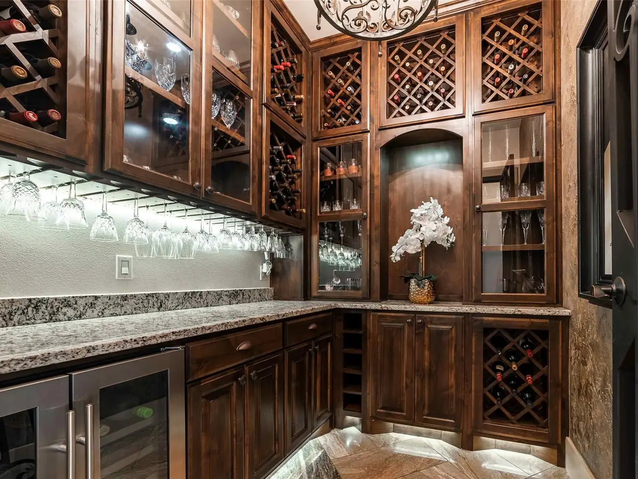 • Cantera-door wine room with refrigerator and bar
