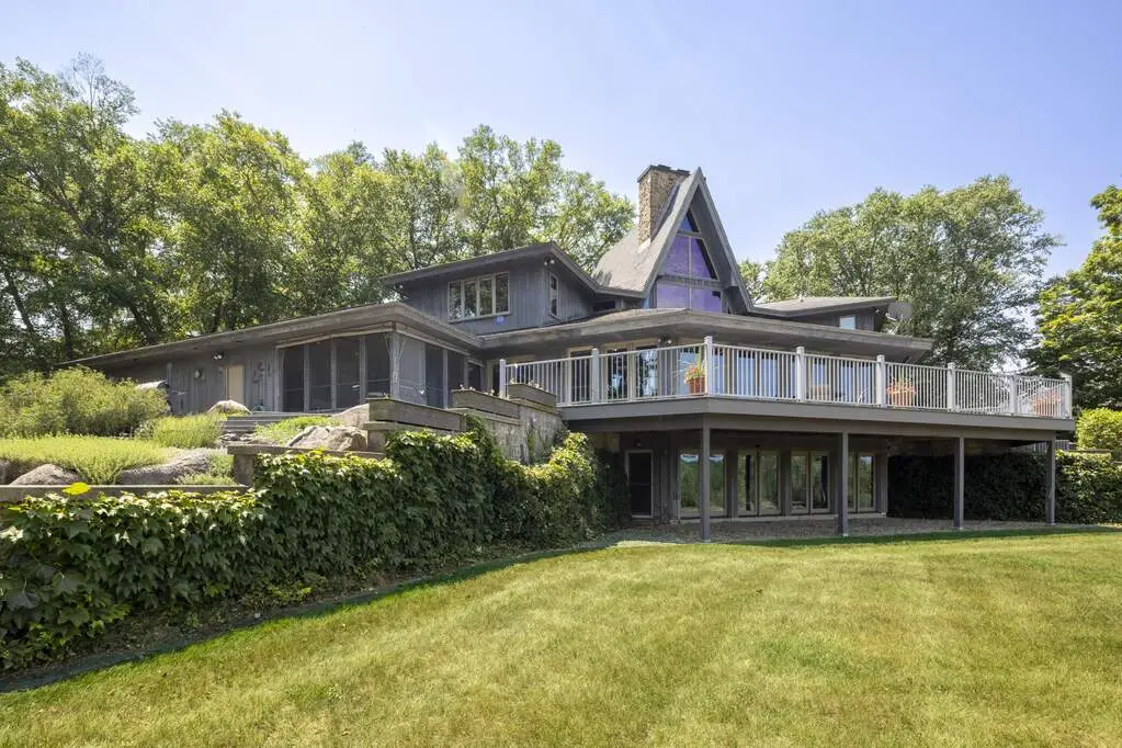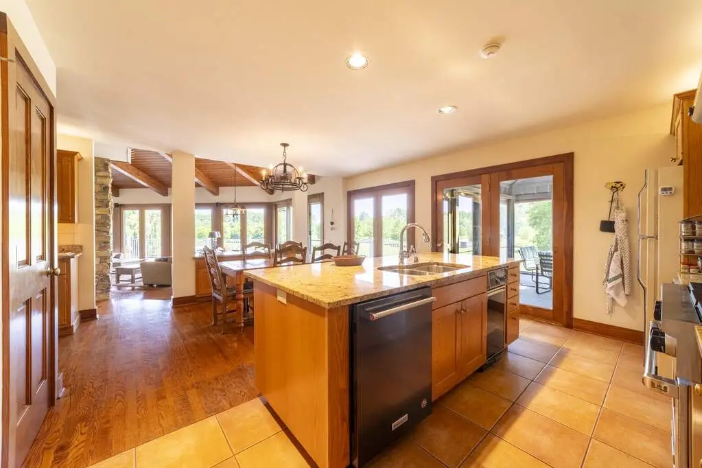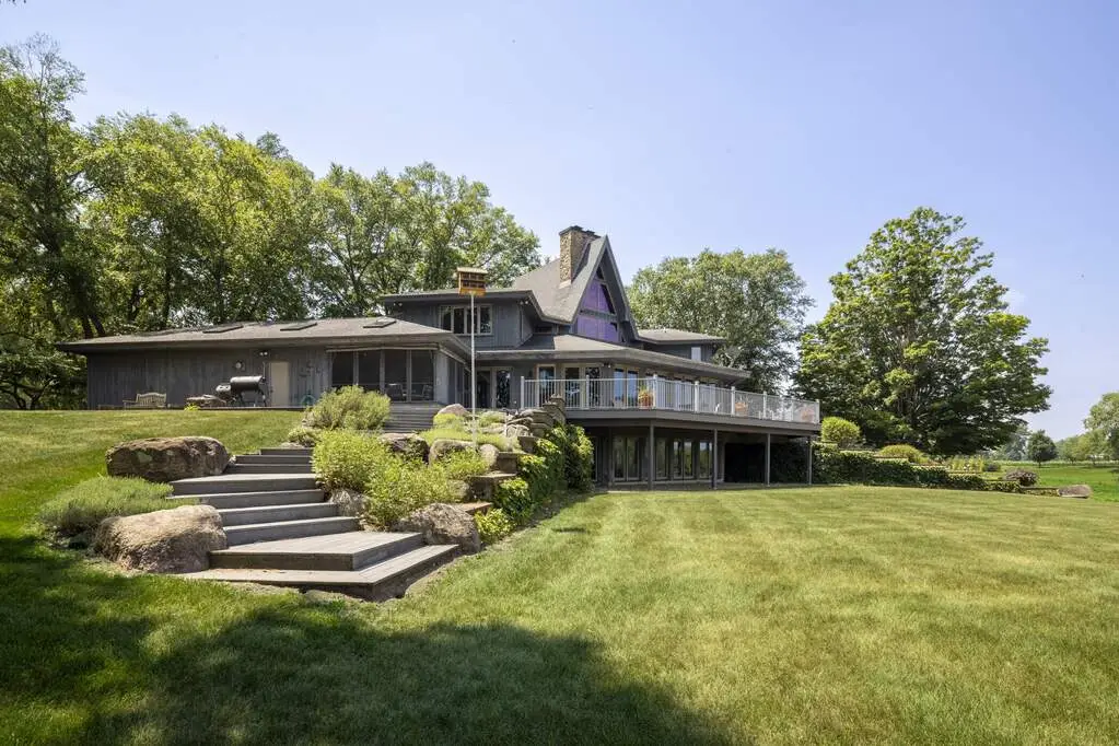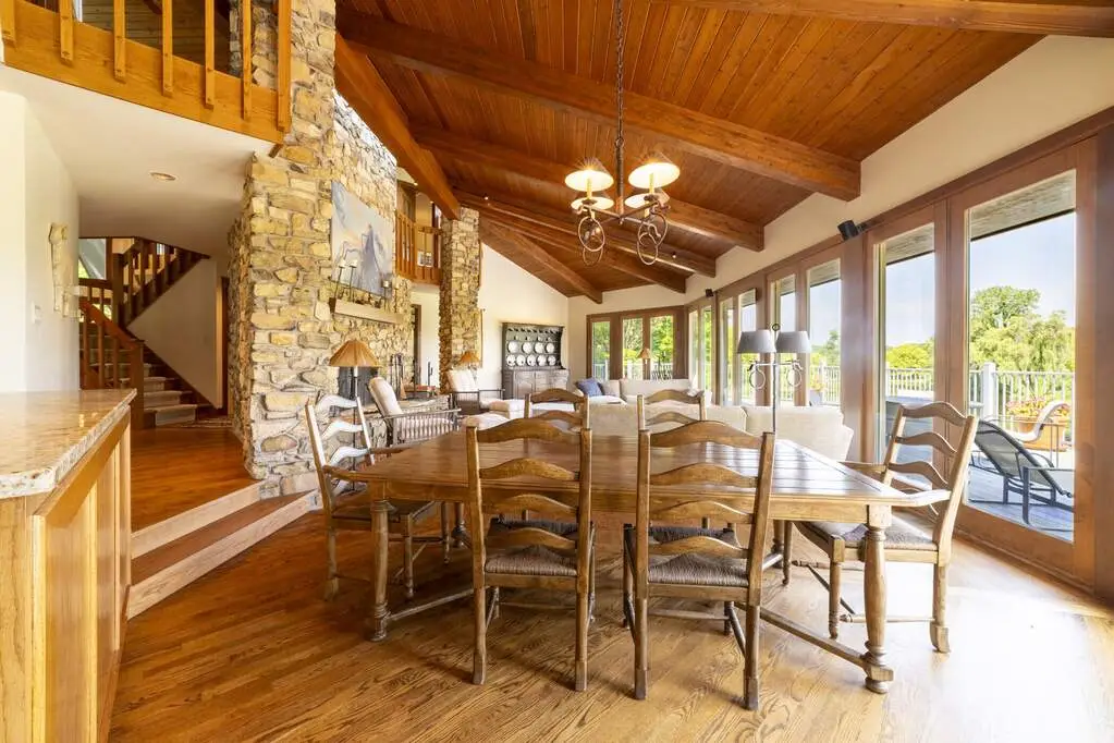 Welcome to a perfectly private rustic retreat set on 97 serene acres in the coveted corridor of Galena Township. This remarkable estate offers five spacious bedrooms and four bathrooms, blending timeless style, modern comfort, and the beauty of its natural surroundings. The moment you enter, you are met with a soaring cathedral ceiling and a striking wooden staircase that sets the tone for the home's inviting warmth. The open-concept kitchen, dining, and living areas feature tongue-and-groove vaulted ceilings and a dramatic floor-to-ceiling stone fireplace, while a wall of French doors floods the space with natural light and leads to a sunroom and wraparound deck. From here, enjoy the sweeping views of a tranquil pond and lush tree farm creating an atmosphere perfect for both everyday living and unforgettable gatherings. The gourmet kitchen is a chef's dream, with shaker cabinetry, granite countertops, generous island, and a dedicated coffee bar. Beautiful hardwood floors flow throughout, enhancing the home's sense of cohesion. The main level also offers a convenient laundry room, while additional living spaces include a billiards room and a cozy sitting area with custom bookshelves. The walkout basement is a showstopper in its own right, anchored by another floor-to-ceiling fireplace and framed by French doors and expansive windows that bring the outdoors in. Beyond the home, a classic timber-and-peg barn stands ready for its next chapter--whether as a guesthouse, event venue, workshop, or studio. The property, meticulously maintained and irrigated, could easily return to a working farm. Mature trees, scenic walking trails, and a peaceful pond with a dock offer endless opportunities for outdoor recreation and quiet reflection. Combining rustic charm with modern amenities and boundless potential, this is more than just a property, it is a place where memories are made, nature is cherished, and the possibilities are as vast as the land itself.