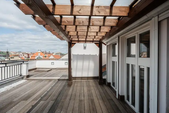 In exclusive representation of the owners, we offer for sale an exceptional duplex apartment of 185 sq.m. with a 50m sq.m. large terrace in the very center of Prague. This apartment will captivate you with its interesting layout, abundance of light, and a beautiful terrace with views of the Prague Castle and other famous sites of the historic center of Prague. Walking through the entrance hall, where there is a spacious wardrobe, you enter the central area with a kitchen, bar, and living room. Also on the entrance to the 5th floor are two separate bedrooms and two bathrooms, several built-in wardrobes, and additional storage spaces. A double staircase leads you to the 6th floor, where there is a study and a relaxation gallery with more storage space and a small kitchen to serve the terrace. The 50m2 large terrace faces southwest, offering a magnificent view not only of the Prague Castle and Petřin but also other landmarks. We recommend a viewing of this beautiful apartment.