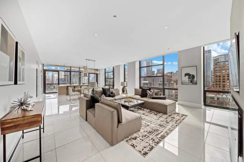 Step into a world of refined luxury where every detail has been curated for those who demand more than just a place to live-they demand a lifestyle. This exquisite residence in a boutique River North building is a symphony of marble, light, and modern design. The sprawling floor plan, featuring 3 bedrooms plus home office and 2.5 baths, truly offers an escape above the city yet firmly anchored in its energy. Enter through a marble-clad foyer with custom storage that sets the tone for a home designed with both elegance and ease in mind. The expansive living and dining spaces flow effortlessly, wrapped in floor-to-ceiling south-facing glass that drenches the interiors in light while framing Chicago's skyline in cinematic fashion. An electric fireplace adds warmth and intimacy, while the dining area opens onto an east-facing balcony-perfect for morning coffee with the sunrise. The custom designed Valcucine kitchen is a study in sleek functionality: quartz-clad island seating four, integrated Miele appliances including a five-burner cooktop, convection microwave, and beverage refrigerator, all framed by polished chrome fixtures and a powerful Max Fire hood. Retreat to a primary suite that redefines indulgence-two balconies with both south and east exposures, a walk-in closet plus three additional closets with organizers, and a spa-caliber bath featuring a soaking tub, dual vanities, rainfall shower with bench seating, and a separate marble-clad water closet. Two additional bedrooms provide sanctuary for guests or family, each with floor-to-ceiling windows and customized storage; one enjoys a marble ensuite bath, the other easily pairs with an elegant sitting room/office anchored by marble floors. A powder room, full laundry room with Samsung washer/dryer and cabinetry, and thoughtful built-ins throughout underscore the commitment to both beauty and function. Private 2 car heated garage, temperature-controlled wine storage, and spacious storage closet complete this home. All of this in a sought after building complete with 24/7 concierge, covered & heated dog run, bicycle storage, elite-level fitness facility, security team, and more! Extraordinary location offers easy proximity to all that the area has to offer; world class dining, retail and culture, as well as transportation, river access, Ogden Elementary, and so much more! Set within an intimate building known for privacy, this residence is not just another River North condo-it's a stage for a life well lived, where boutique luxury meets world-class city living.
