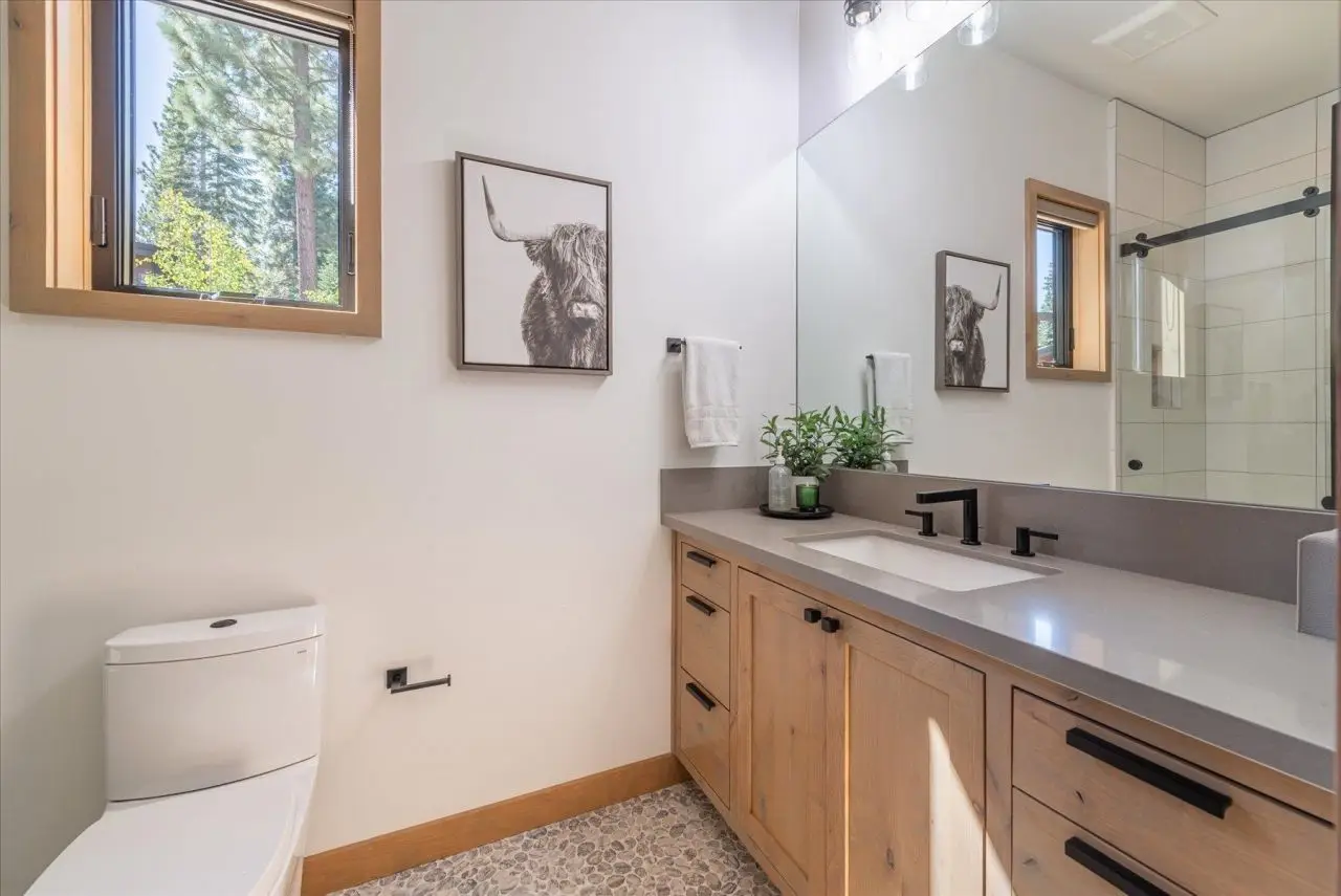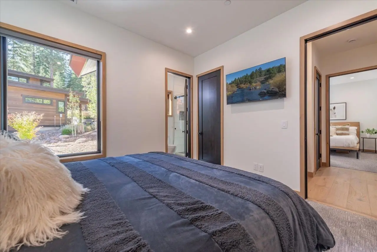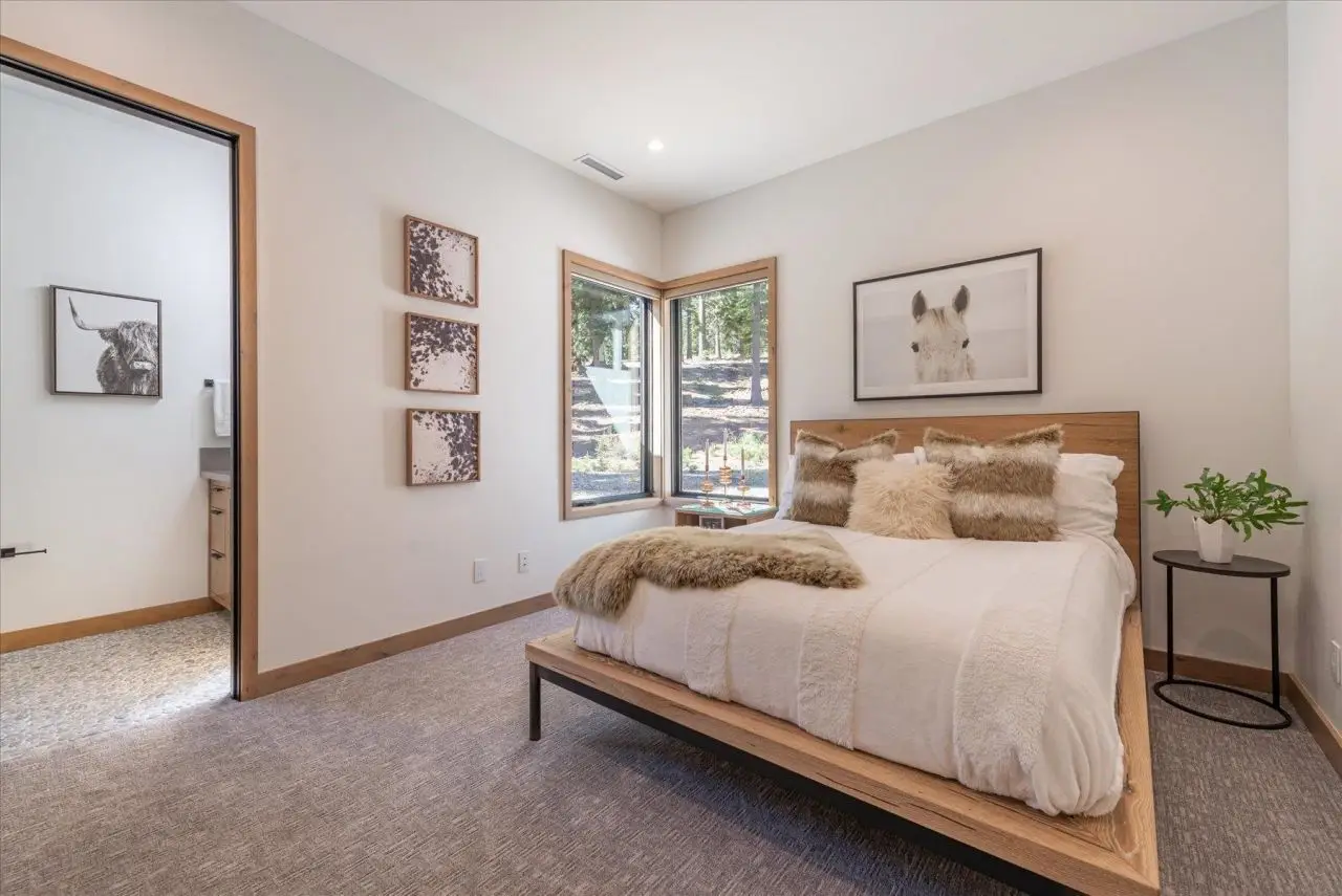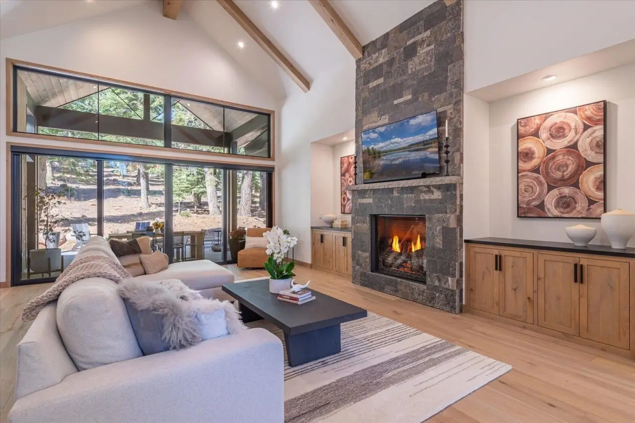 Nestled within the coveted Schaffer's Mill luxury community, 9087 Horned Lark Court blends custom craftsmanship with timeless architectural appeal. This RARE, single-level retreat blends mountain modern design with thoughtful livability, creating an inviting sanctuary amidst a private forest setting. The stunning great room showcases soaring ceilings, exposed beams and floor-to-ceiling windows that frame tranquil wooded views. Anchored by a contemporary gas fireplace, this spacious gathering area exudes warmth and mountain sophistication. The chef's kitchen complements the space beautifully, featuring a farmhouse-inspired design with a large center island, high-end appliances, open shelving, abundant cabinetry, and a walk-in pantry. The adjacent dining area is bathed in natural light - ideal for intimate meals with nature as your backdrop. During the summer months, dine al fresco beneath the expansive covered patio, then gather as alpenglow fades into starlight. An executive office, located off the great room, offers both function and style, highlighted by built-in cabinetry and serene front-yard views - perfect for remote workdays in the mountains. Movie or game nights come alive in the comfortable family room, complete with an adjacent and custom designed wet bar, mudroom and laundry area for everyday ease. Privately situated in its own wing, the primary suite is a peaceful retreat with patio access, a cozy gas fireplace, and a spa-inspired ensuite featuring a soaking tub, spacious shower, dual vanities, custom walk-in closet plus a makeup vanity. On the opposite side, two ensuite guest bedrooms offer comfort and privacy for family and friends. A true rarity, the 1,350+ sq. ft. garage delivers incredible functionality with epoxy flooring, built-in storage, and room for cars, sleds, an RV, boat, skis, bikes, and more - perfect for your Tahoe adventures! With distinctive curb appeal, abundant outdoor living and exceptional design quality, this home captures the essence of luxury mountain living in Truckee's coveted Martis Valley. Experience the vibrant, welcoming spirit of Schaffer's Mill - a place where refined style meets relaxed mountain life. Welcome home!
