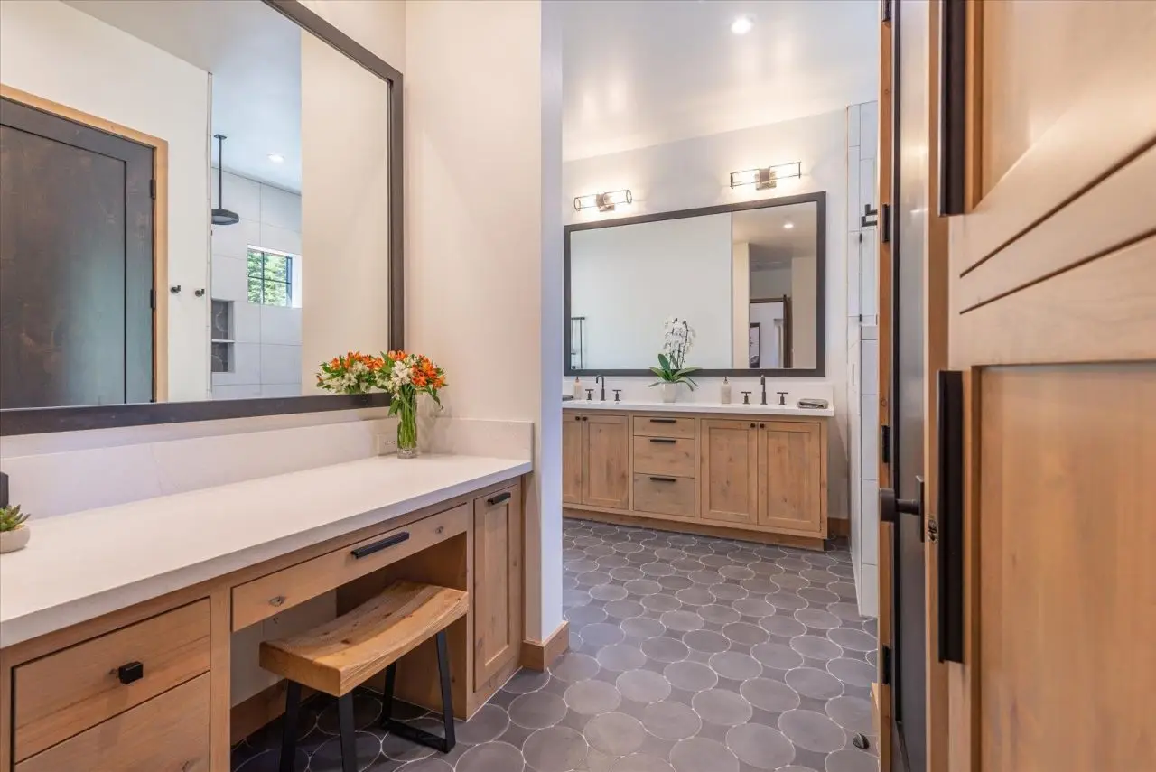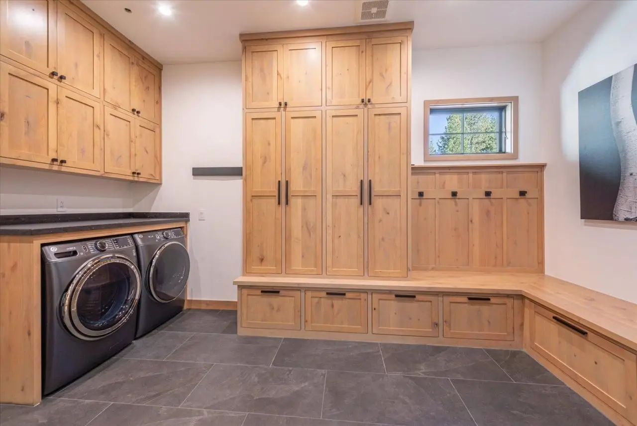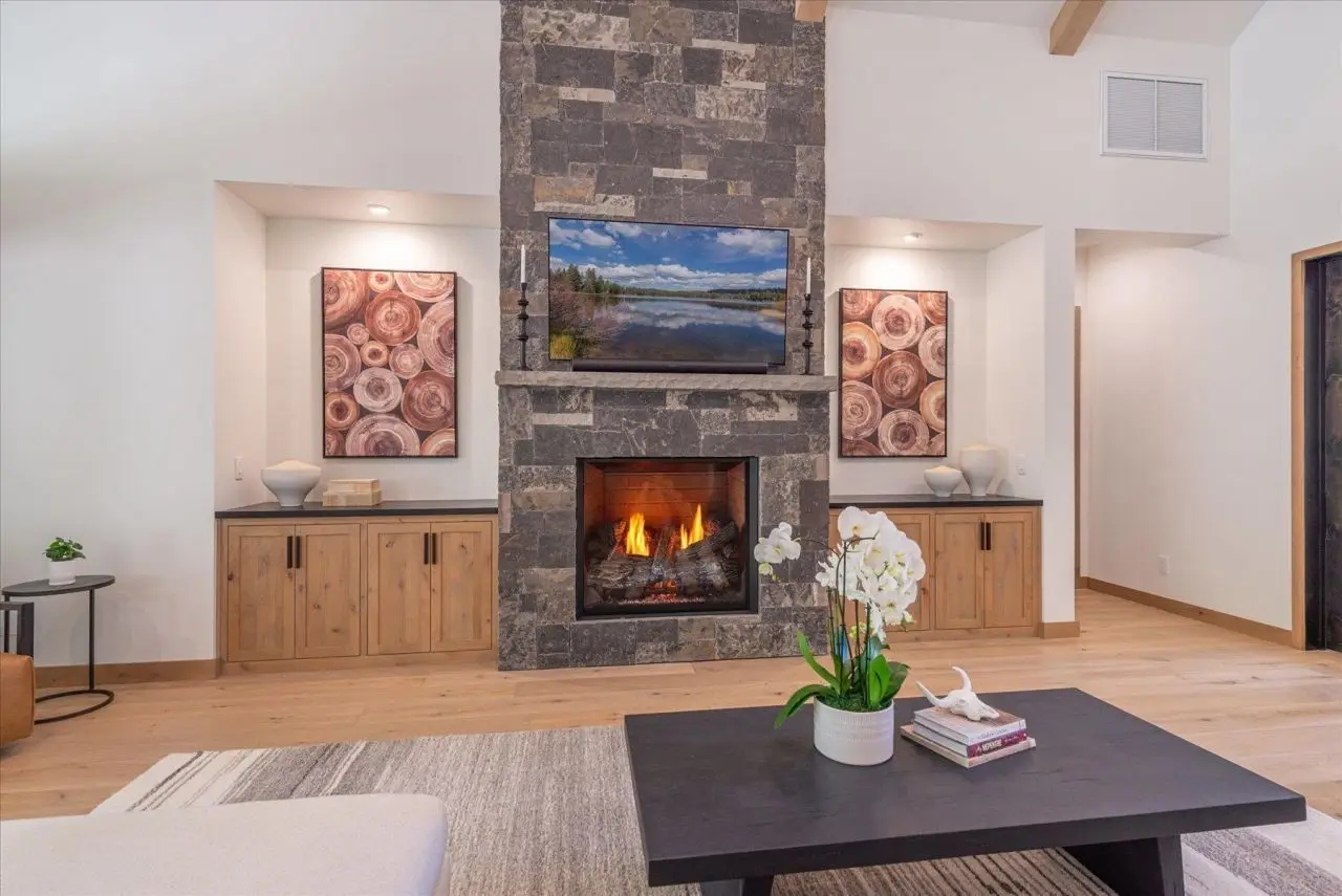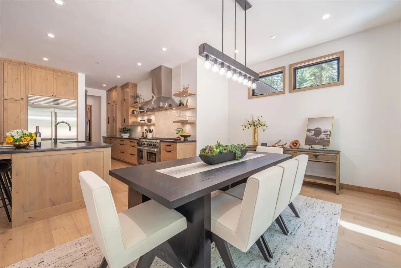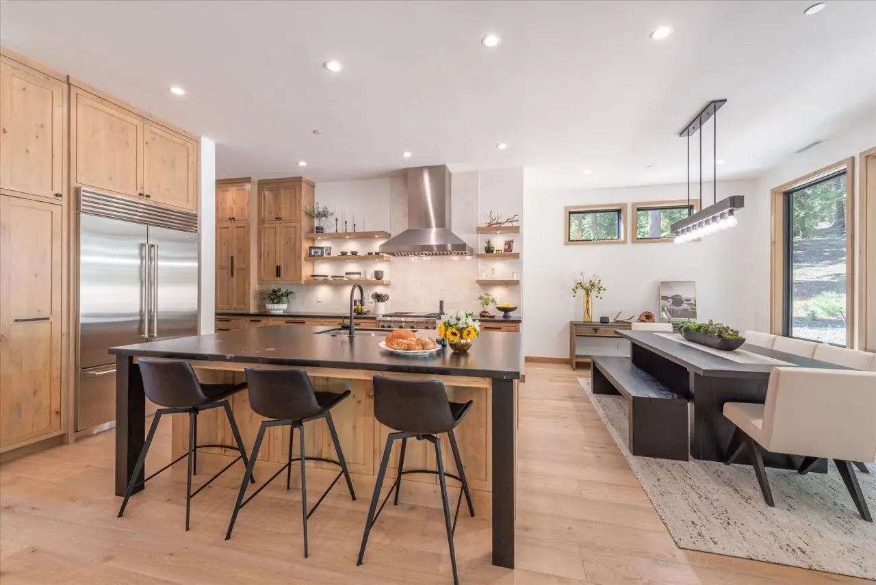 Nestled within the coveted Schaffer's Mill luxury community, 9087 Horned Lark Court blends custom craftsmanship with timeless architectural appeal. This RARE, single-level retreat blends mountain modern design with thoughtful livability, creating an inviting sanctuary amidst a private forest setting. The stunning great room showcases soaring ceilings, exposed beams and floor-to-ceiling windows that frame tranquil wooded views. Anchored by a contemporary gas fireplace, this spacious gathering area exudes warmth and mountain sophistication. The chef's kitchen complements the space beautifully, featuring a farmhouse-inspired design with a large center island, high-end appliances, open shelving, abundant cabinetry, and a walk-in pantry. The adjacent dining area is bathed in natural light - ideal for intimate meals with nature as your backdrop. During the summer months, dine al fresco beneath the expansive covered patio, then gather as alpenglow fades into starlight. An executive office, located off the great room, offers both function and style, highlighted by built-in cabinetry and serene front-yard views - perfect for remote workdays in the mountains. Movie or game nights come alive in the comfortable family room, complete with an adjacent and custom designed wet bar, mudroom and laundry area for everyday ease. Privately situated in its own wing, the primary suite is a peaceful retreat with patio access, a cozy gas fireplace, and a spa-inspired ensuite featuring a soaking tub, spacious shower, dual vanities, custom walk-in closet plus a makeup vanity. On the opposite side, two ensuite guest bedrooms offer comfort and privacy for family and friends. A true rarity, the 1,350+ sq. ft. garage delivers incredible functionality with epoxy flooring, built-in storage, and room for cars, sleds, an RV, boat, skis, bikes, and more - perfect for your Tahoe adventures! With distinctive curb appeal, abundant outdoor living and exceptional design quality, this home captures the essence of luxury mountain living in Truckee's coveted Martis Valley. Experience the vibrant, welcoming spirit of Schaffer's Mill - a place where refined style meets relaxed mountain life. Welcome home!