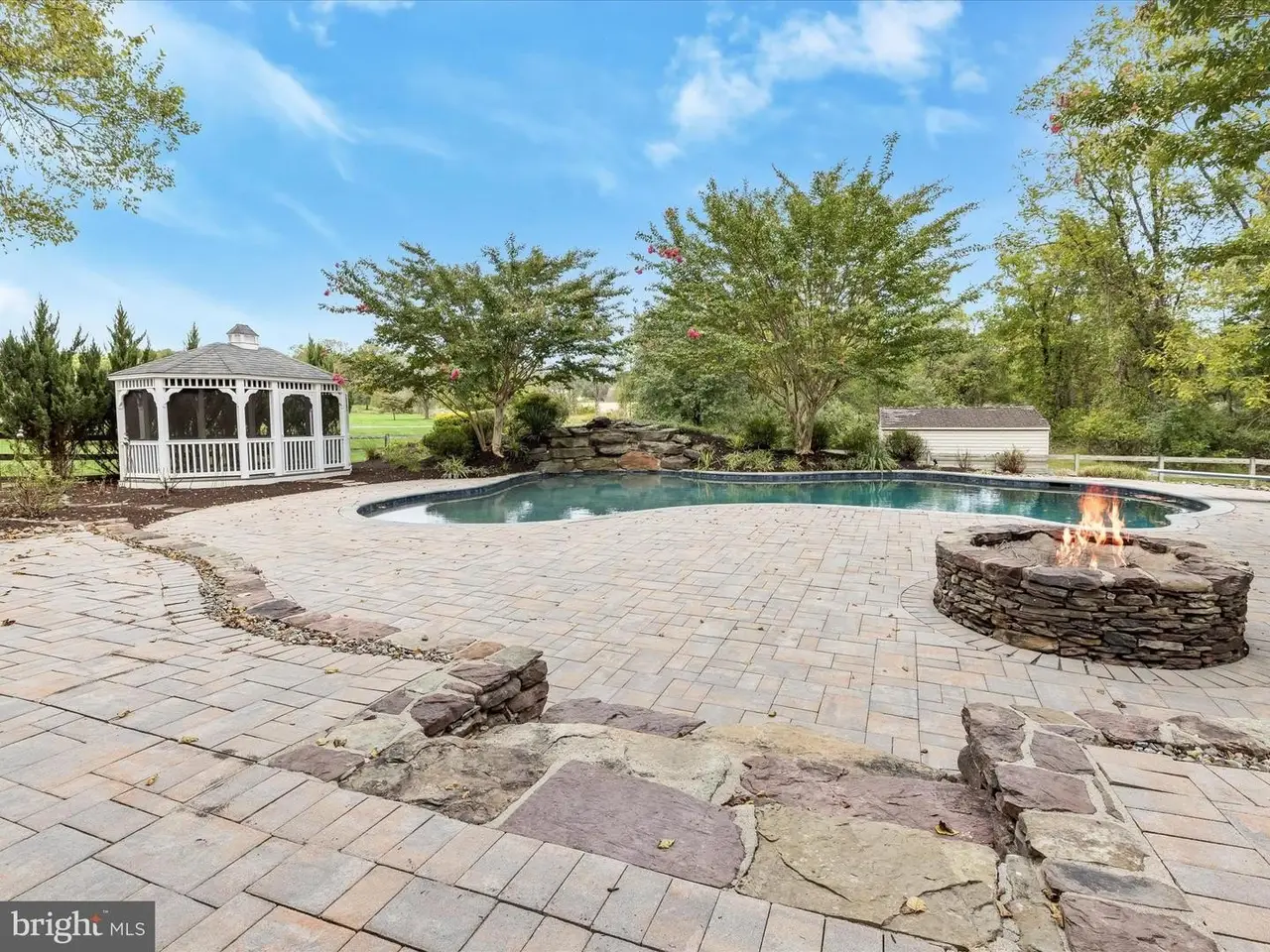 Welcome to this breathtaking brick colonial, ideally nestled in one of the area's most sought-after communities. Set on over 3 meticulously landscaped acres, this private estate offers the ultimate retreat with a resort-style backyard featuring a sparkling swimming pool, expansive patio with built-in firepit, and a charming gazebo, perfect for both grand entertaining and quiet relaxation. Step through the elegant grand foyer, where gleaming exotic cherry hardwood floors and a soft, neutral palette set the tone for timeless sophistication. A stately front office with custom built-in bookcases and a formal dining room offer refined spaces for work and entertaining. At the heart of the home, the gourmet kitchen is a chef's dream, appointed with rich wood cabinetry, granite countertops, high-end stainless steel appliances that include a new refrigerator, an oversized entertainer's island, and a convenient butler's pantry connecting to the formal dining area. The adjacent breakfast nook opens to an expansive deck overlooking the picturesque grounds. The grand family room showcases a soaring vaulted ceiling, a dramatic stone fireplace, and an overlook from the upper level, creating a warm and inviting space for gatherings. Upstairs, the luxurious primary suite boasts a spacious walk-in closet and a spa-like en suite bath complete with a dual vanity, and a jetted soaking tub. All three additional bedrooms are generously sized, each with attached bathrooms. The fully finished walkout lower level provides exceptional living space, including a recreation room with a pellet stove, full kitchen with granite counters and stainless steel appliances, a dedicated exercise room, bonus room, full bathroom, and abundant storage. Outdoor living is elevated with your own private oasis, lush landscaping, a swimming pool surrounded by an expansive patio, a tiered deck with a hot tub, built-in firepit, and a peaceful gazebo all combine to offer unmatched serenity and style. Thoughtful upgrades enhance both comfort and style, including a new well pump (2025), premium water softener (2024), beautifully refinished pool and patio, high-efficiency water heaters (2015), and renovations to the kitchen and lower-level bathroom (2016). All this, plus an ideal location just minutes from premier shopping, dining, entertainment, and major commuter routes. This is more than a home, it's a lifestyle.