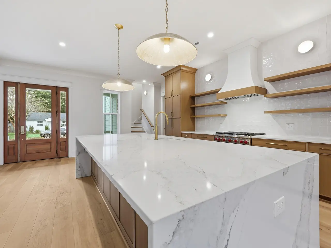• Veined-quartz countertops with waterfall detailing
