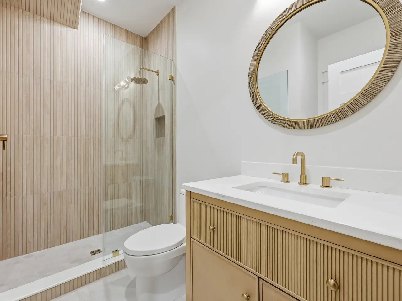 • Frameless glass shower with custom bench