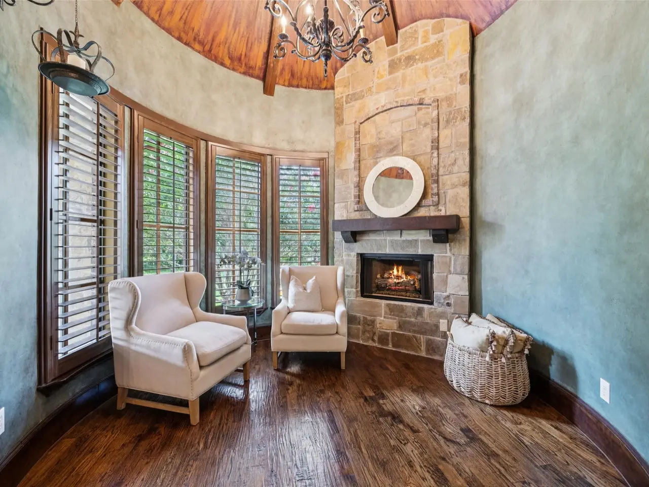 Welcome to your private resort-style retreat, nestled on nearly an acre with tranquil greenbelt views. This is the rare luxury estate you've been waiting for. Behind a stately iron gate, a grand courtyard with a cozy outdoor fireplace sets the tone for elegance and warmth. Step inside and be instantly captivated by soaring ceilings, exposed wood beams, and stunning architectural details that blend sophistication with comfort. Working from home becomes a pleasure in the gorgeous office, finished with bespoke woodwork and serene views. The kitchen is a dream with the 48-inch gas Thermador Range, large island for prep work, and a copper apron front sink. Retreat to the luxurious primary suite, a haven of tranquility with soaring ceilings, a spa-like bath featuring a fireplace, and dual closets. Six bedrooms offer privacy and comfort for everyone. Even your furry friends are pampered with a built-in dog wash station. Entertain in style in the first-floor media room, or sip a favorite vintage from your private wine cellar. This home blends indulgence and function, making everyday living feel like a vacation. Upstairs, the spacious game room features a built-in kitchenette, perfect for hosting, and second laundry roomone on each flooradds convenience for busy households. For those who crave wellness, the dedicated gym comes complete with a private sauna and cold plungeyour personal spa experience at home. Luxury abounds outdoors in your own private oasis with your sparkling pool and spa, built-in fire pit, outdoor kitchen complete with wood-burning pizza oven from Italy and a custom pickleball courtideal for active living and entertaining. Every inch of this home exudes thoughtful craftsmanship, luxurious comfort, and functionality designed for the modern lifestyle. This one-of-a-kind estate offers a rare opportunity to own a refined retreat with unmatched amenities in a breathtaking setting.