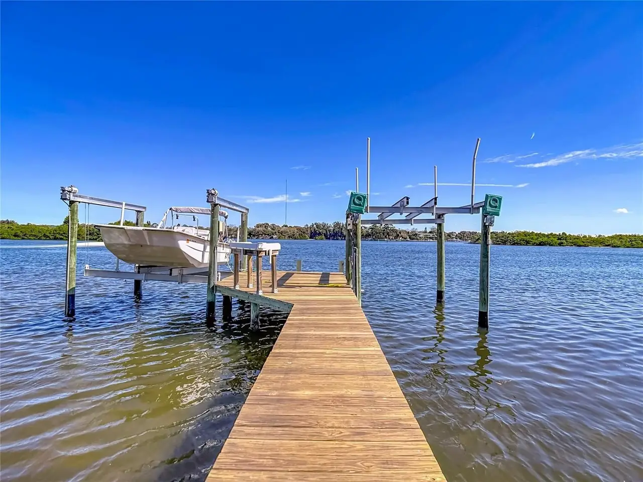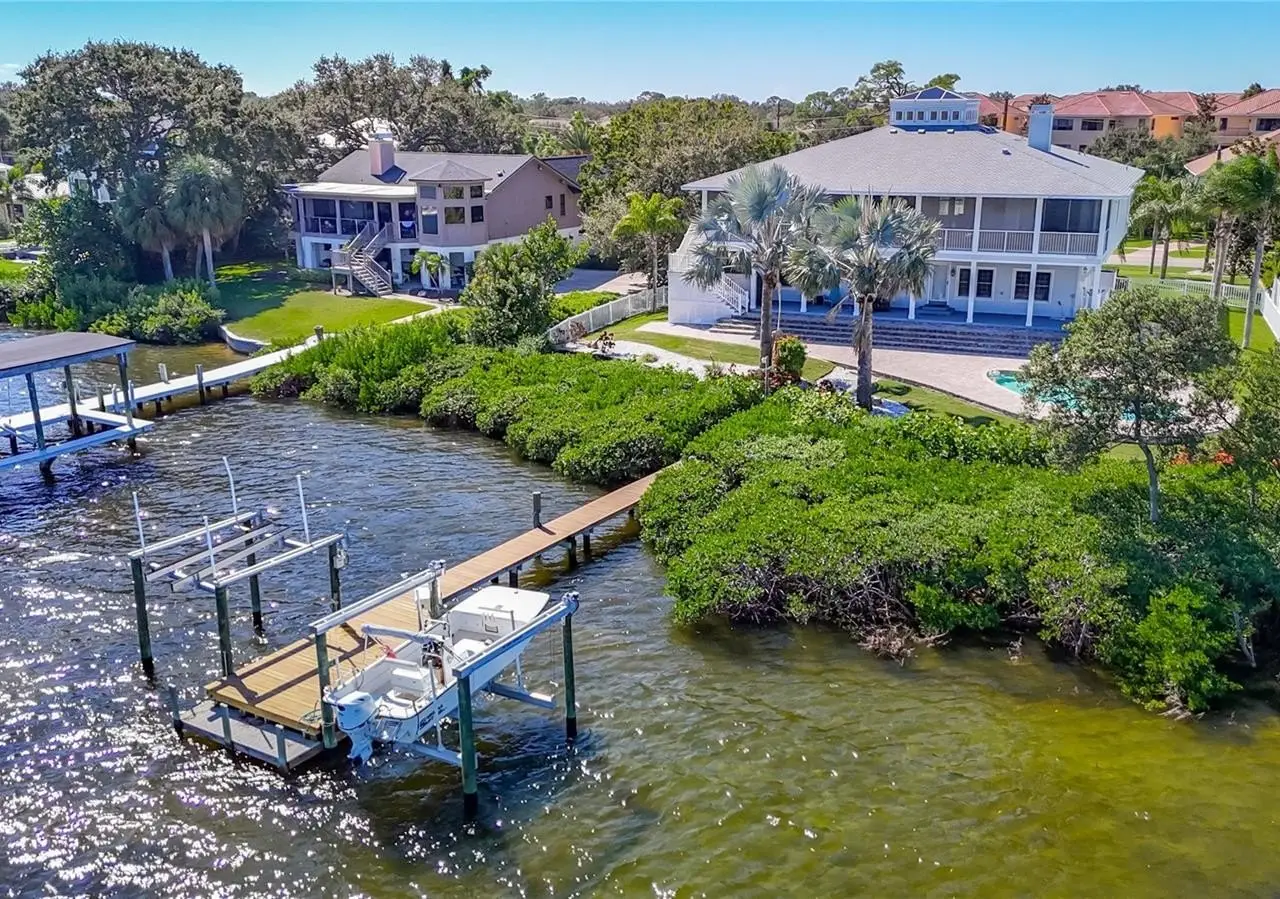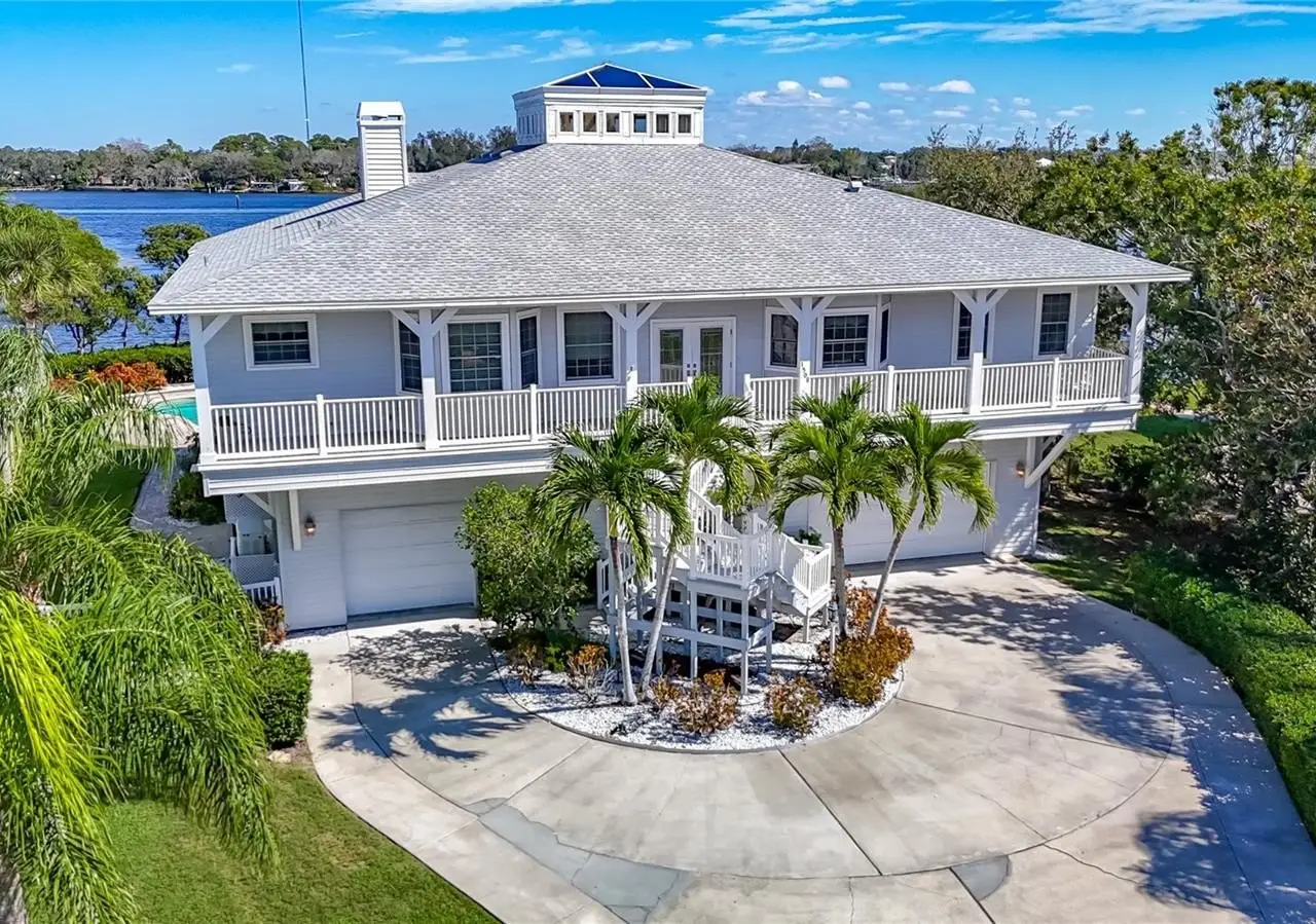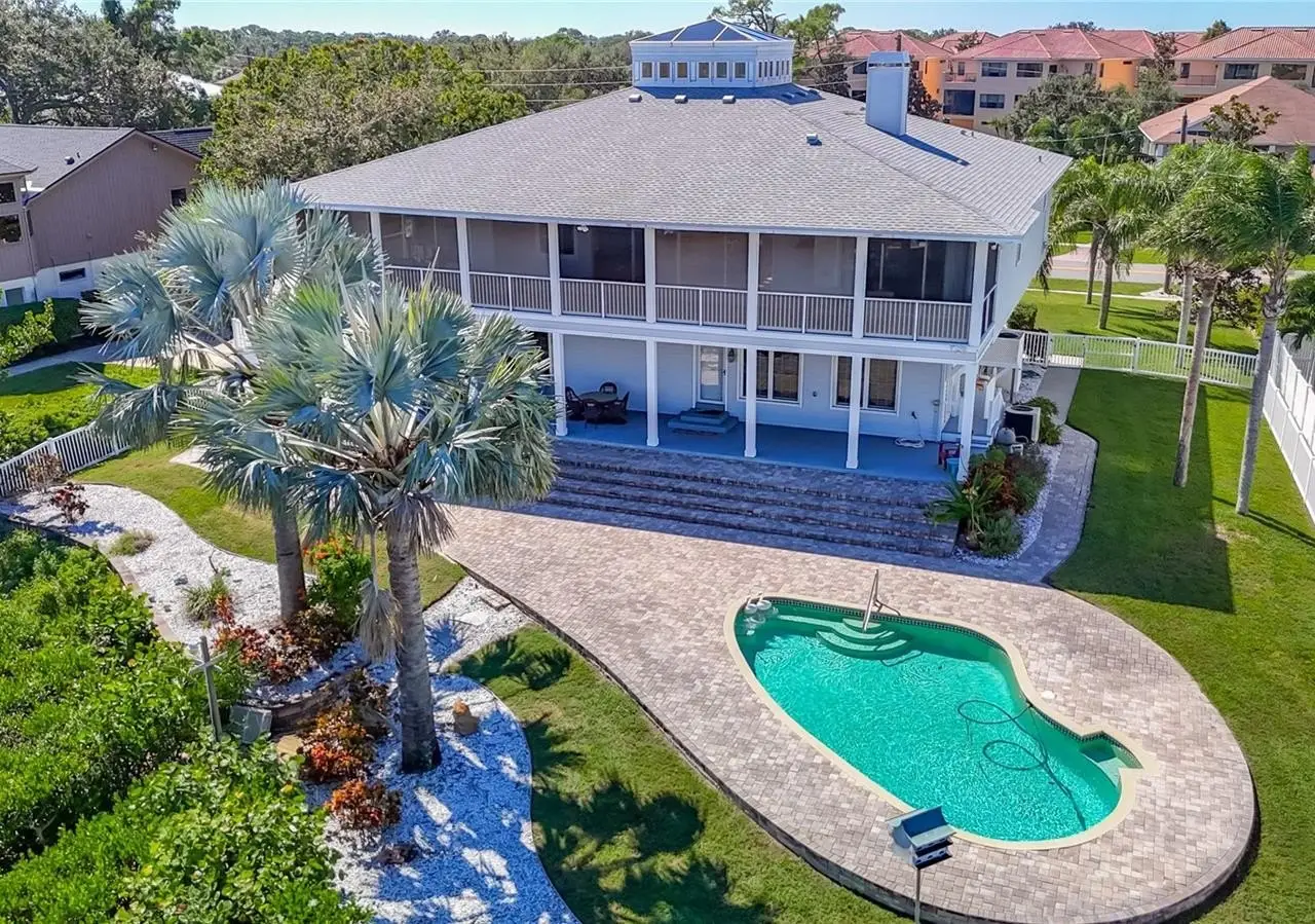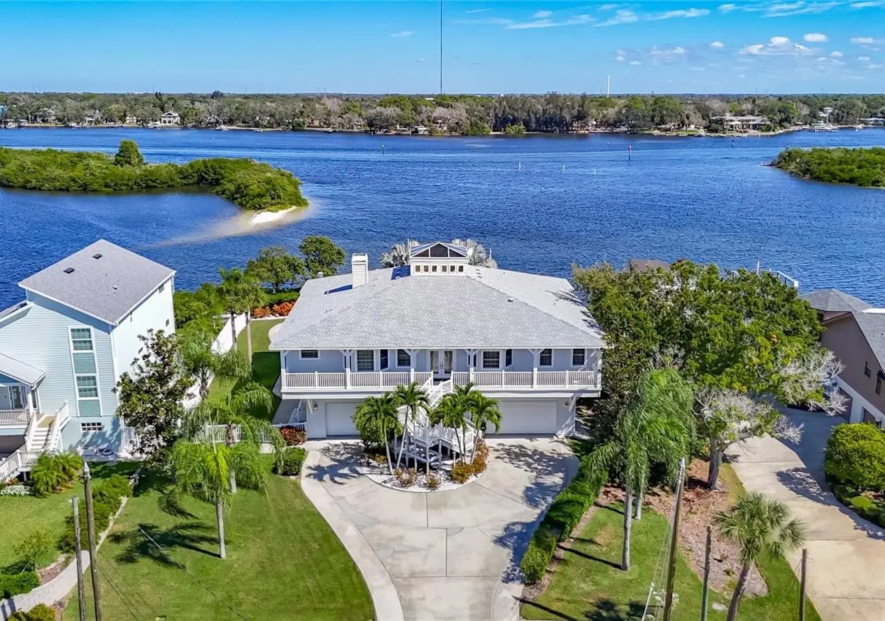 Discover a rare blend of coastal elegance, privacy, and modern design in this newly remodeled waterfront estate set on an elevated double lot along the scenic Anclote River. Built for both luxury living and resilience including a new roof in 2021, this home remained dry and undamaged through recent hurricanes, offering peace of mind and enduring value. Step inside to a bright, open-concept living area crowned by a lantern-style cupola that bathes the interior in natural light. Twelve-foot ceilings and expansive glass pocket doors create a seamless flow between indoor and outdoor living. The screened second-story veranda offers panoramic views of the tranquil cove and river—perfect for morning coffee or sunset gatherings by the cozy glass-front fireplace. The spacious chef’s kitchen is equipped with premium Café Series appliances, including an Induction Café Series cooktop and Advantium Café Series built-in ovens, along with a Sub-Zero refrigerator, farmhouse sink, and striking black granite countertops reminiscent of river rock that complement custom cabinetry. Retreat to the luxurious master suite upstairs, featuring an oversized his and hers closets and a fully remodeled spa-style bath with designer finishes. Downstairs, a private mother-in-law suite includes a full kitchen, making it ideal for guests or multigenerational living. The four-car garage provides ample storage for vehicles, water toys, and more, while an elevator offers effortless access to all levels. Step outside to enjoy lush tropical landscaping, a large paver sundeck, and a sparkling swimming pool overlooking the water. The new dock installed in 2021 features two lifts, fresh water and a fish cleaning station. Located just inside the mouth of the Anclote River, there is easy access to the Gulf, island beaches, and waterfront restaurants just minutes away. Whether entertaining or unwinding in your own sanctuary, this home offers the best of Florida waterfront living—light, space, privacy, and luxury in every detail. Additional upgrades include: new water heater 2023, reverse osmosis system with filter under kitchen Sink, and outdoor shed to convey.