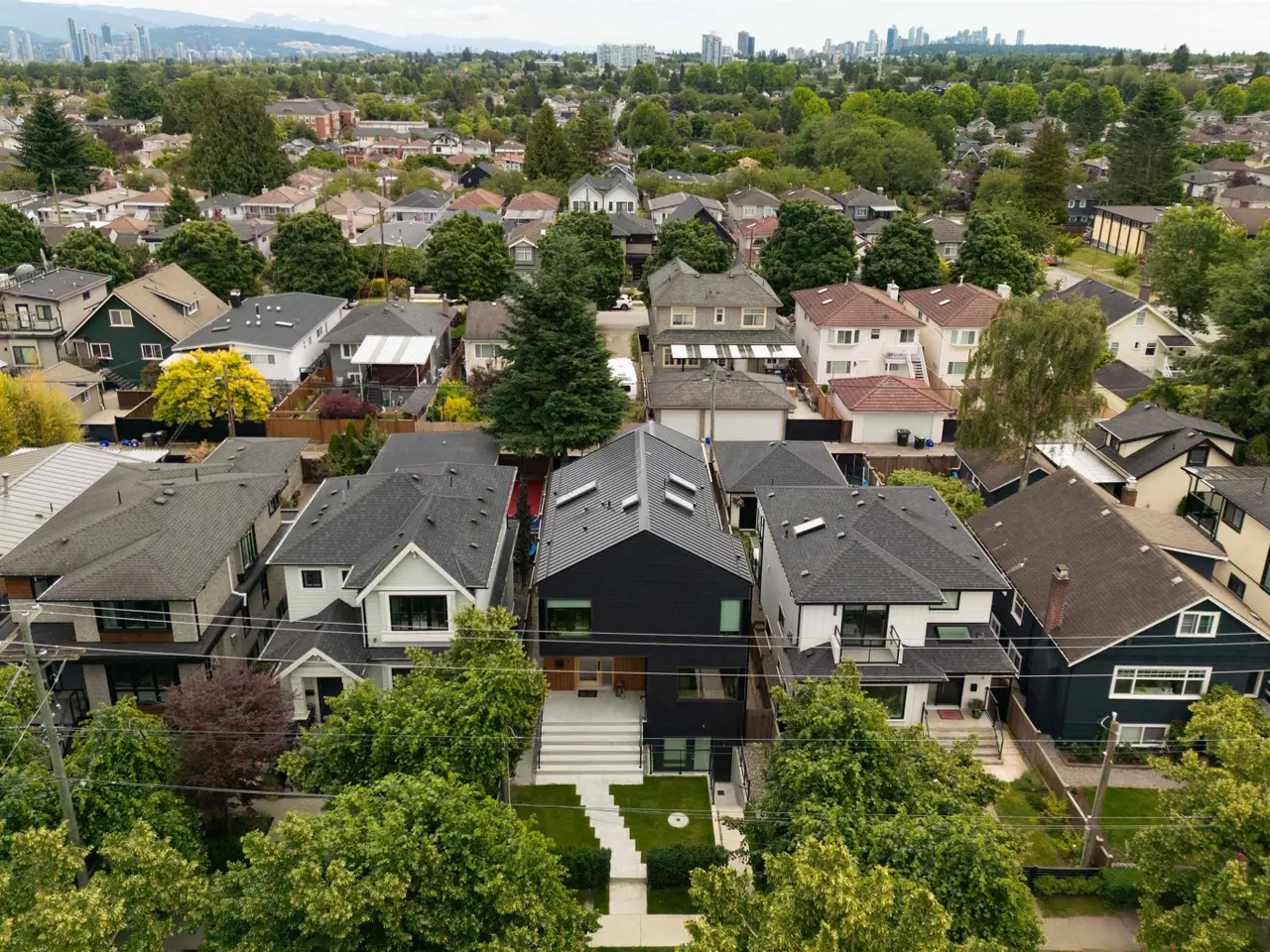 A refined family residence on one of Fraserhood’s most coveted tree-lined streets. Designed by Architrix & Enviable Designs, this modern Scandinavian home balances elegance with intention. Soaring overheight ceilings, walls of glass, and a 9x4 kitchen island anchor the open-concept main floor complete with integrated Fisher & Paykel appliances and tailored storage. Stunning and generously-sized office with custom millwork & large windows. Oversized lift-slide doors open to a lush private yard. Upstairs: 3 vaulted bedrooms, including a dreamy primary with spa ensuite and walk-in. Downstairs offers a rec room + wet bar and a flexible legal 2-bed suite. Steps to Grays Park. In McBride & Tupper catchments.