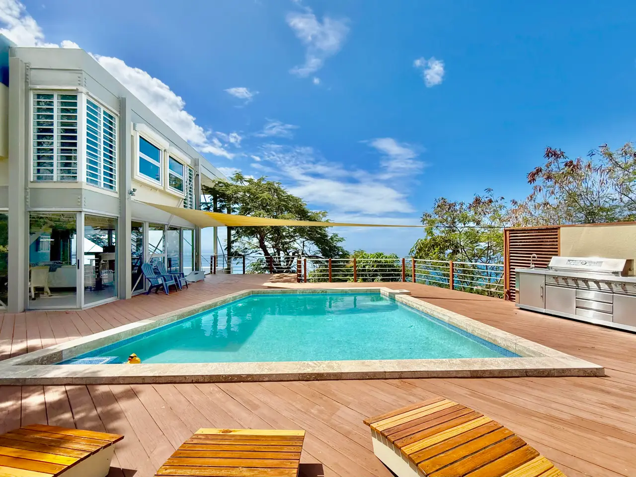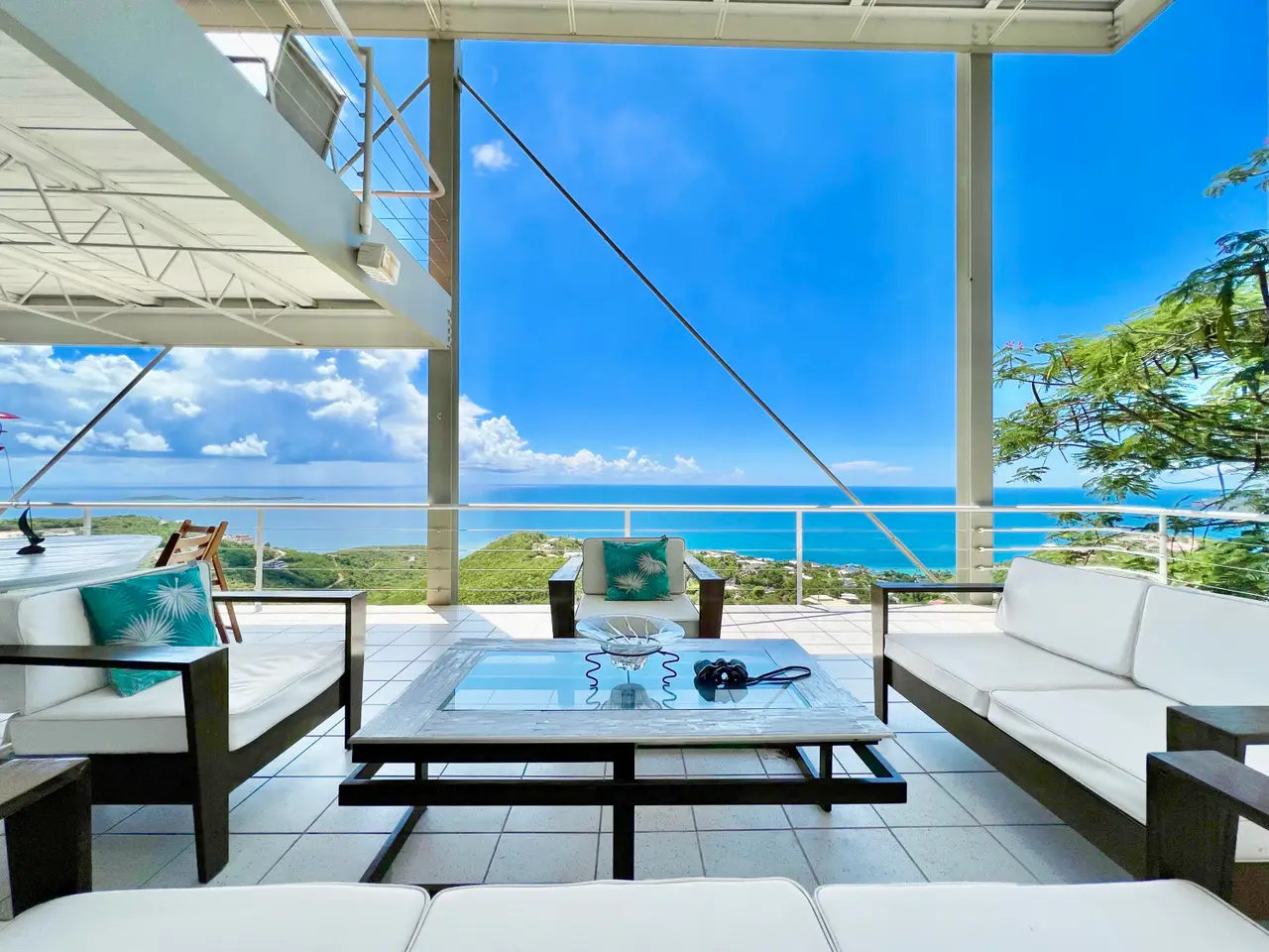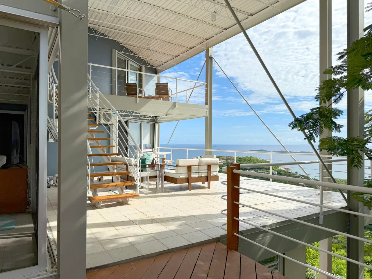 Sandbank is a beautiful contemporary architectural 5-Bedrooms 4-Baths home that sits on a 1.04 acre hilltop corner lot overlooking the Caribbean Sea with wide ocean views going from St James Island all the way to Puerto Rico. The main house is a 4 bed 3 baths (1 bedroom currently used as an office), and a 1 bed 1 bath apt. with its own driveway. Focusing on steel frame and glass, the home was designed by William Lane, architect of many landmarks in Florida, including the Miami Beach iconic Life Guard Towers. The property has an amazing covered deck with mesmerizing views and a large uncovered outdoor space with a nice size swimming pool and outdoor shower. Equipped with Solar panels, 2 Tesla batteries and a generator. Truly a one of a kind and perfect for family use or investment property