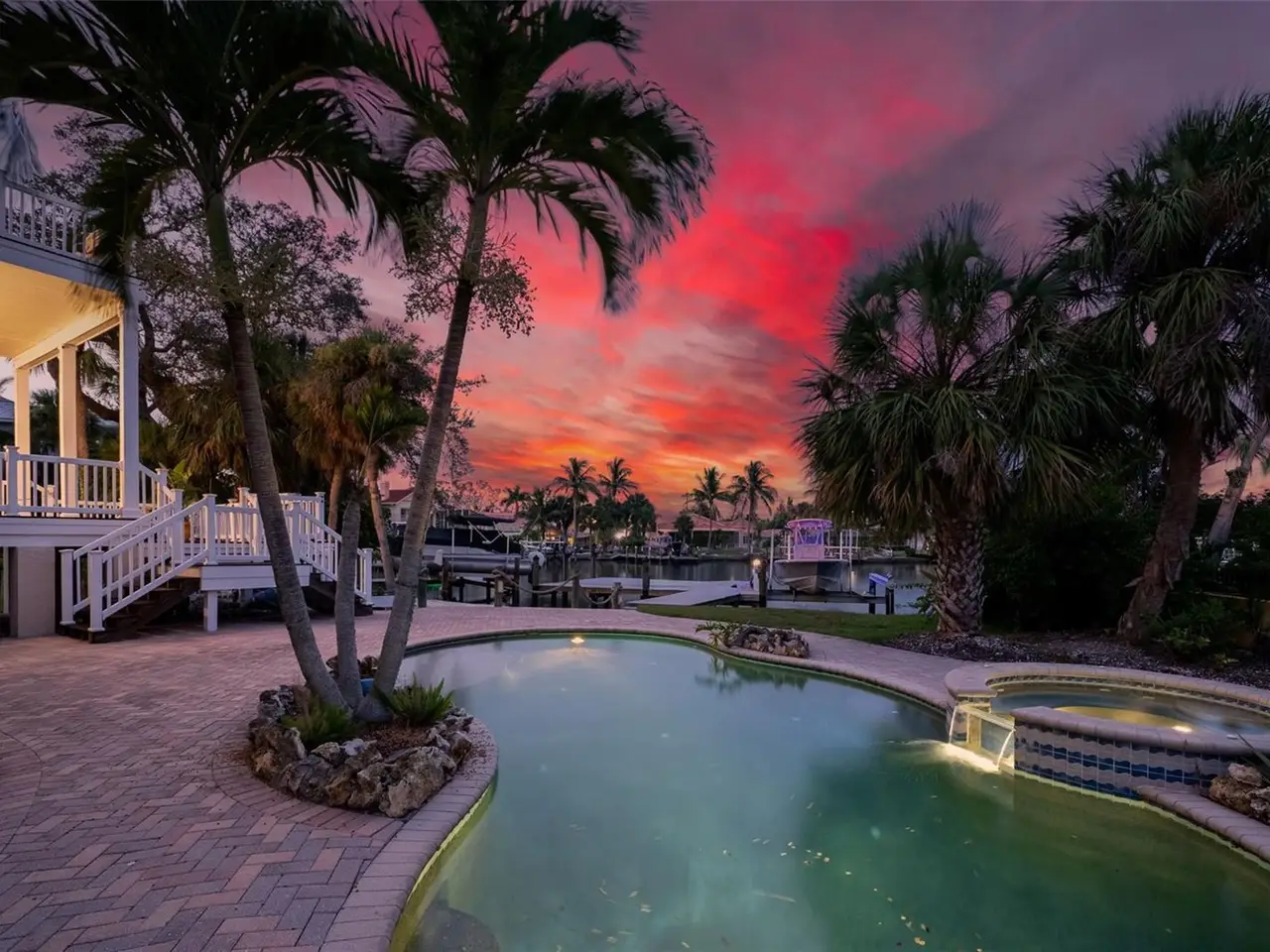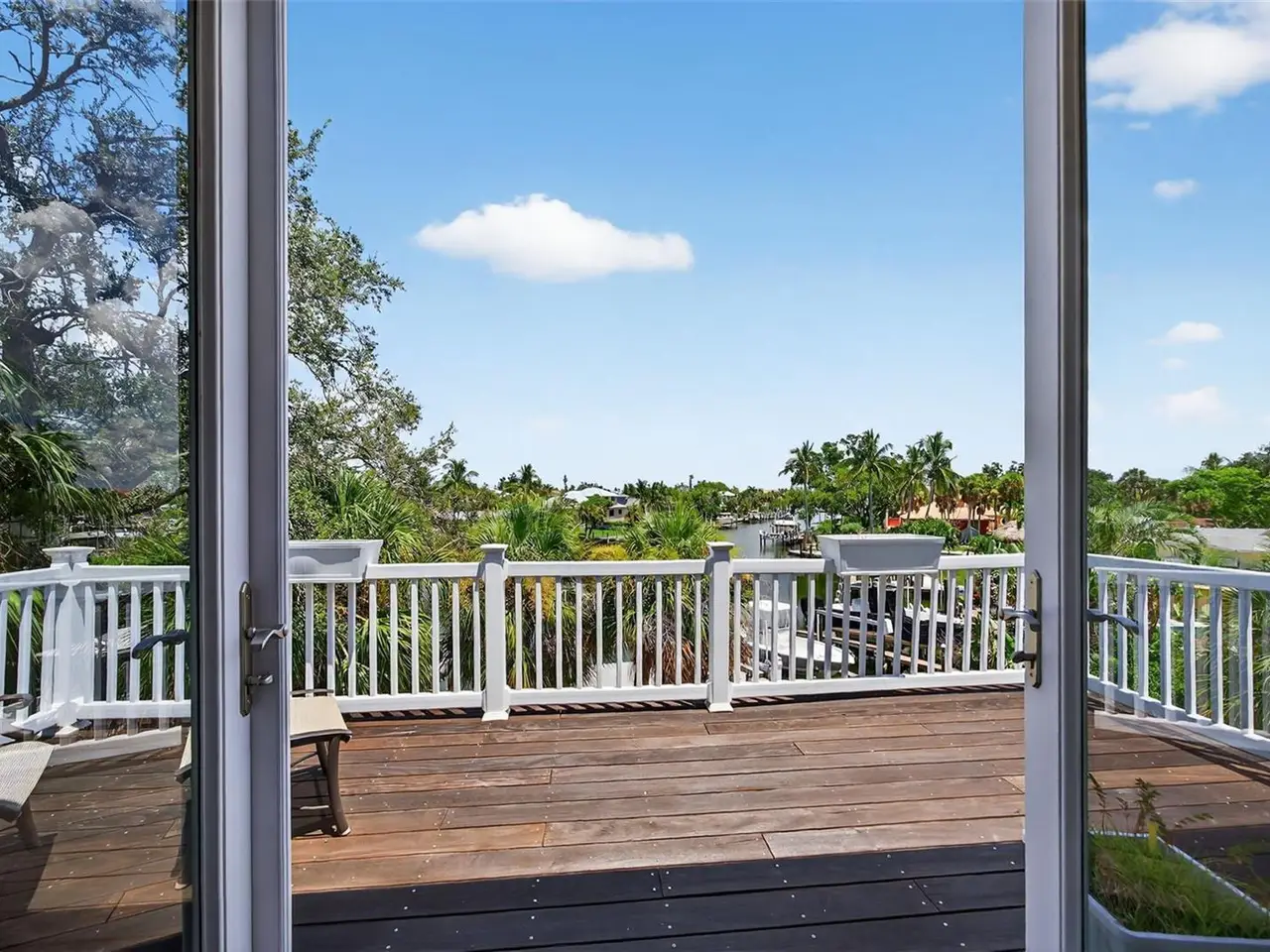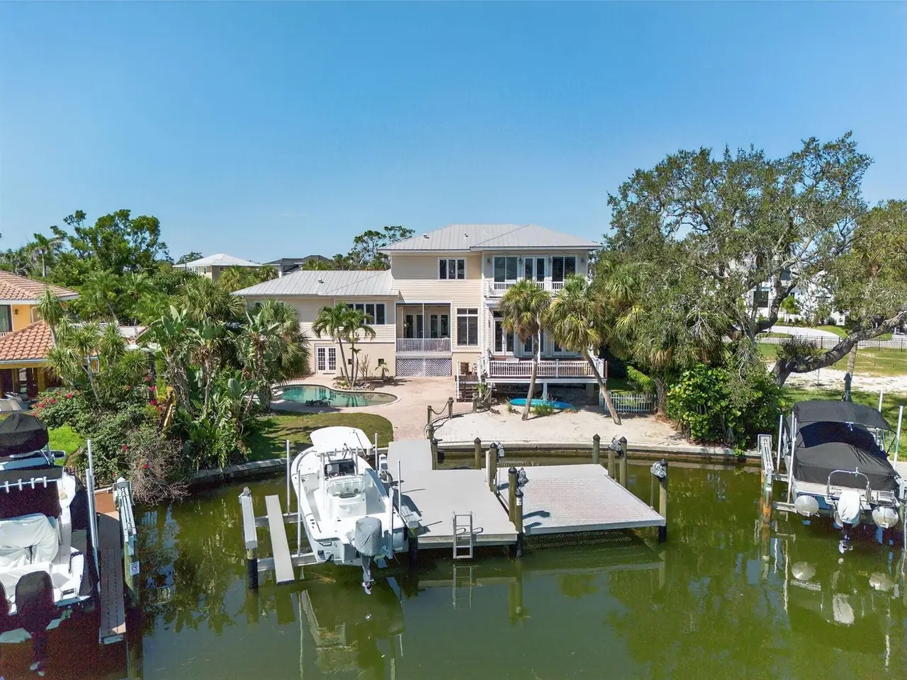 One or more photo(s) has been virtually staged. Exceptional Waterfront - North Siesta Key's Bay Island Boater's Dream - Exerience the best of coastal living in this elegant 4bd/4ba residence - just minutes to the Intracoastal Waterway. The home features a 2023 14,000lb dock/lift with electric and 3pnt moorage. Step inside a welcoming slate tile entry foyer to discover timeless quality design with Brazilian Ipe hardwood flooring throughout, hurricane rated windows and French doors and volume ceilings. At the heart of the home is a true cook's kitchen with Wolff Gas Range, built-in Sub-Zero stainless refrigerator, Fisher Paykel diswasher and soap-stone counter-tops. A true Chef's pantry, abundant cabinetry and full bar with wine refrigeration elevate the entertaining experience. The Primary Bedroom Suite, set in its own private wing, offers a tranquil retreat w/French Doors opening to a full private deck, perfect to enjoy sunrise and coffee; generous closet space and spa-inspired Bath; Guests Private wing and other rooms offer flexibility; French doors, automated window coverings, and architectural details create a refined and comfortable atmosphere. A full laundry room w/sink, office nook and mudroom are conveniently located off the 3-car garage. Outdoors, enjoy multiple covered decks, one with gas-fireplace for perfect evening waterfront ambiance; overlooking heated salt-water pool/spa; lush tropical landscape; Minutes to downtown Sarasota.