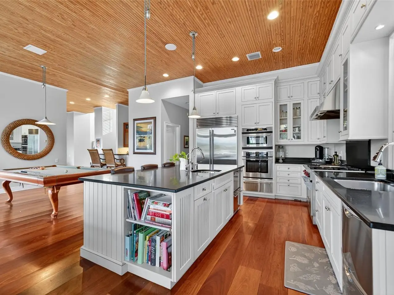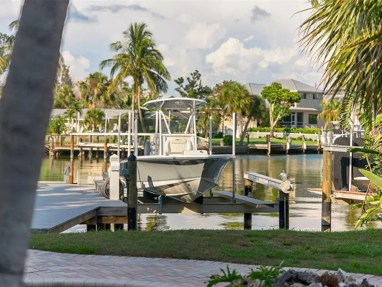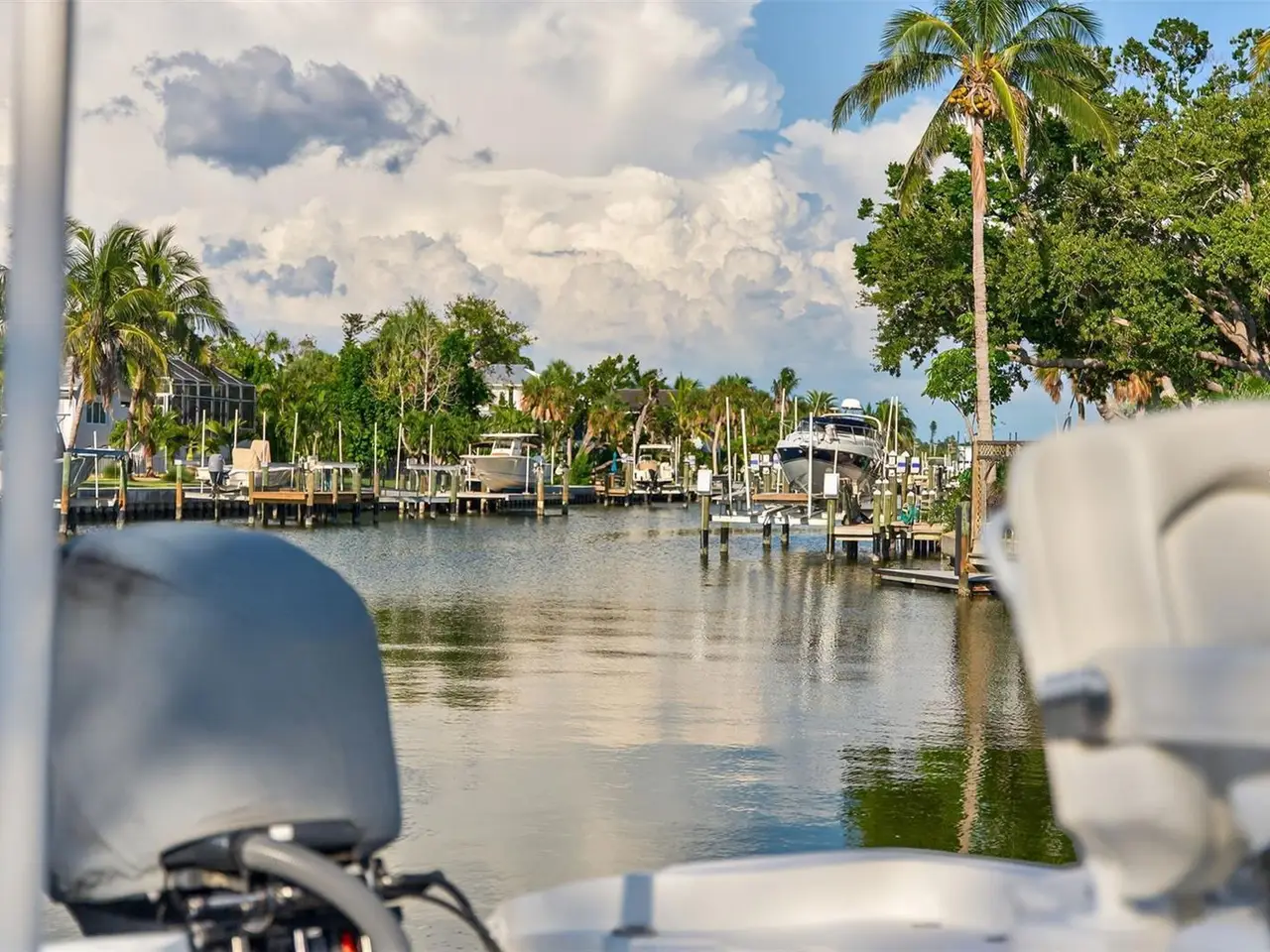 One or more photo(s) has been virtually staged. Exceptional Waterfront - North Siesta Key's Bay Island Boater's Dream - Exerience the best of coastal living in this elegant 4bd/4ba residence - just minutes to the Intracoastal Waterway. The home features a 2023 14,000lb dock/lift with electric and 3pnt moorage. Step inside a welcoming slate tile entry foyer to discover timeless quality design with Brazilian Ipe hardwood flooring throughout, hurricane rated windows and French doors and volume ceilings. At the heart of the home is a true cook's kitchen with Wolff Gas Range, built-in Sub-Zero stainless refrigerator, Fisher Paykel diswasher and soap-stone counter-tops. A true Chef's pantry, abundant cabinetry and full bar with wine refrigeration elevate the entertaining experience. The Primary Bedroom Suite, set in its own private wing, offers a tranquil retreat w/French Doors opening to a full private deck, perfect to enjoy sunrise and coffee; generous closet space and spa-inspired Bath; Guests Private wing and other rooms offer flexibility; French doors, automated window coverings, and architectural details create a refined and comfortable atmosphere. A full laundry room w/sink, office nook and mudroom are conveniently located off the 3-car garage. Outdoors, enjoy multiple covered decks, one with gas-fireplace for perfect evening waterfront ambiance; overlooking heated salt-water pool/spa; lush tropical landscape; Minutes to downtown Sarasota.